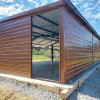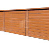 Plechová garáž 18×5 m – 6x výklopná brána – 2x dvere – rýna okapová – imitácia dreva – spád dozadu ST234