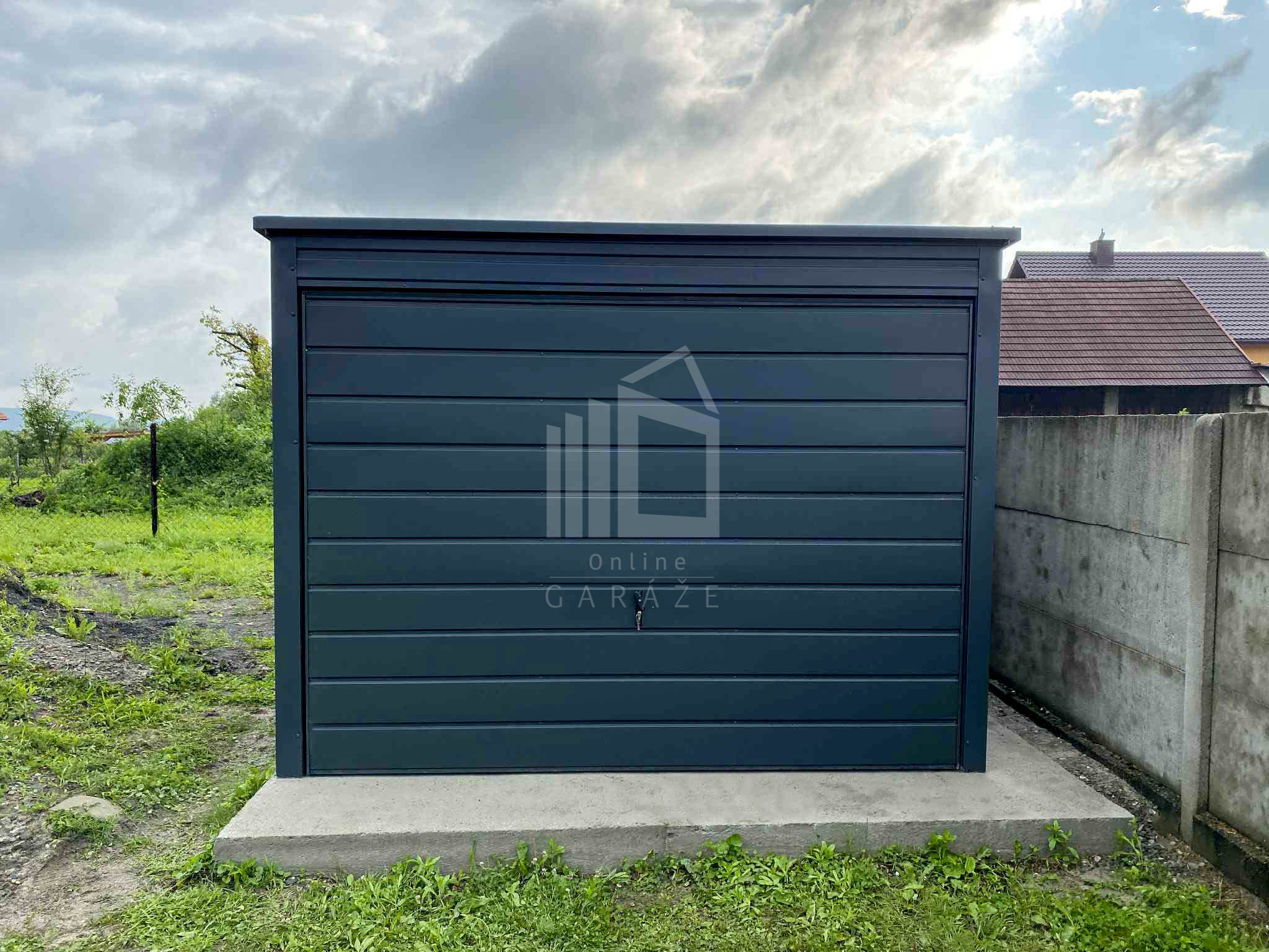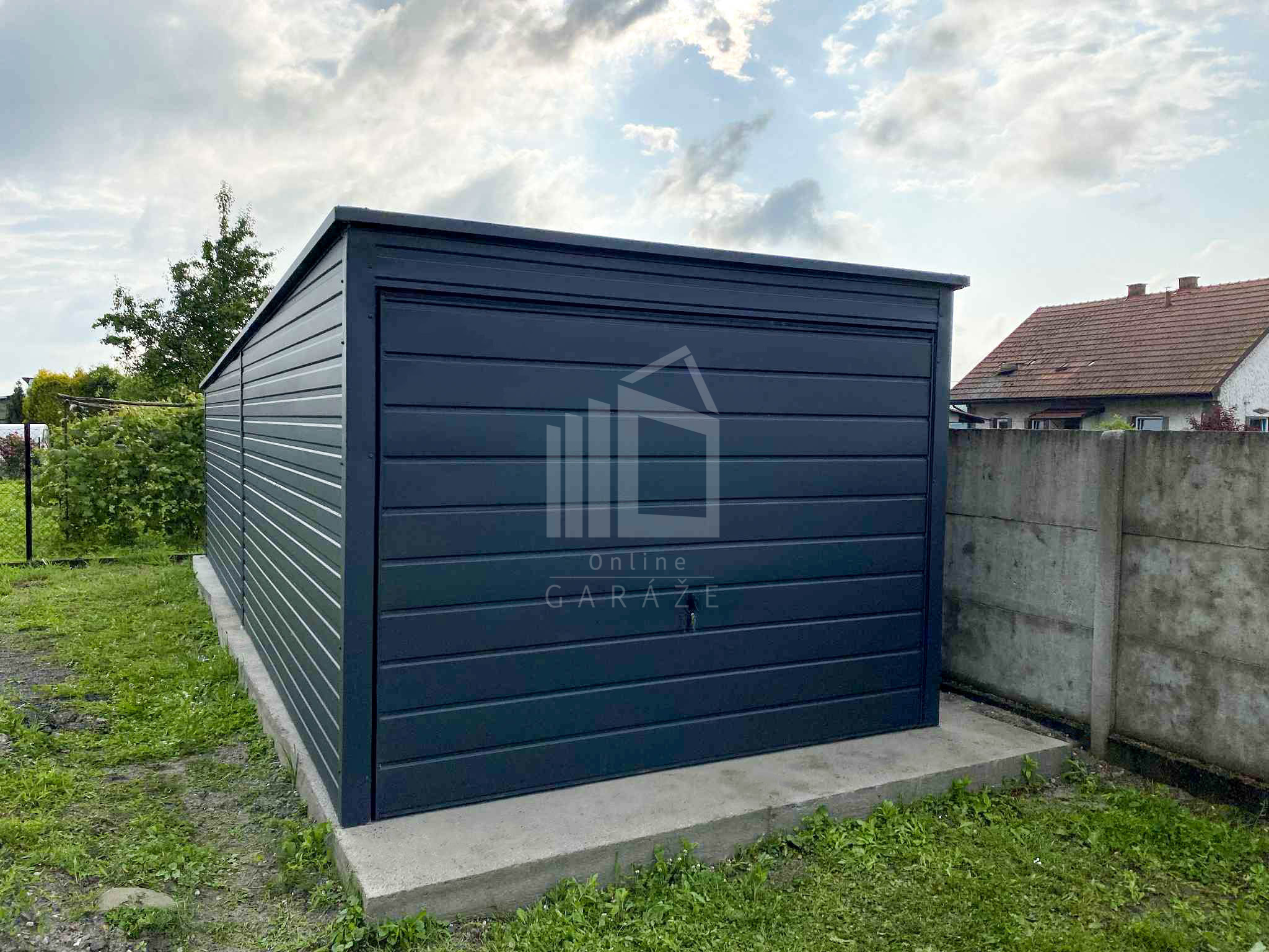 Plechová garáž 3x6m – výklopná brána – antracit – strecha spád dozadu PLG161
