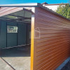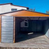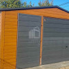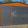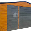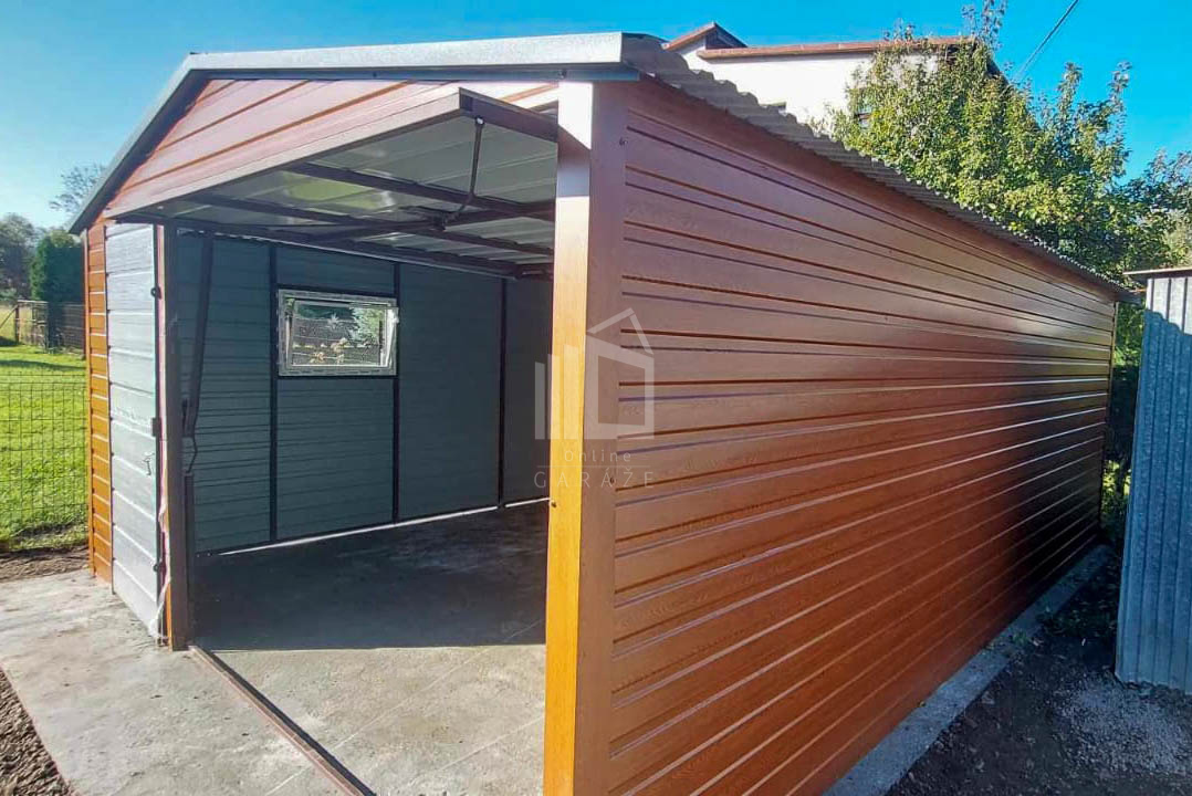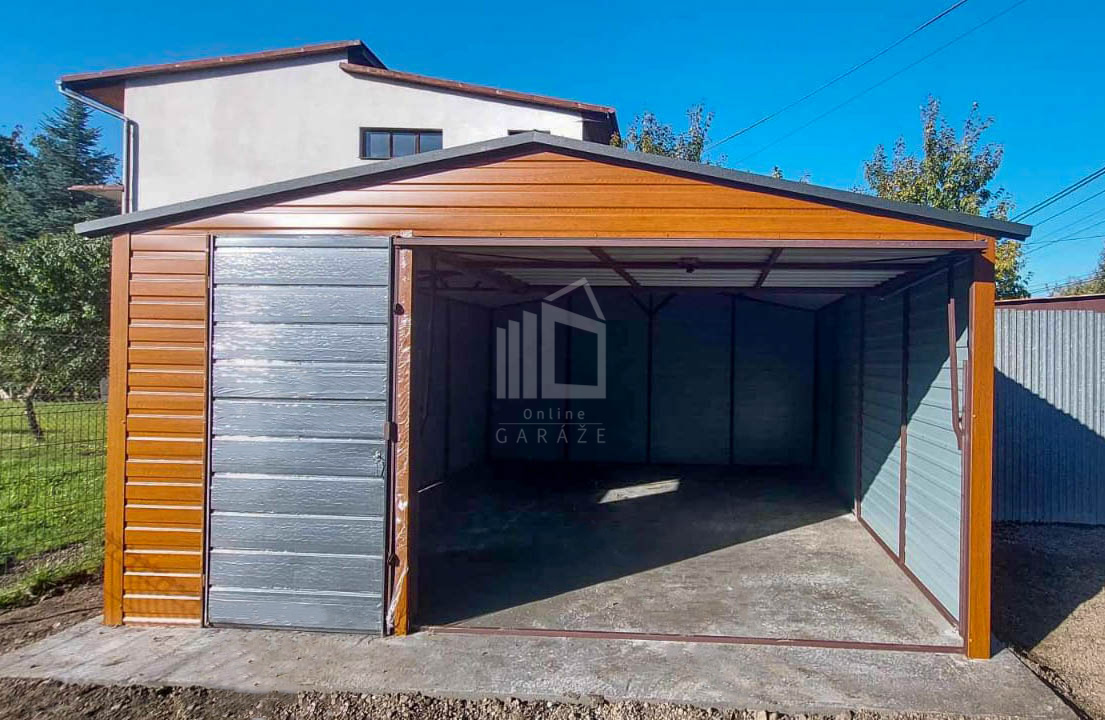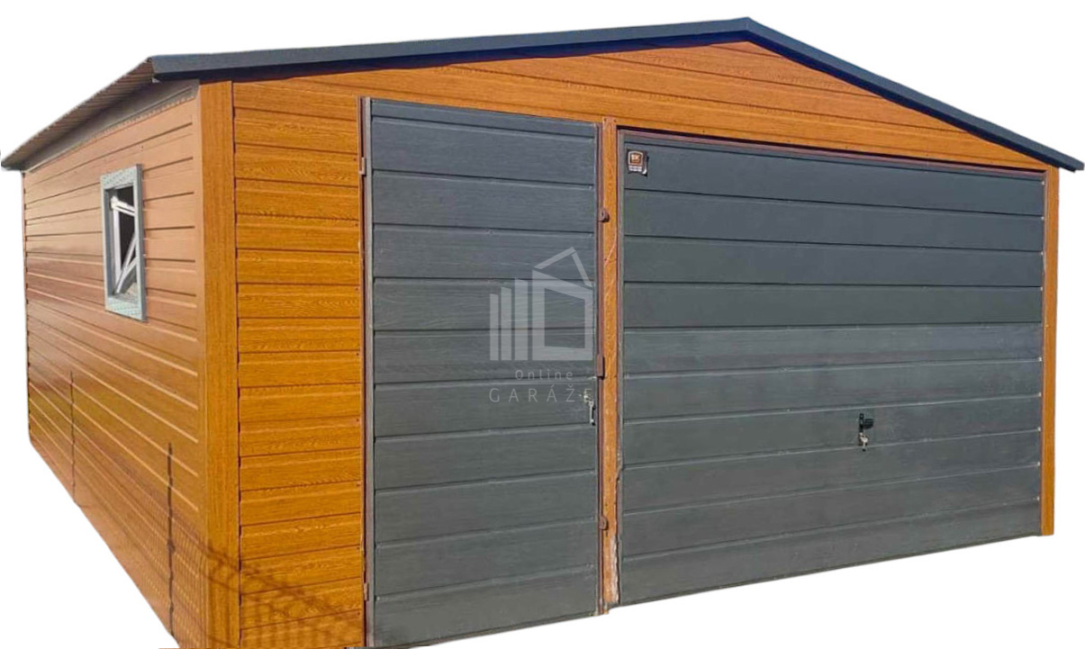 Plechová garáž 5×5 – brána + dvere + okno – zlatý dub imitácia dreva – strecha sedlová PLG118