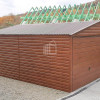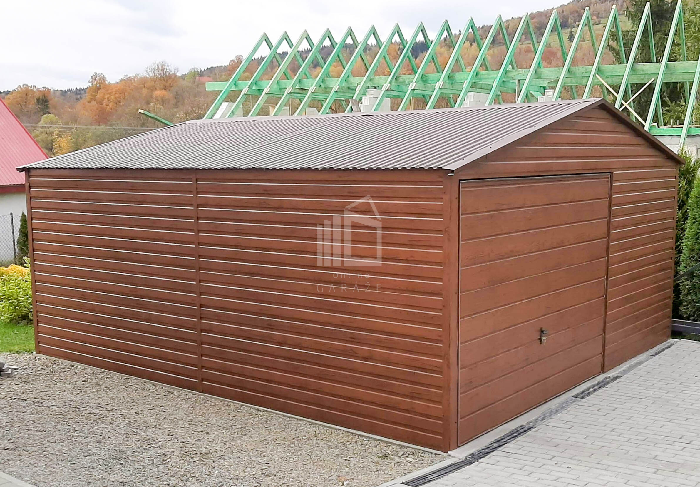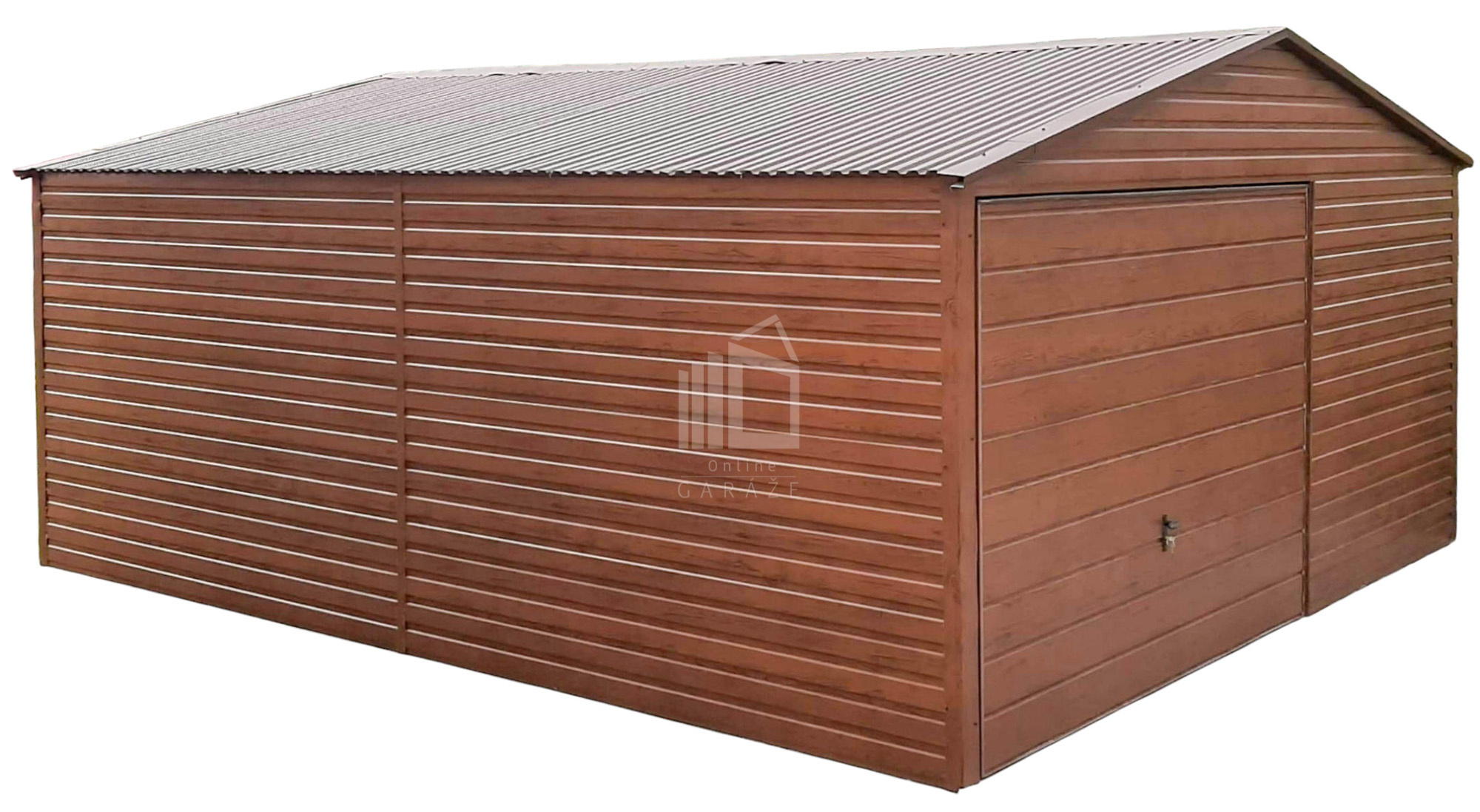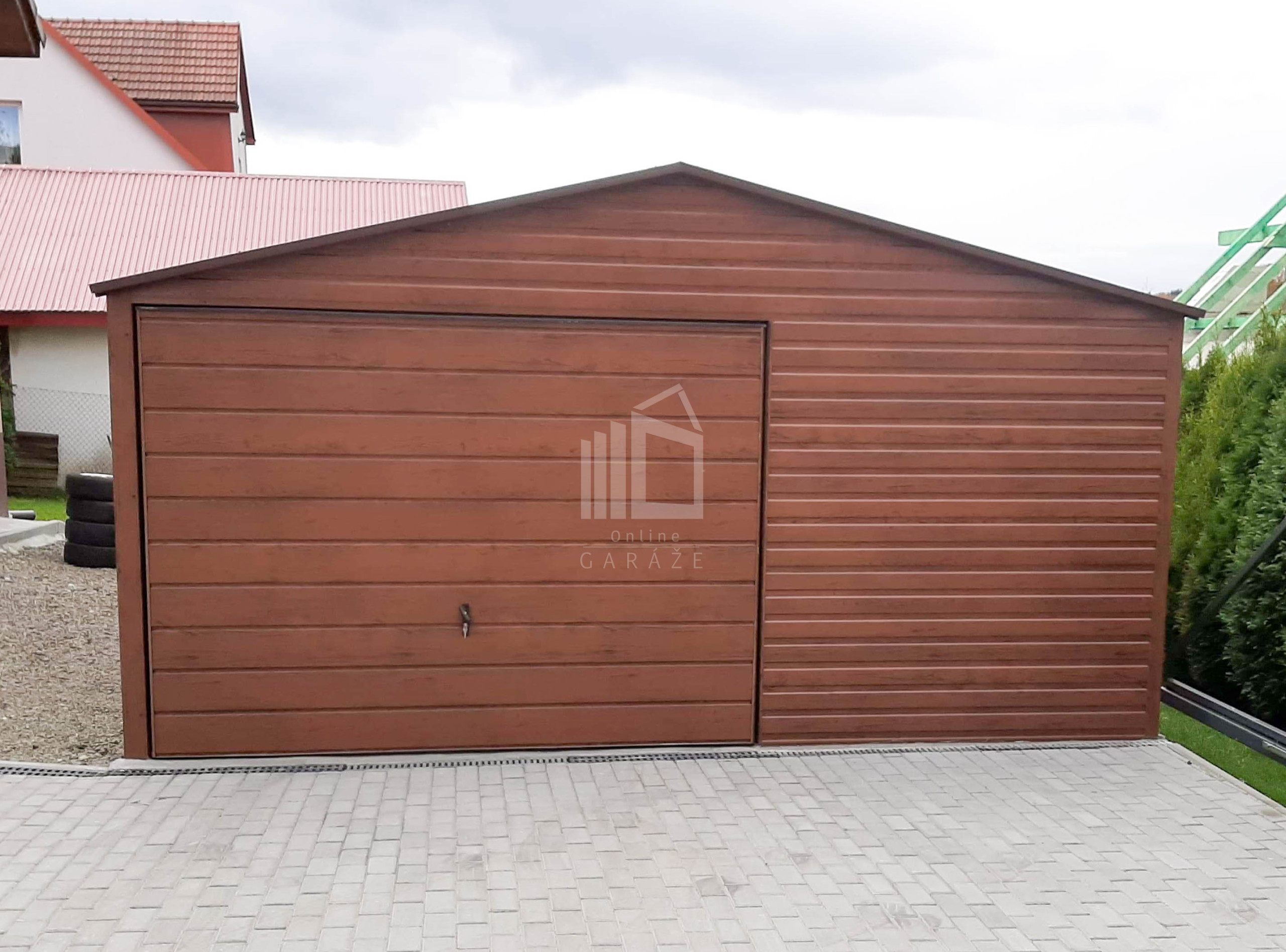 Plechová garáž 5×5 – výklopná brána imitácia dreva – strecha sedlová PLG117