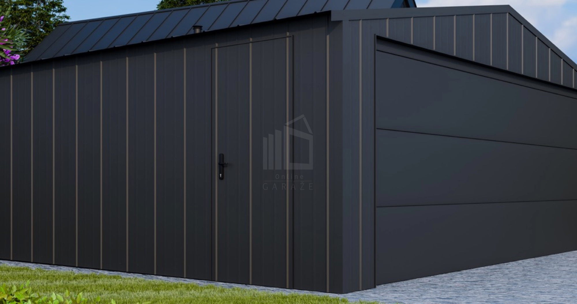 Plechová garáž 6×4 – sekčná brána – dvere – falcovaný plech – strecha dvojspádová (sedlová) TS1088