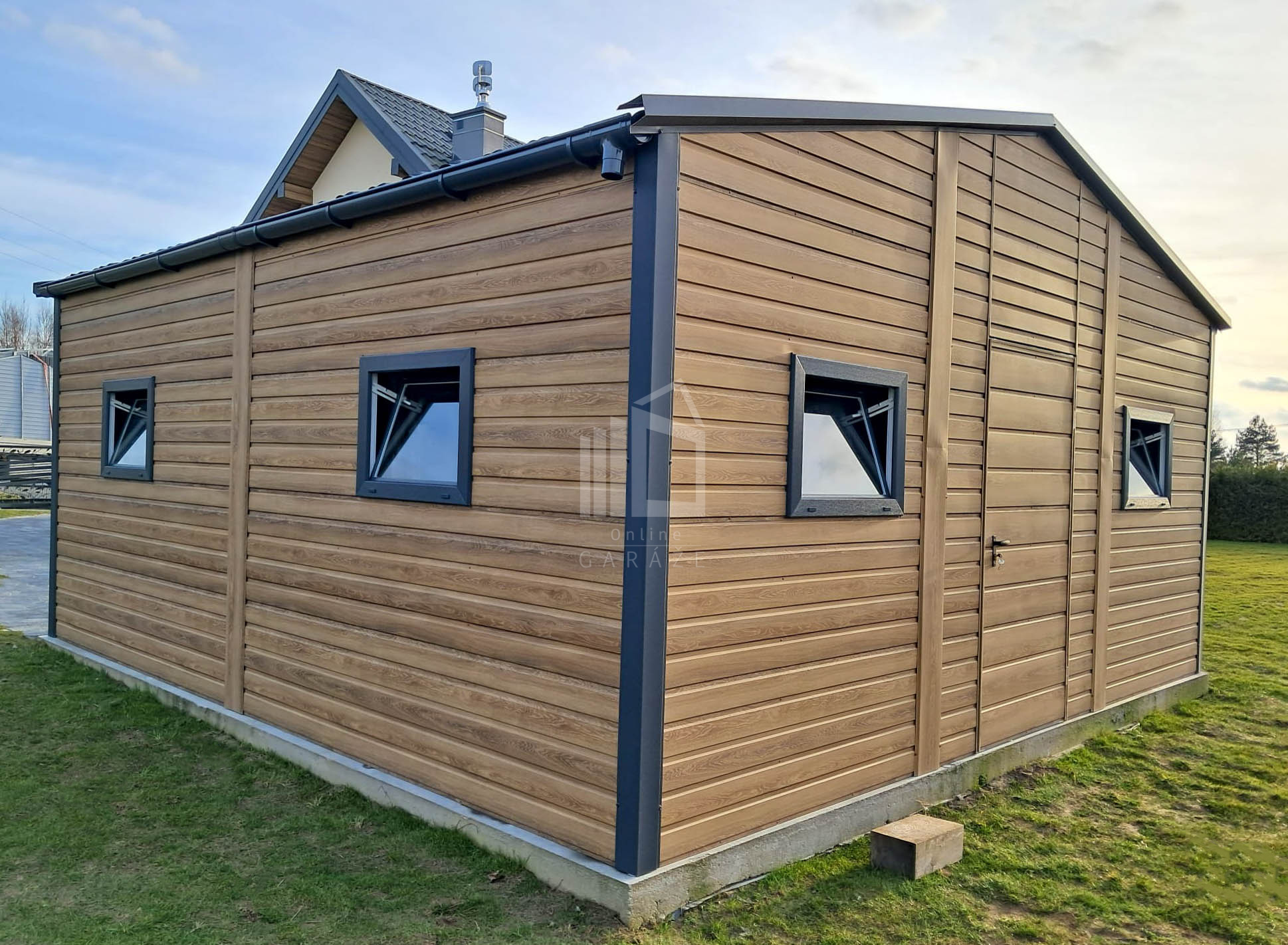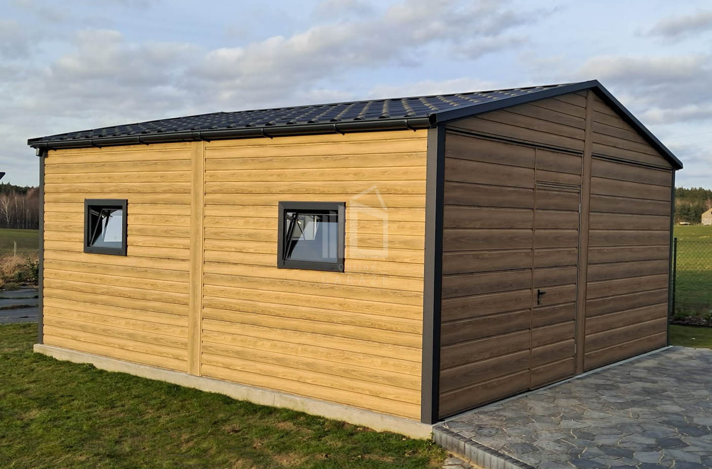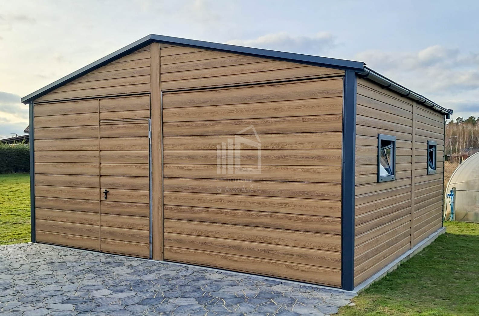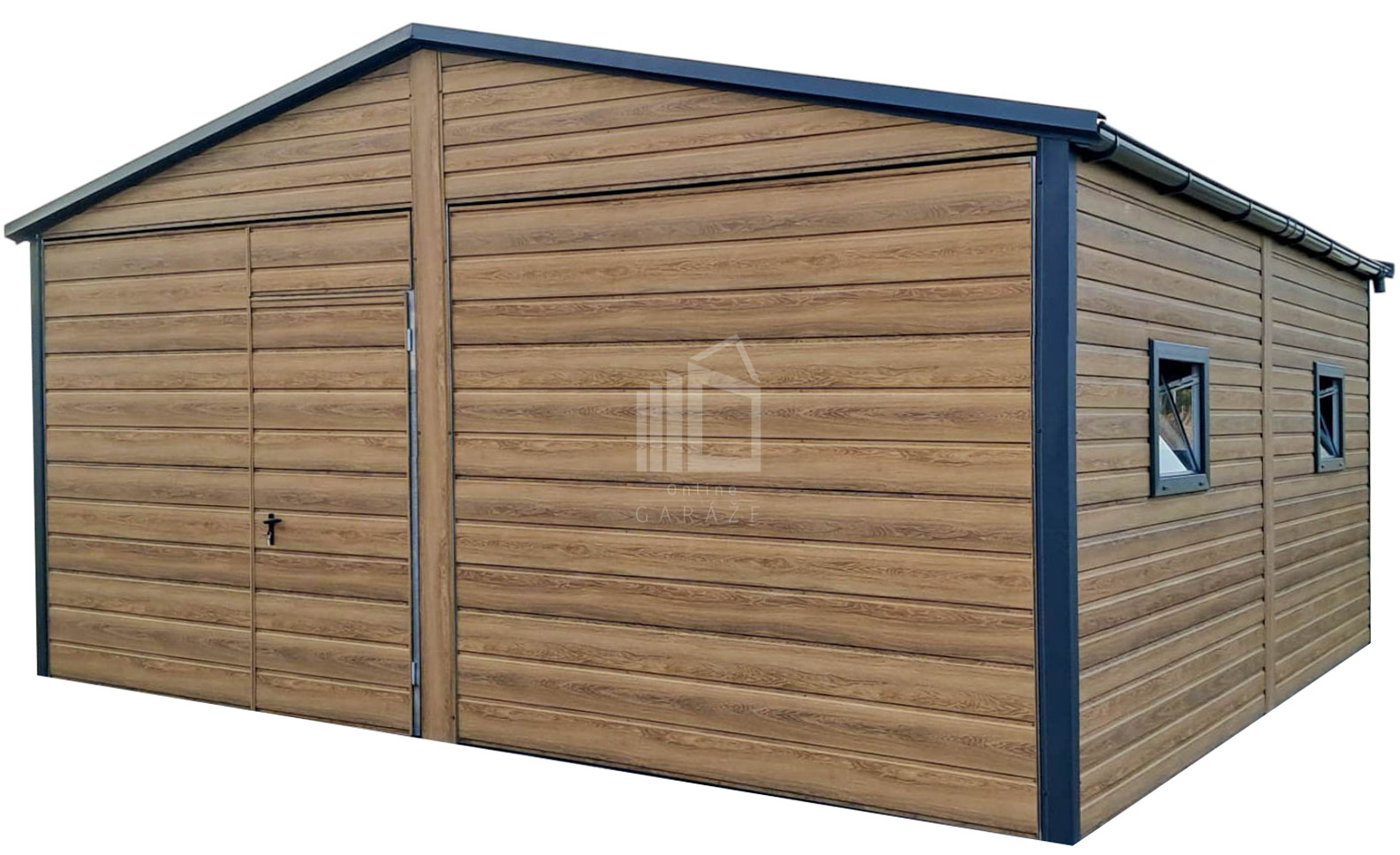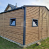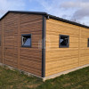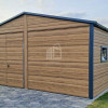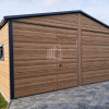 Plechová garáž 6×5,8 – 2x výklopná brána – 6x okno PVC – 2x dvere – rýna okapová + zvod vody nadol – škridľoplech – Winchester – imitácia dreva – strecha sedlo TS1066