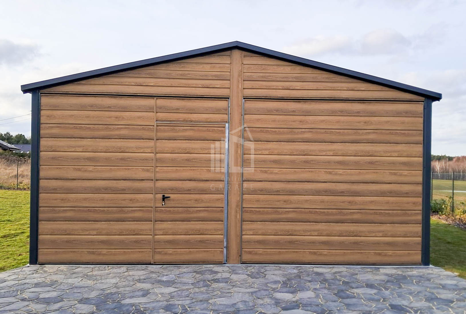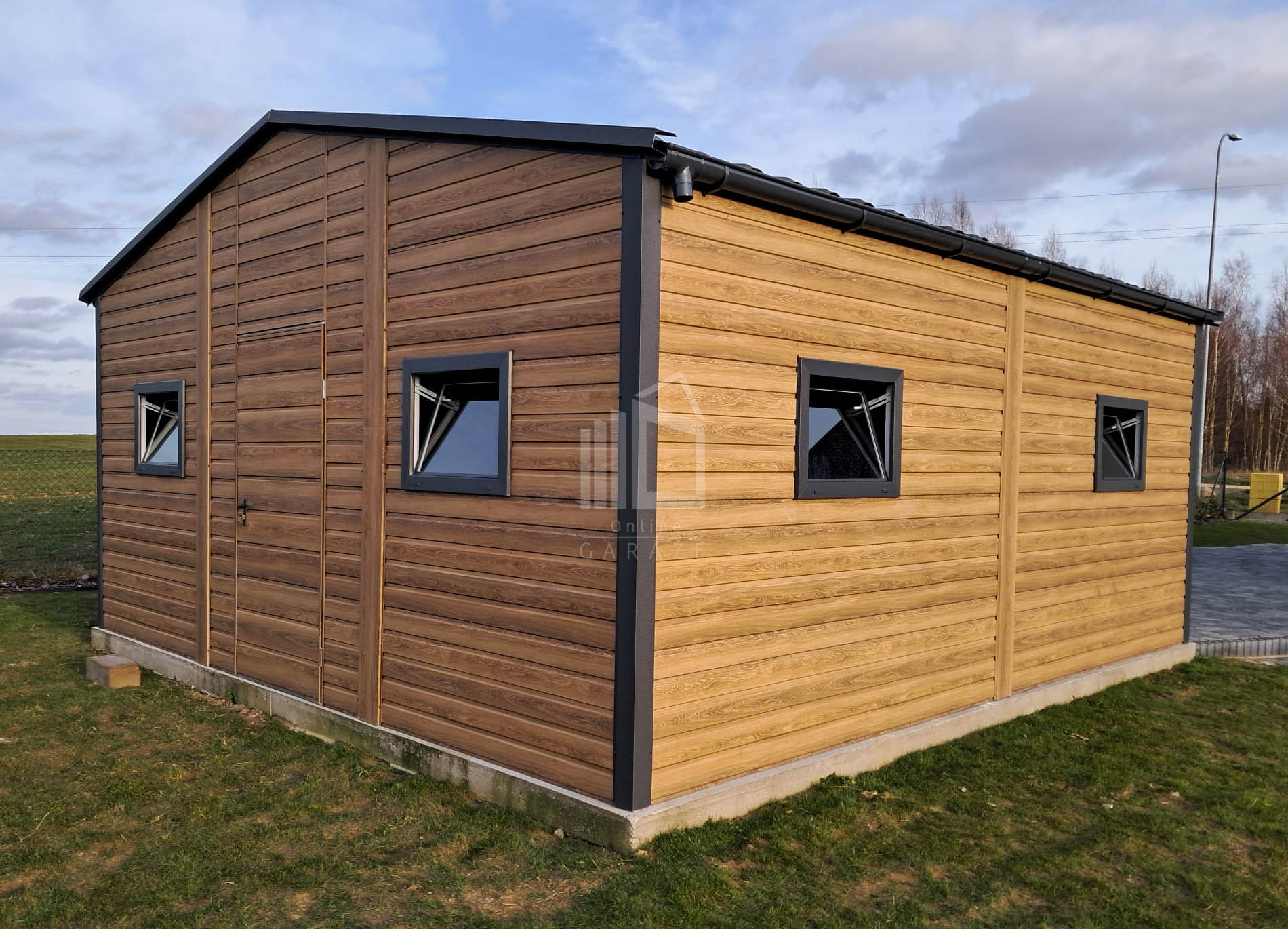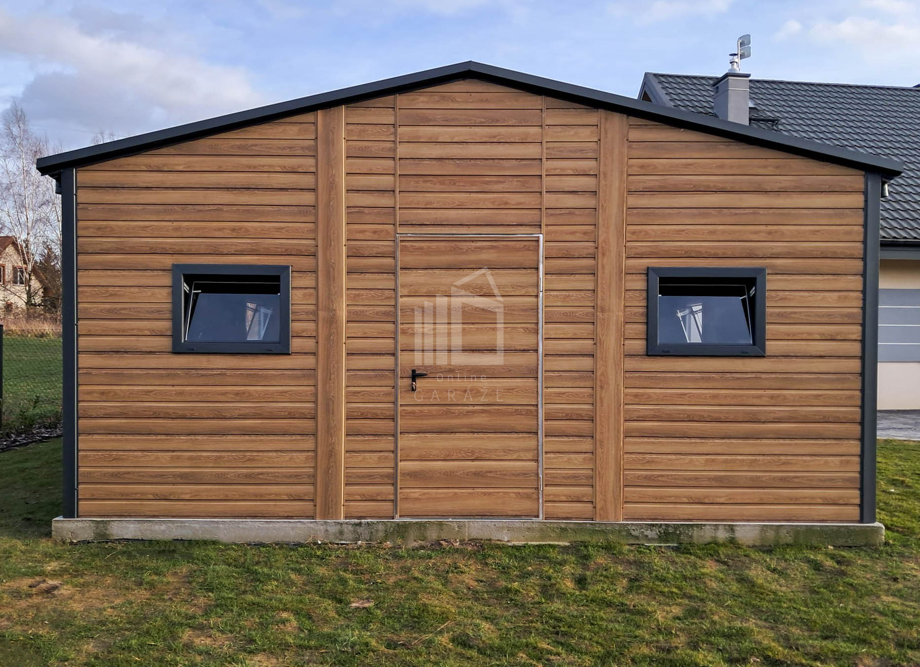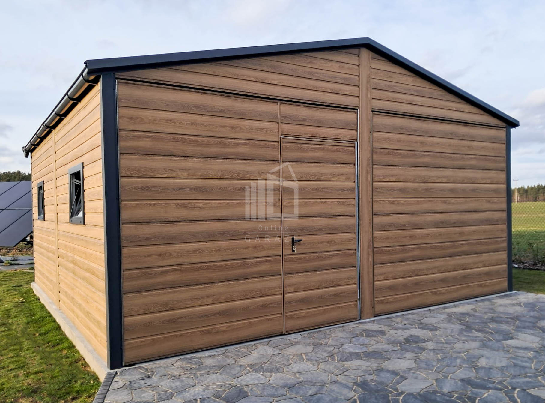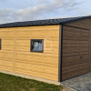 Plechová garáž 6×5,8 – 2x výklopná brána – 6x okno PVC – 2x dvere – rýna okapová + zvod vody nadol – škridľoplech – Winchester – imitácia dreva – strecha sedlo TS1066
