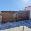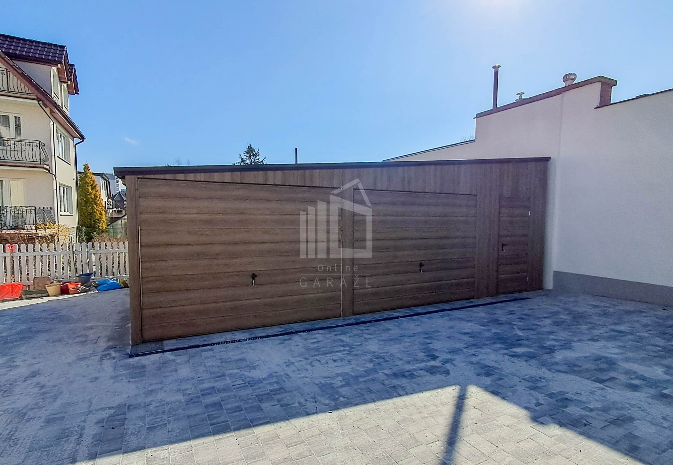 Plechová garáž 8x6m – 2x brána – okno – dvere – tmavý orech – imitácia dreva – strecha so spádom do boku – rýna okapová + zvod vody nadolTS1072
