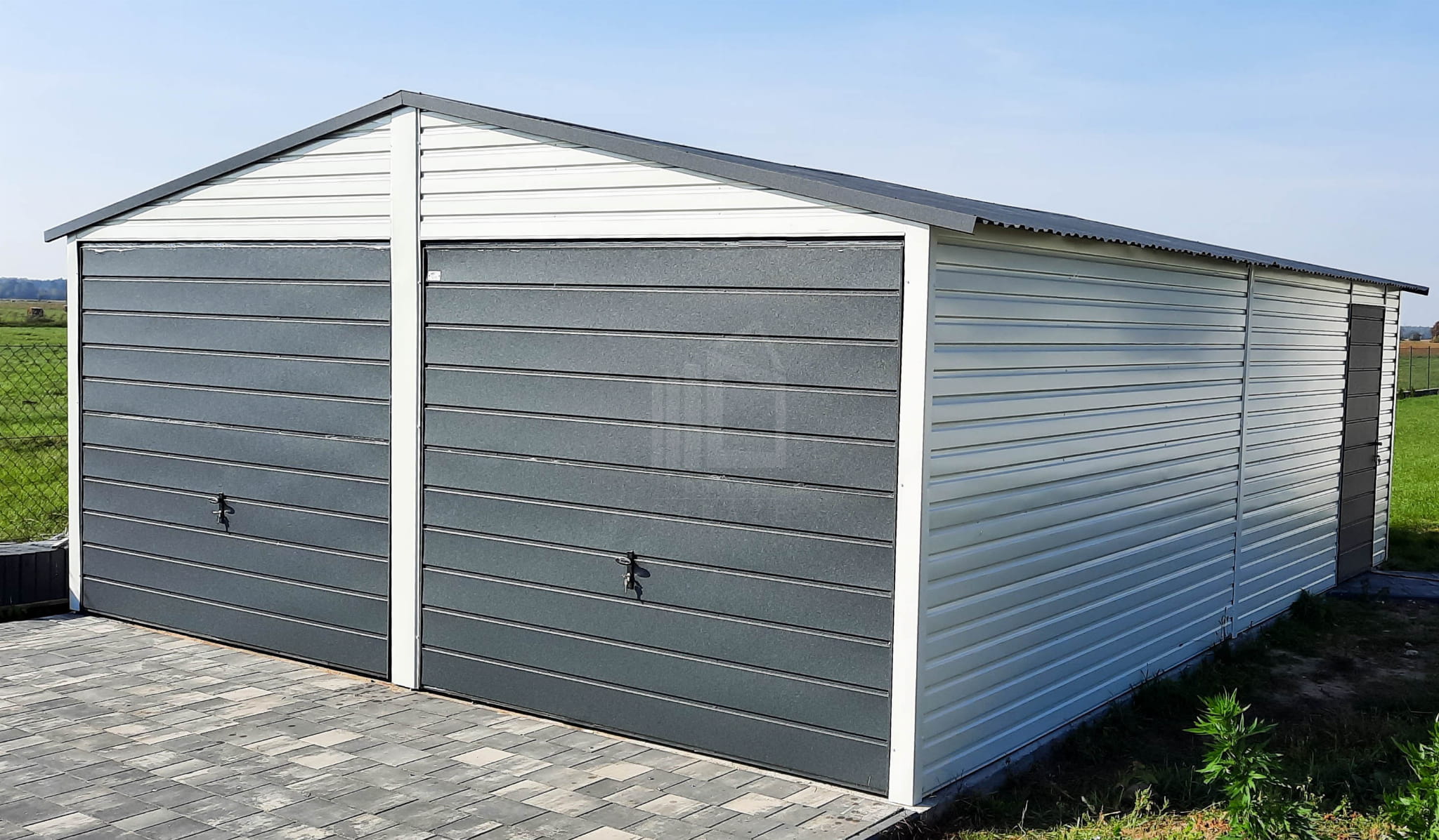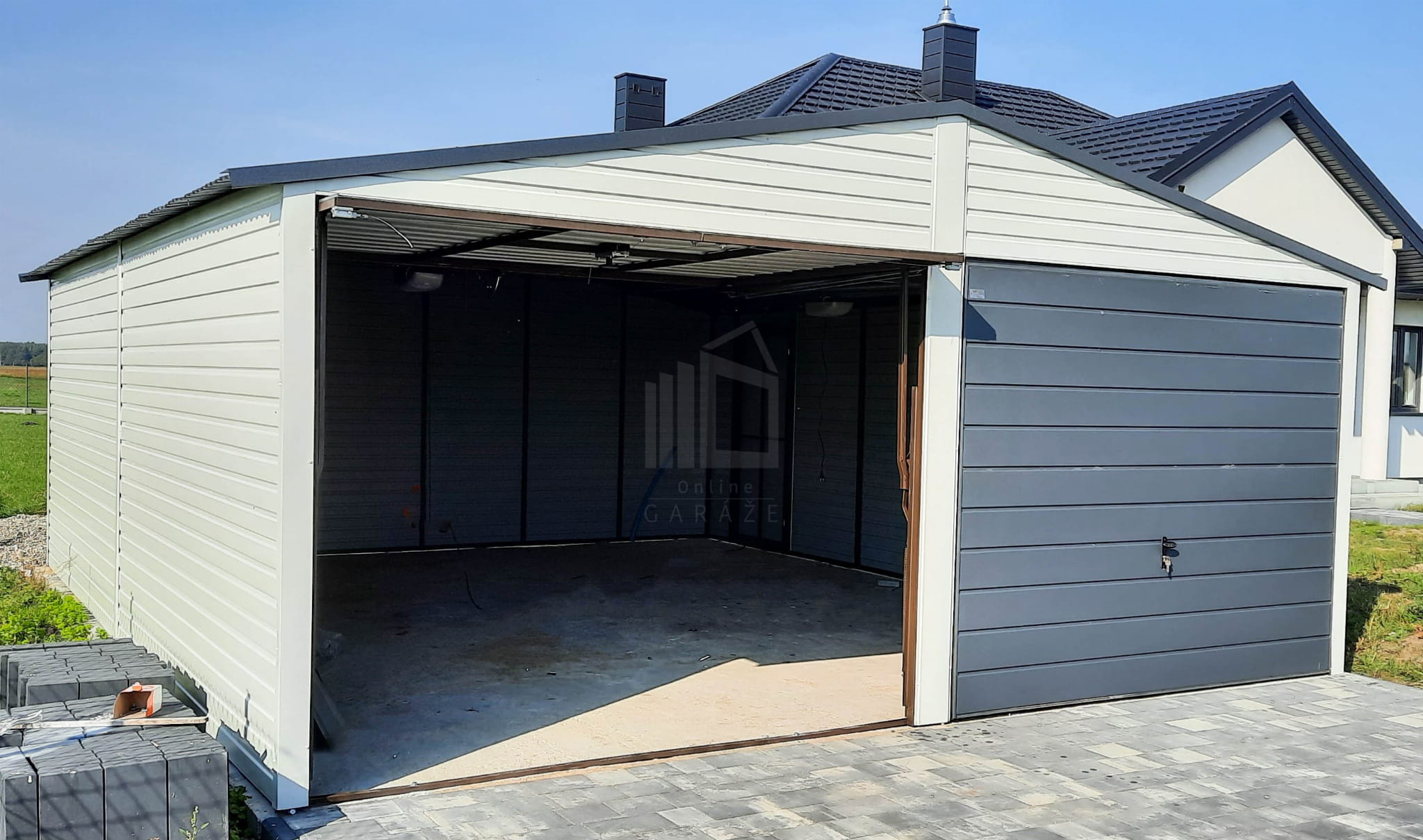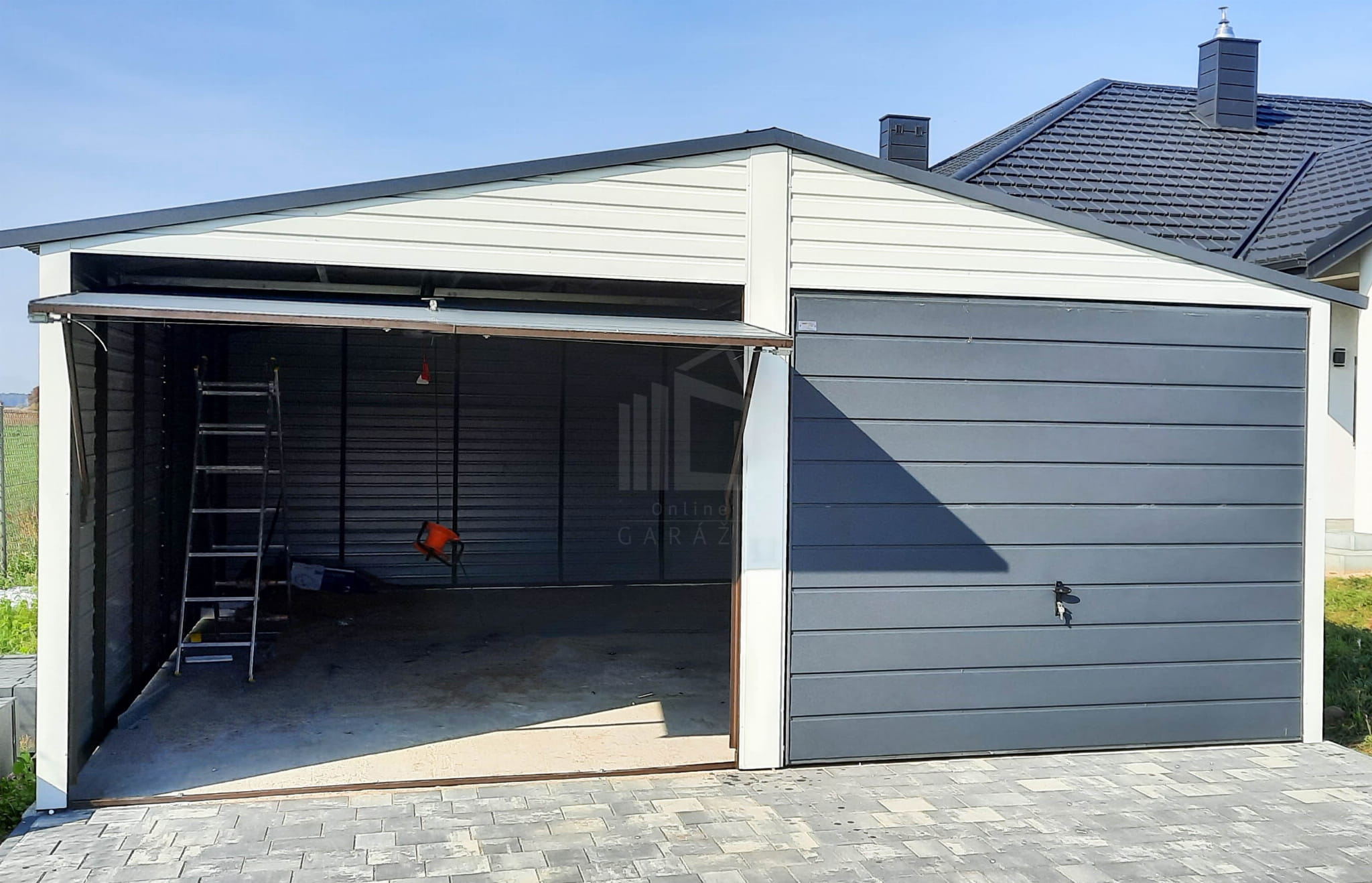 GARÁŽ PLECHOVÁ 6m x 7m – sedlová – 2x výklopná brána + dvere – biela antracit TS282 6×7