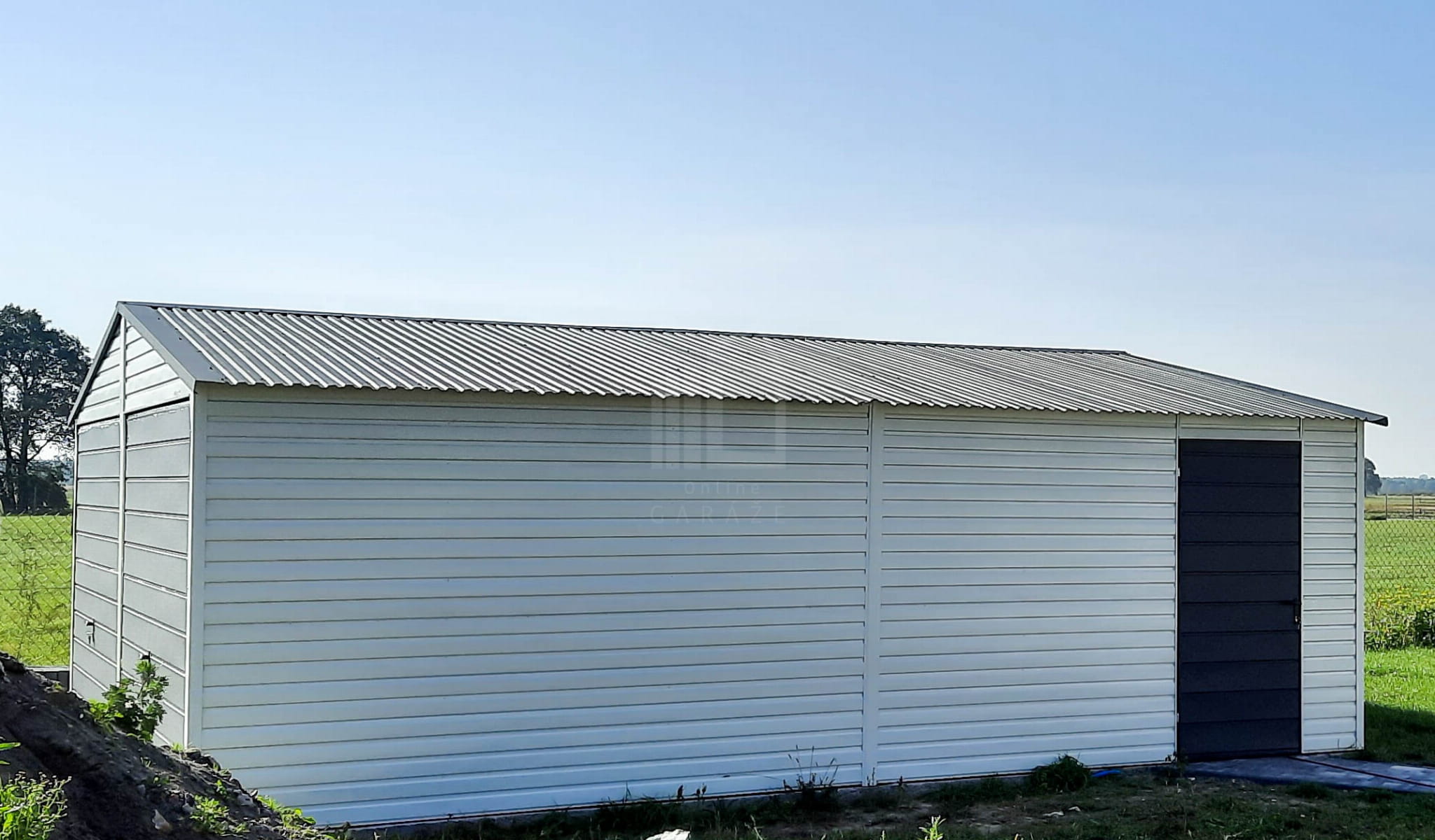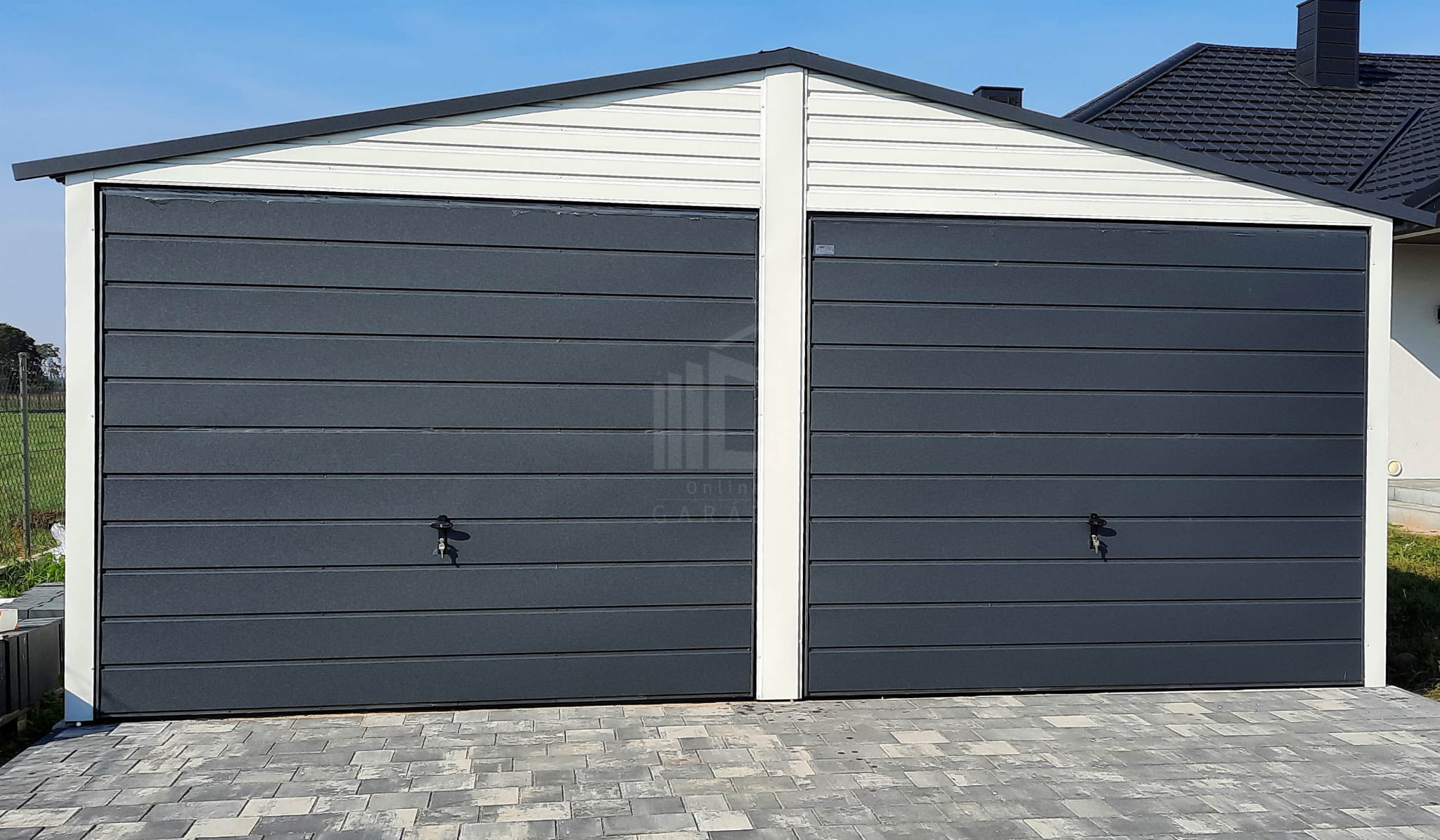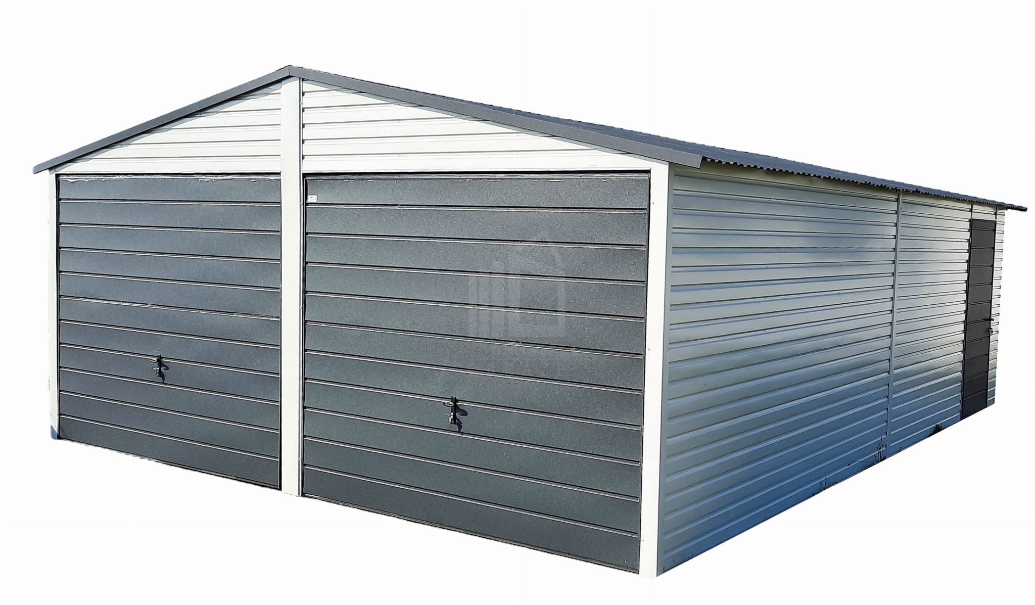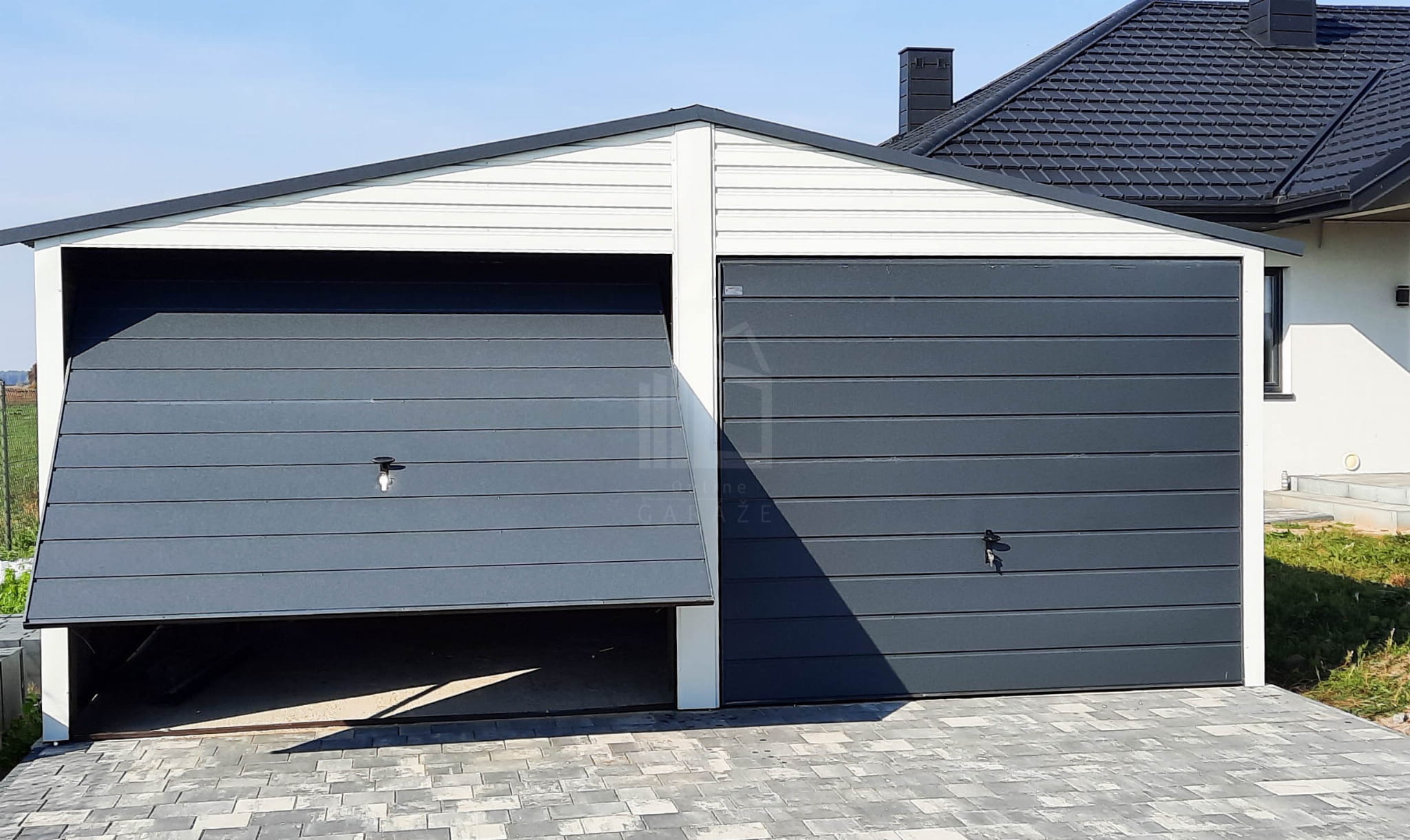GARÁŽ PLECHOVÁ 6m x 7m – sedlová – 2x výklopná brána + dvere – biela antracit TS282 6×7