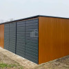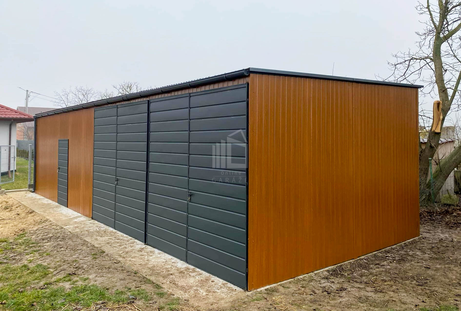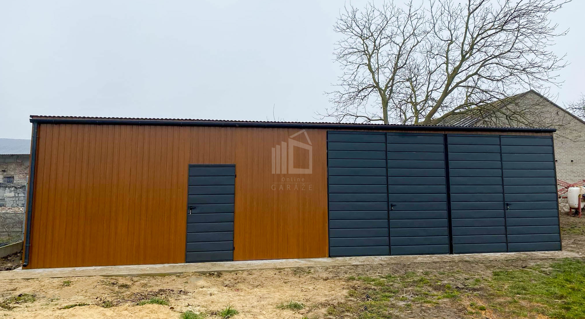 Hala Plechová garáž 13×4 2x Dvojkrídlové dvere + dvere imitácia dreva strecha: spád dopredu PLG170