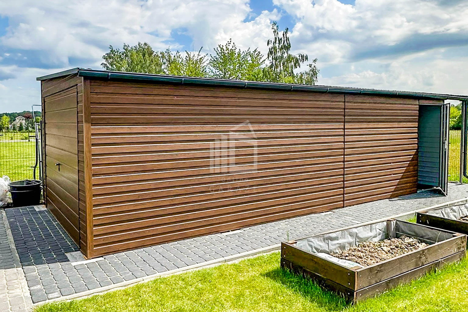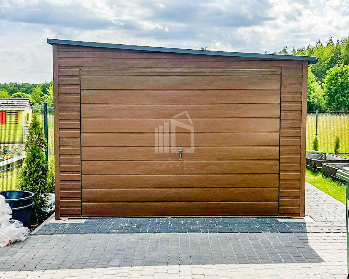 • výklopná brána 300×200 cm, vodorovné prelisy T17, farba zlatý dub