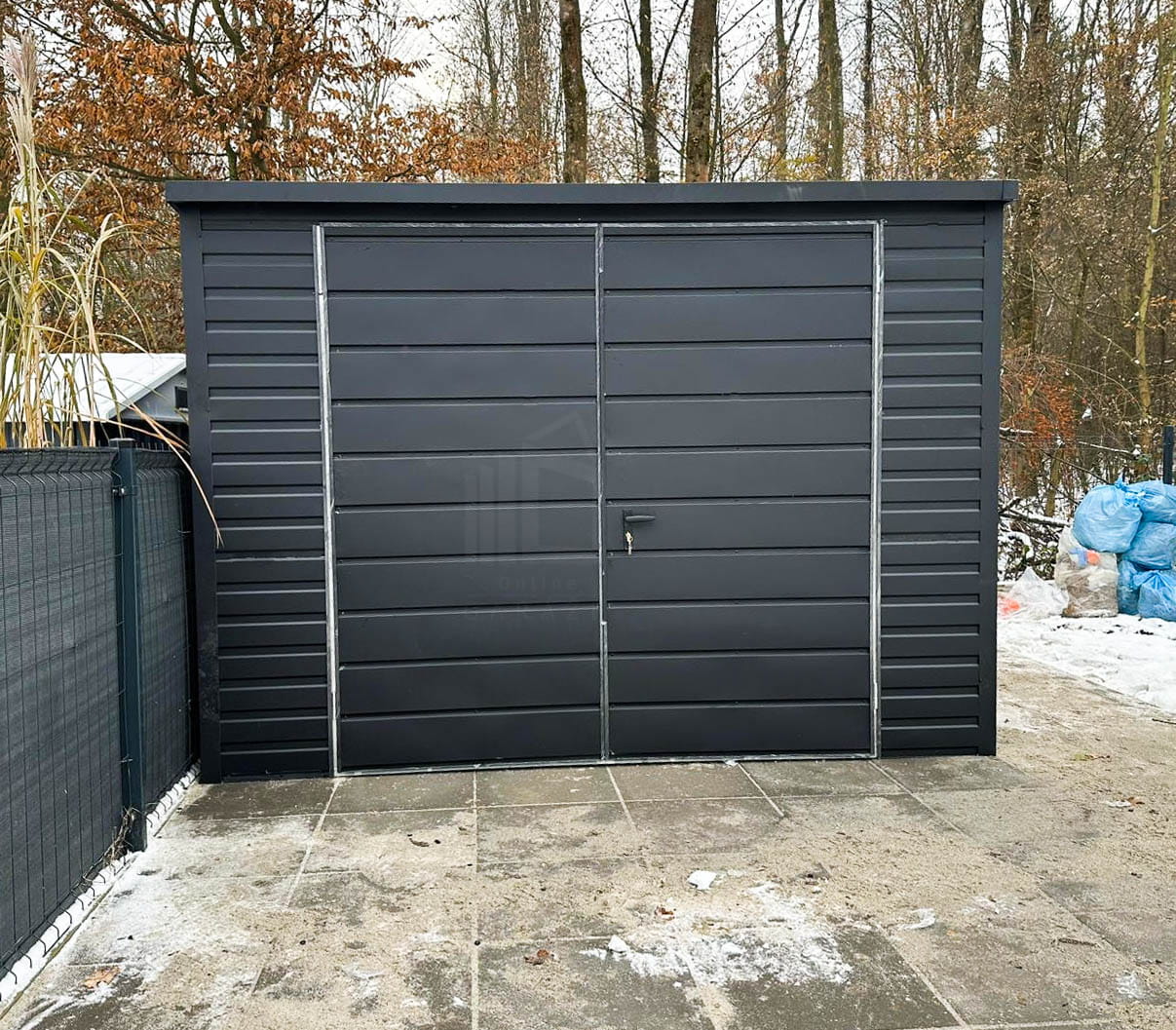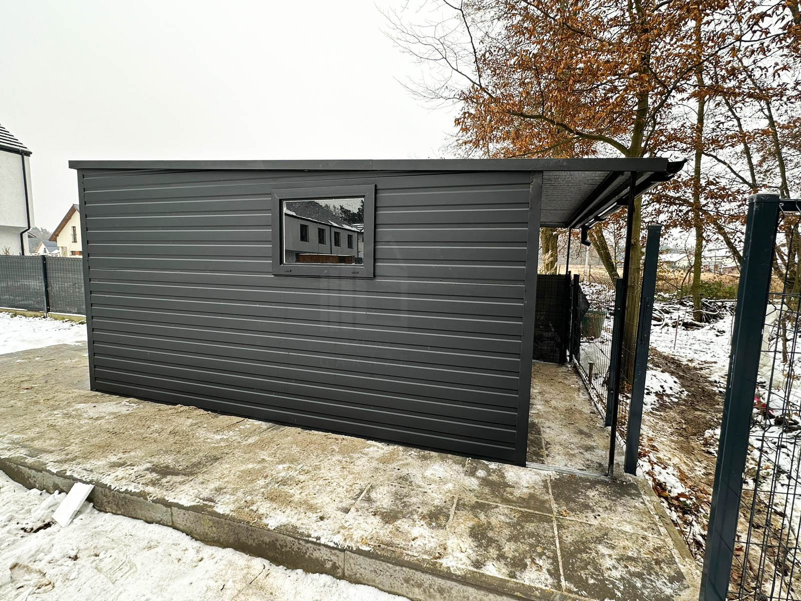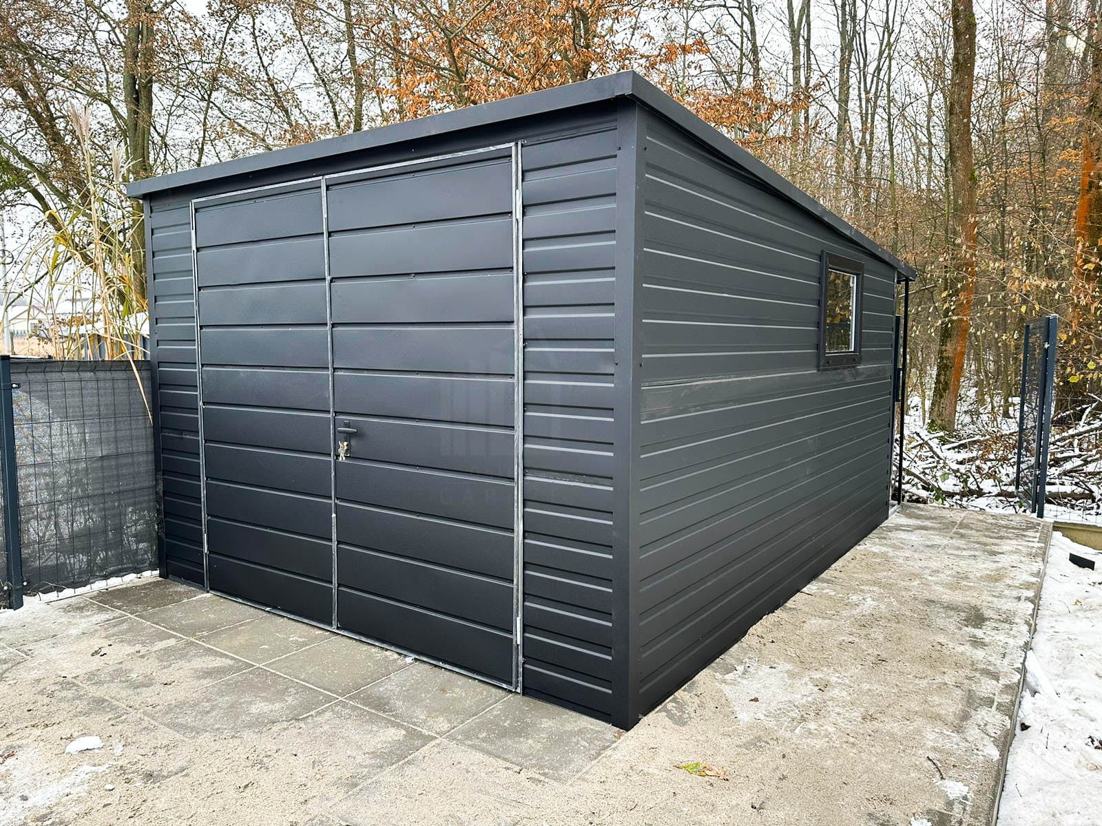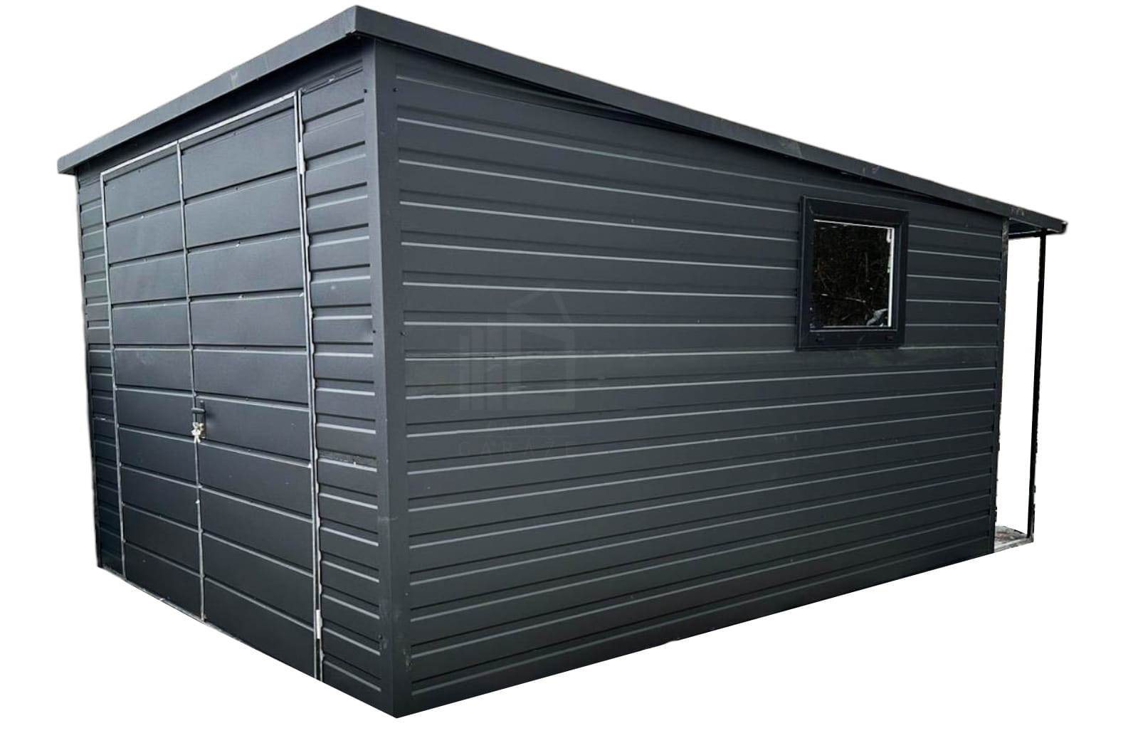 Plechová garáž 3×5 + prístrešok 0,5×3, dvojkrídlové dvere – okno – rýna okapová – antracit , strecha spád dozadu TS526