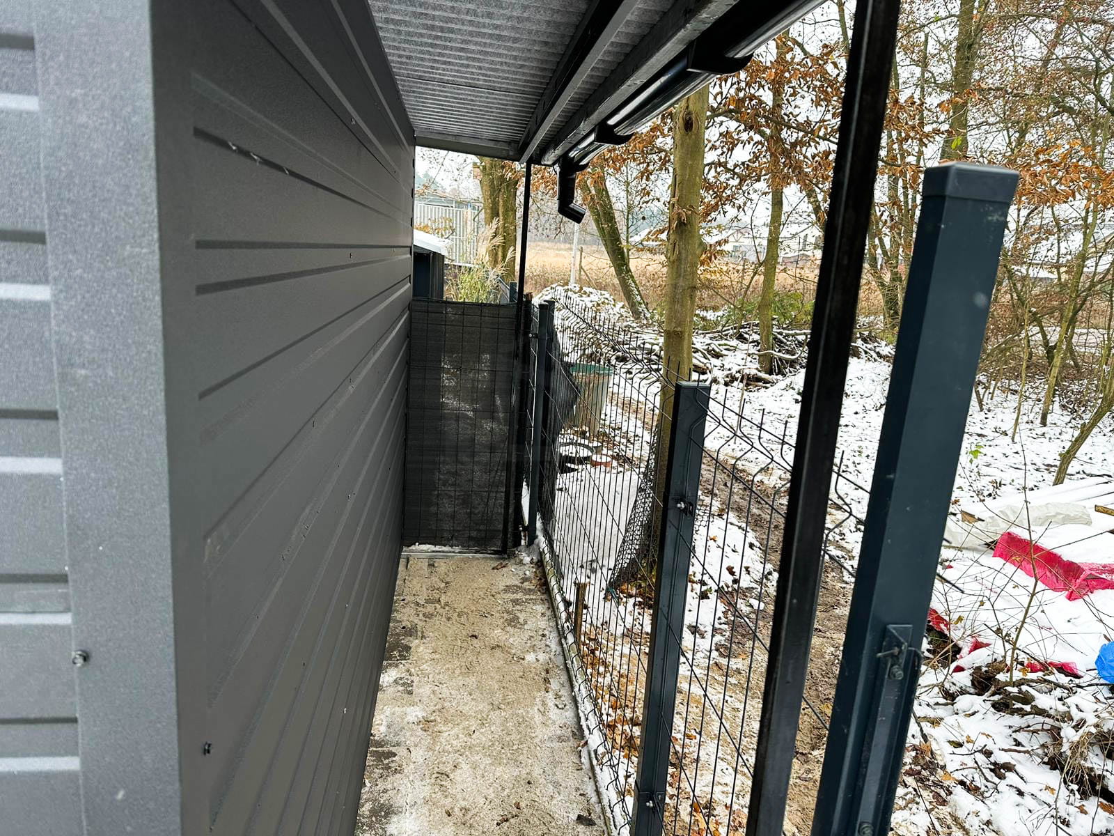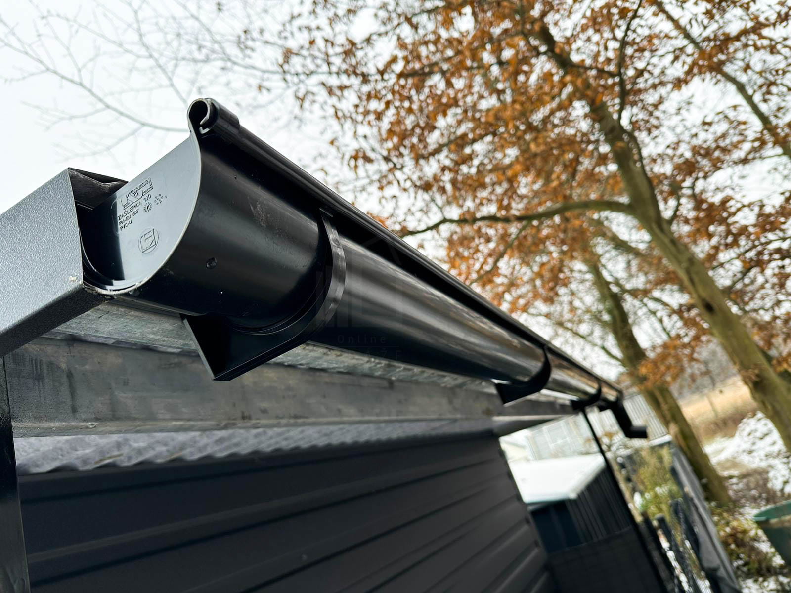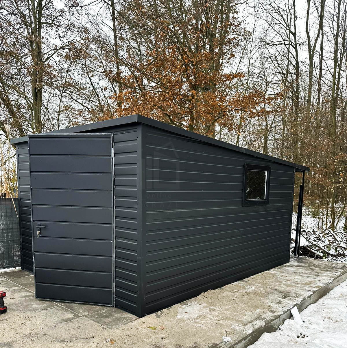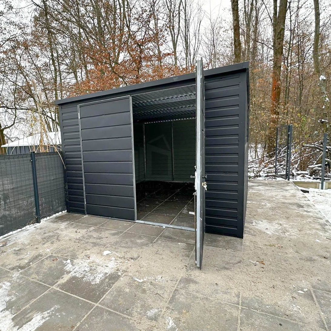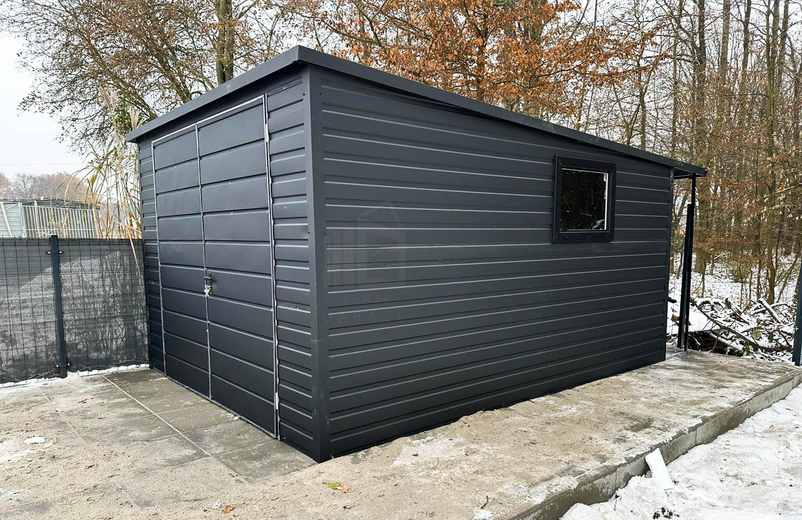 Plechová garáž 3×5 + prístrešok 0,5×3, dvojkrídlové dvere – okno – rýna okapová – antracit , strecha spád dozadu TS526