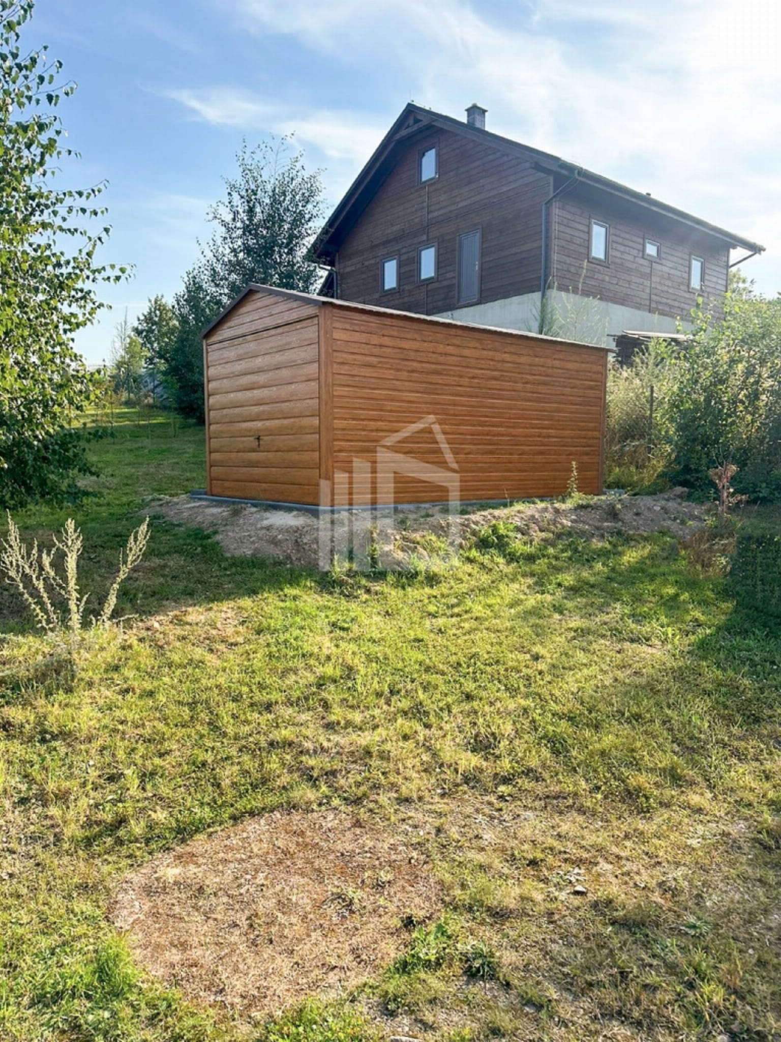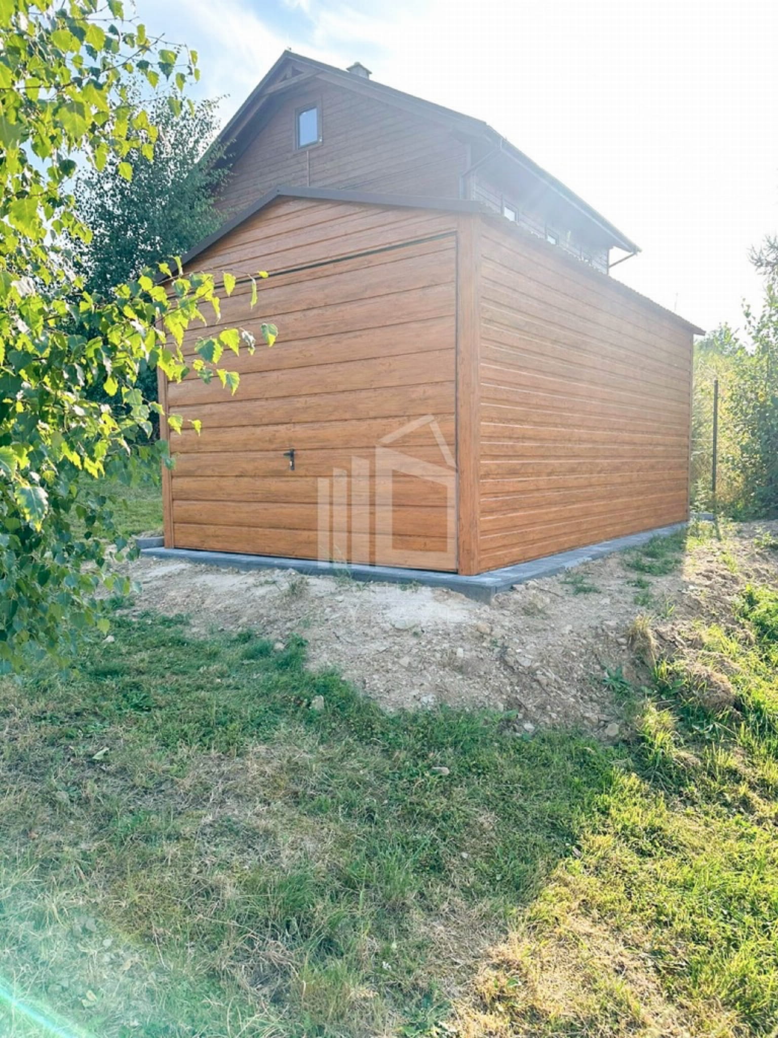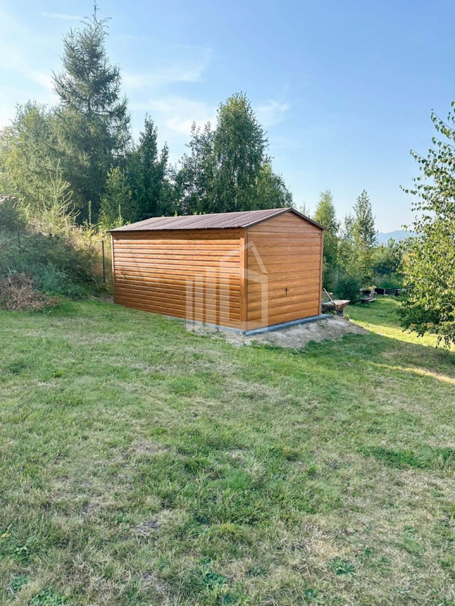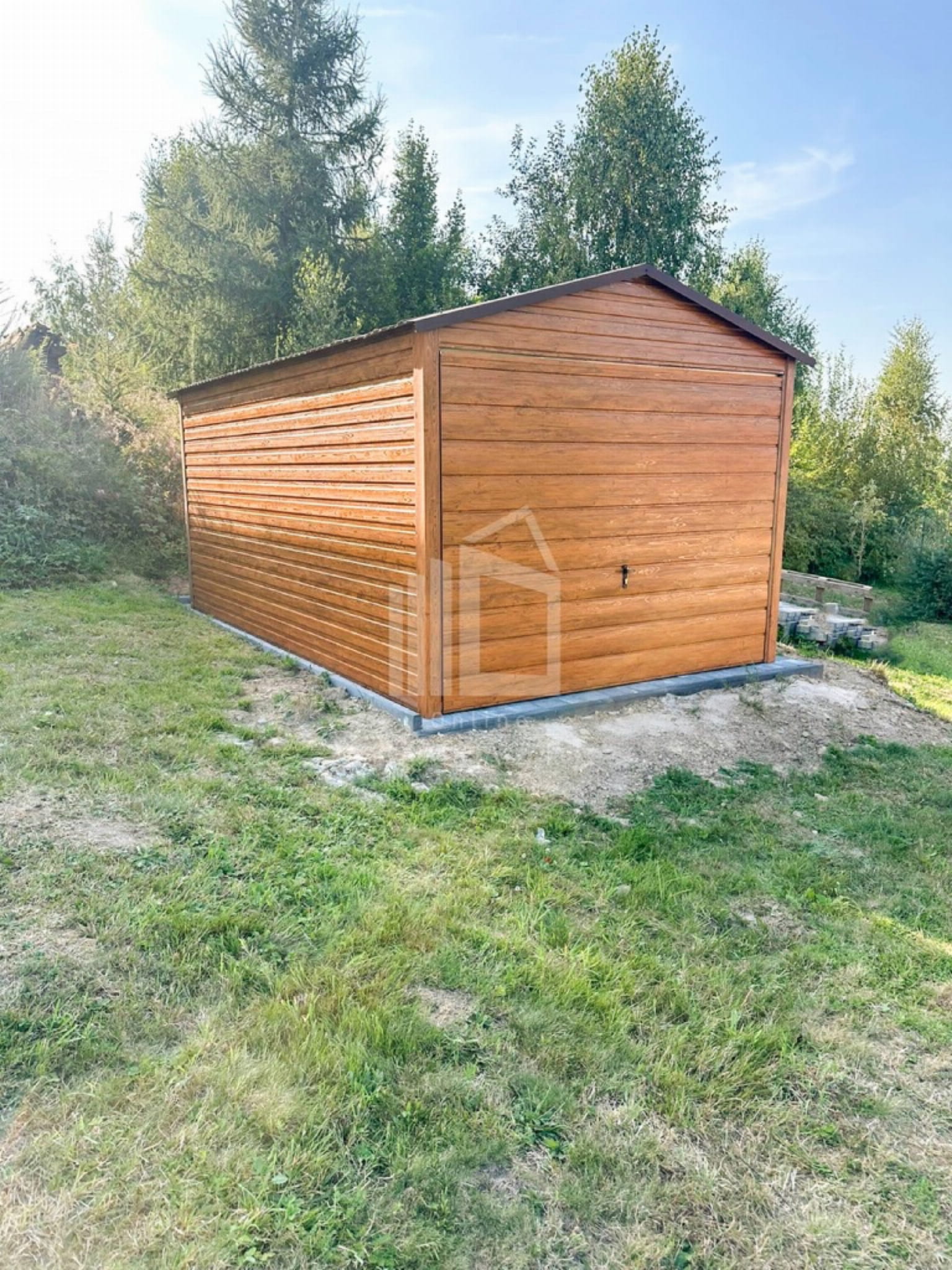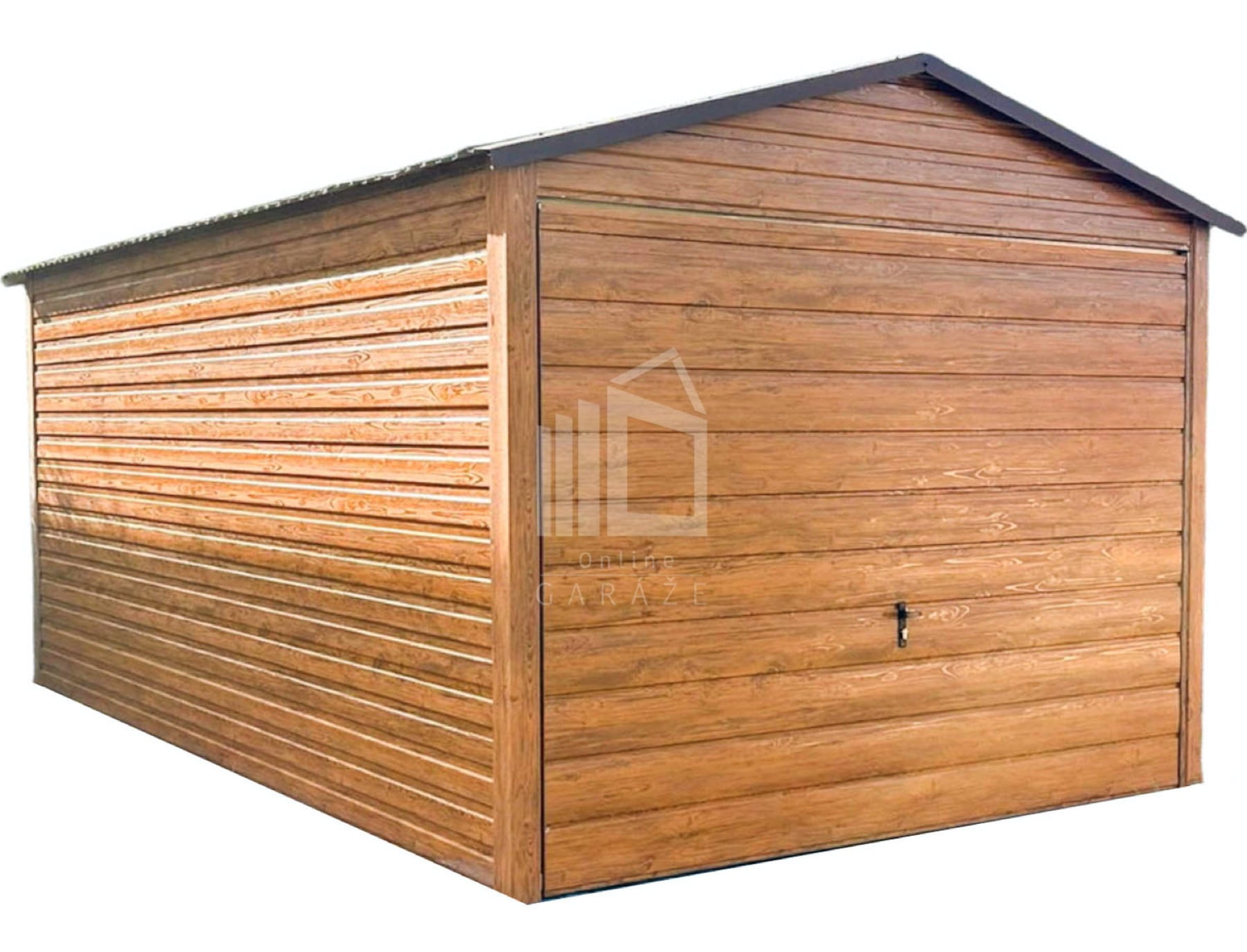 Plechová garáž 3×5 – výklopná brána – Svetlý orech (imitácia dreva) – strecha dvojspádová (sedlová) TS782