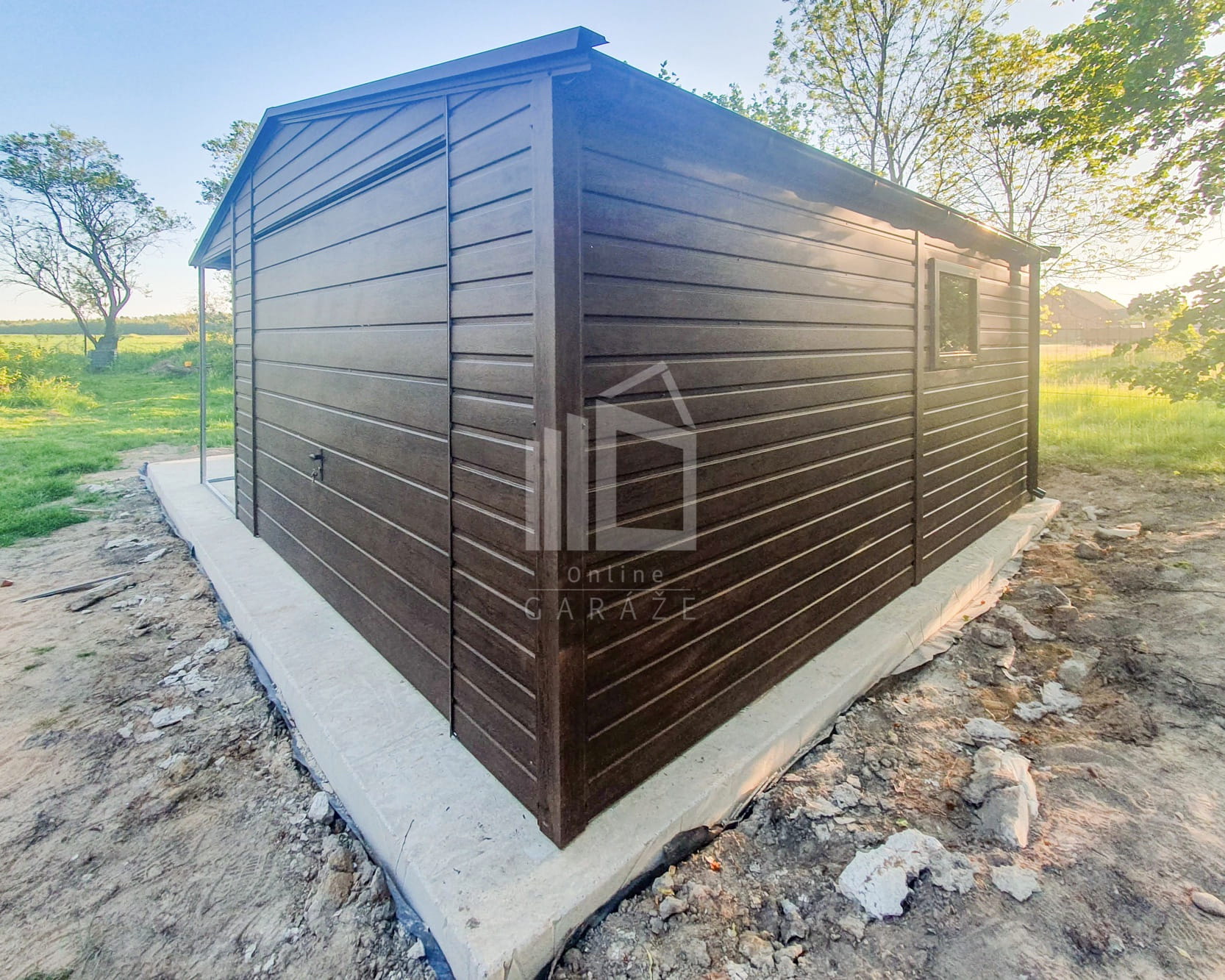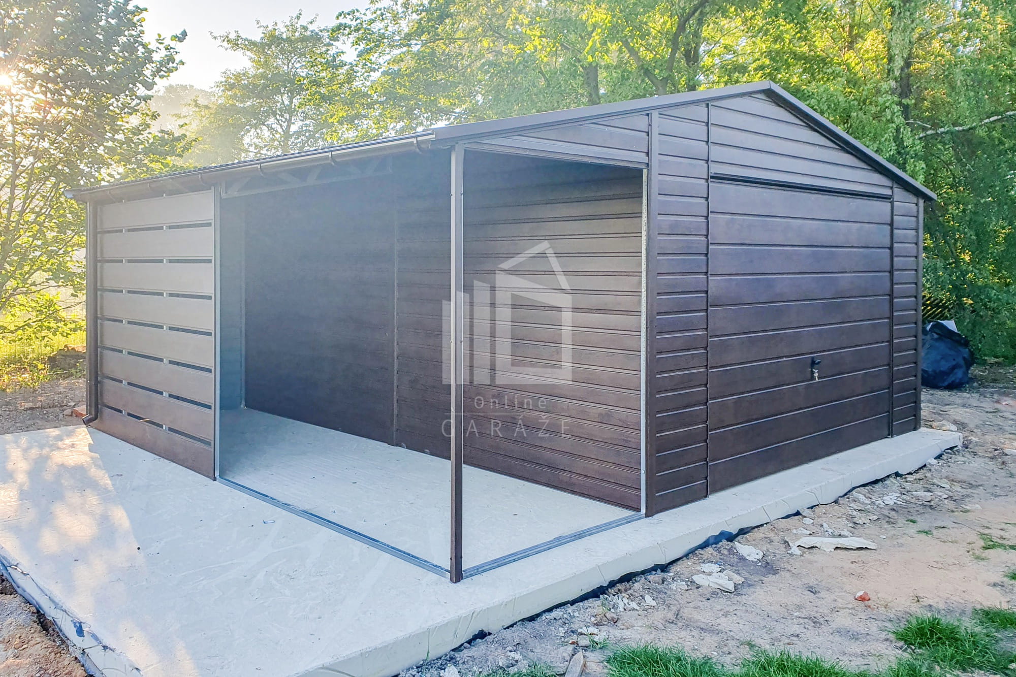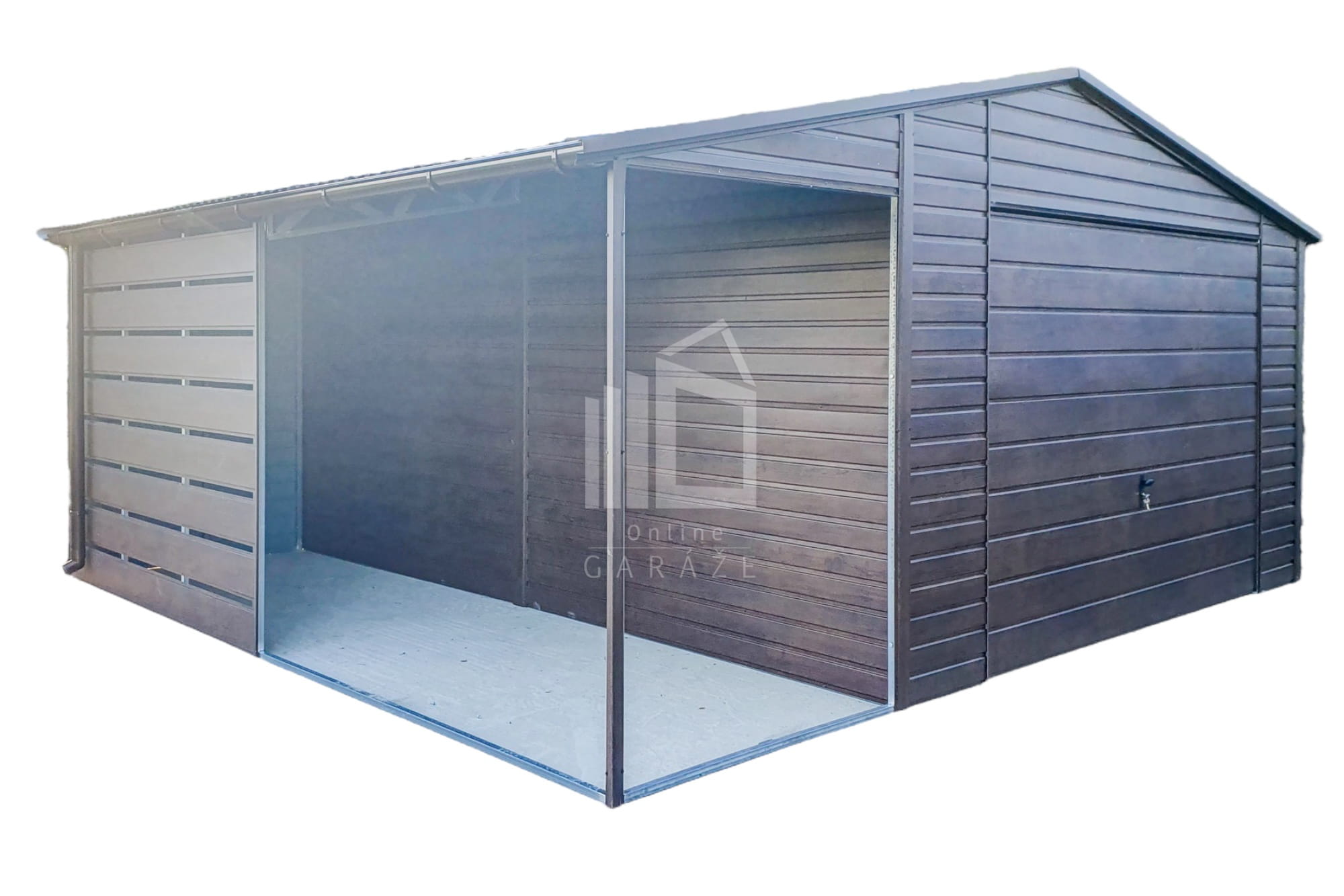 Plechová garáž 4,5x6m + prístrešok 2m – výklopná brána – okno – tmavý orech – imitácia dreva – rýna okapová – strecha dvojspádová TS729