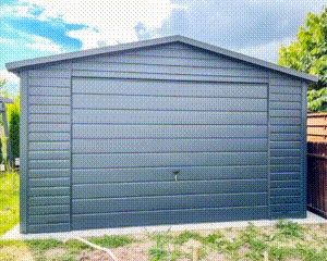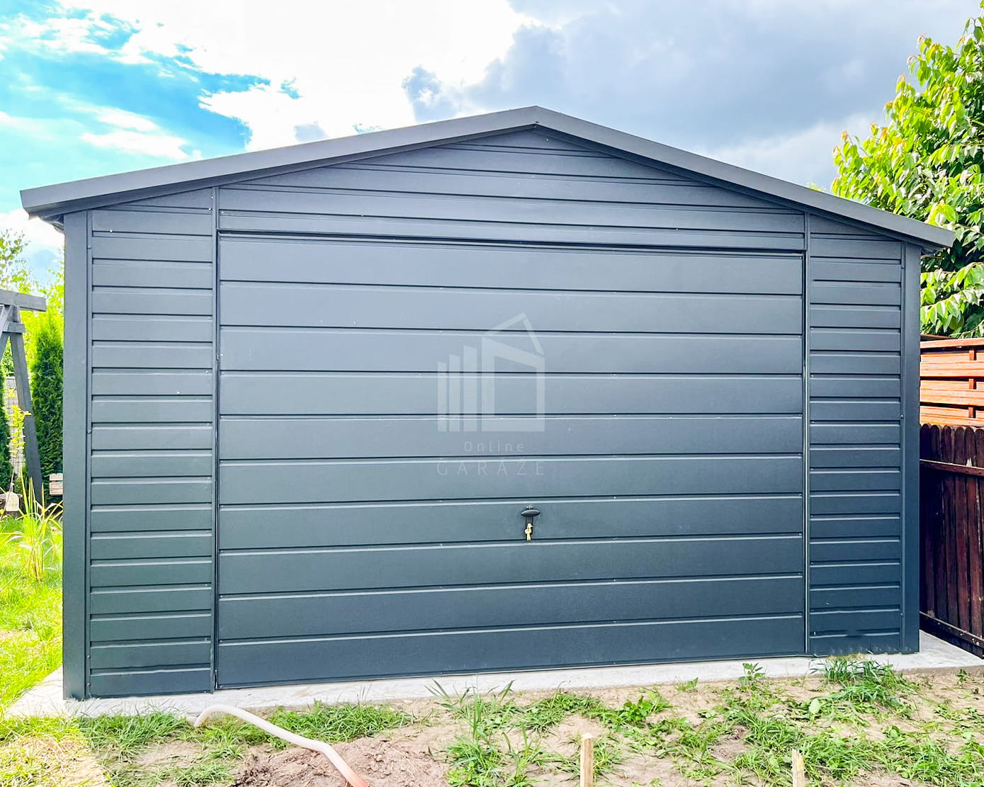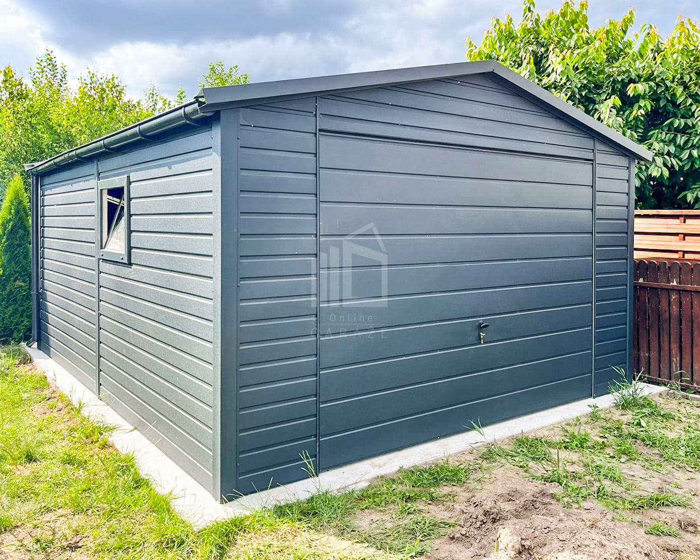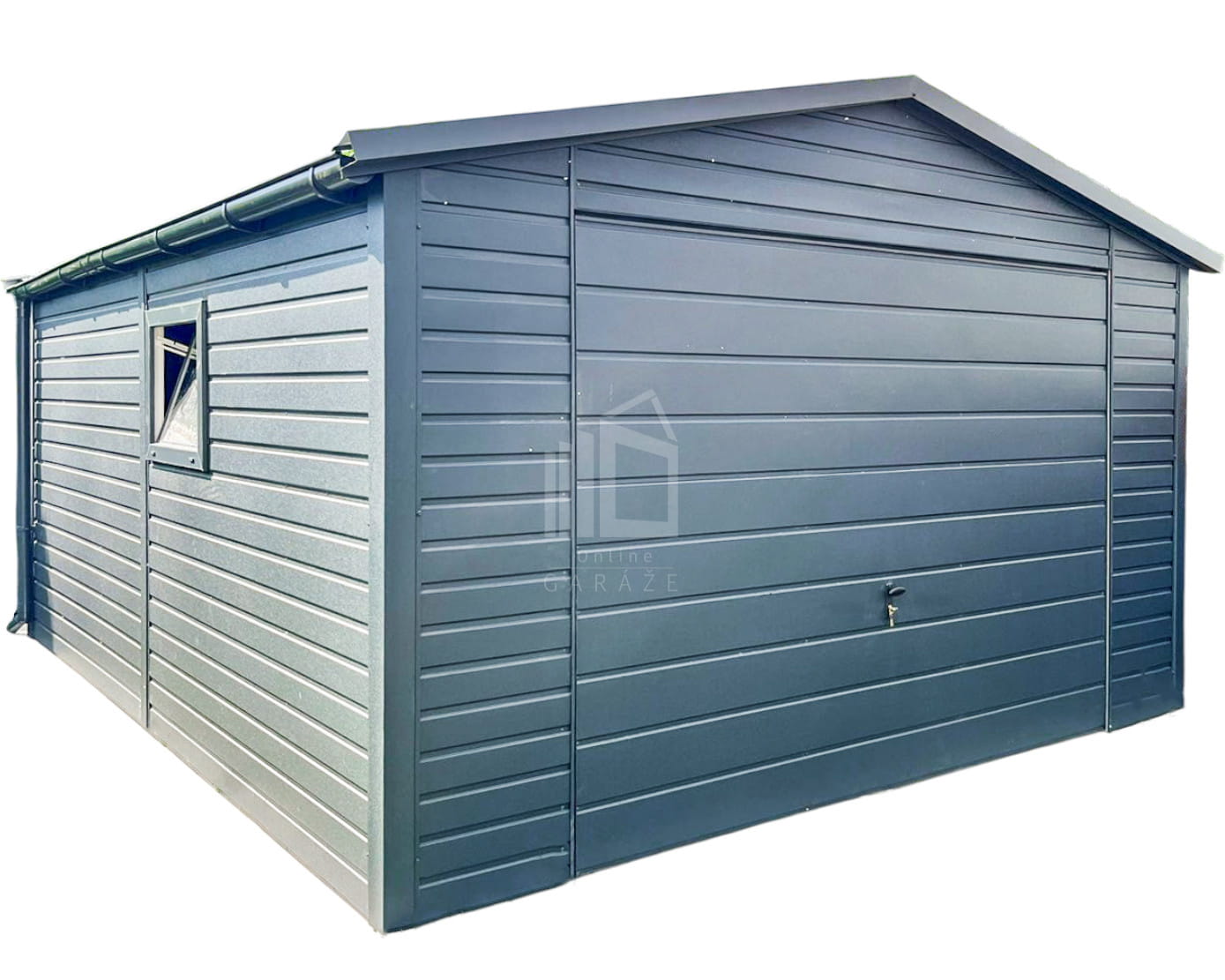 Plechová garáž 4×5,5 – výklopná brána – Okno – antracit – rýna okapová – strecha dvojspádová (sedlová) TS763