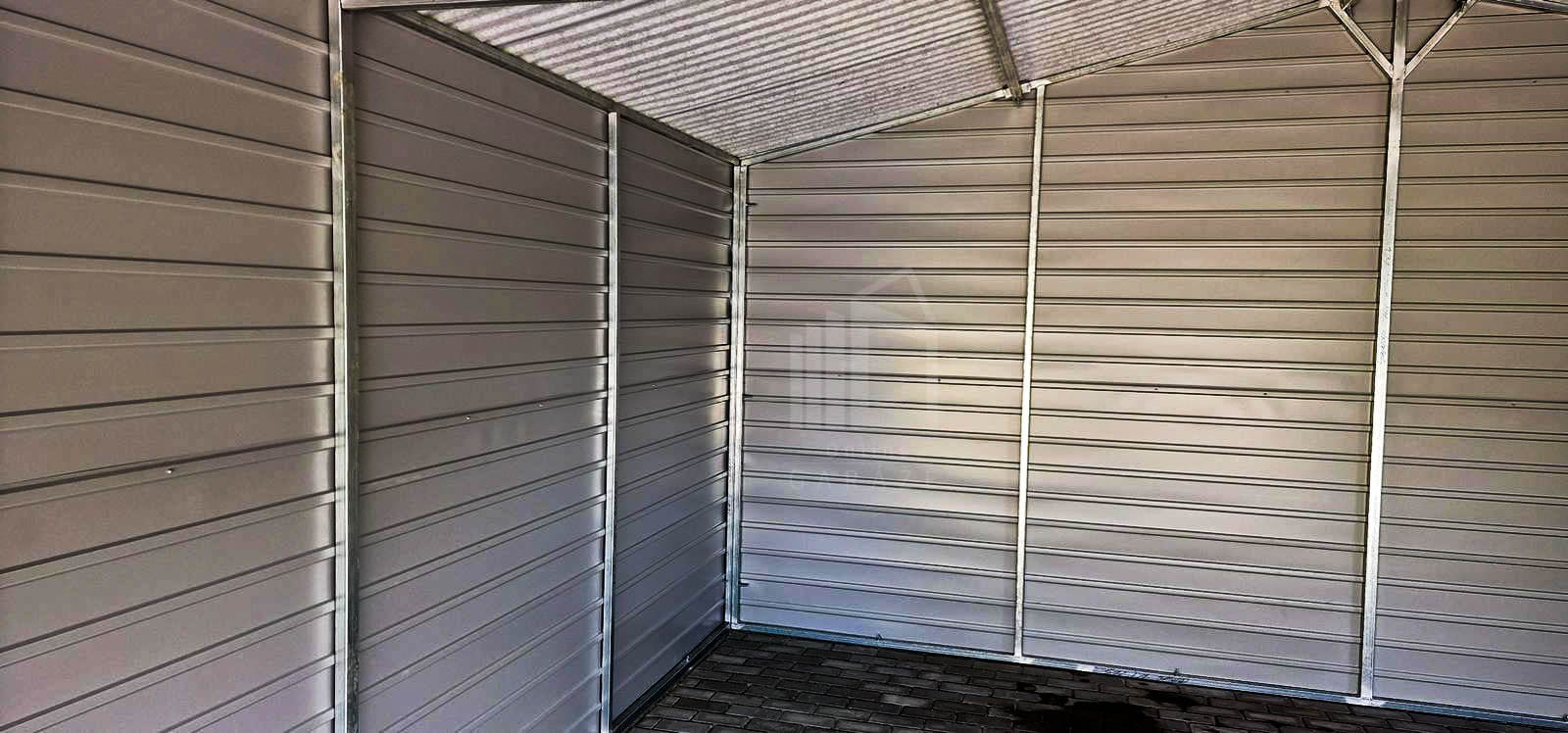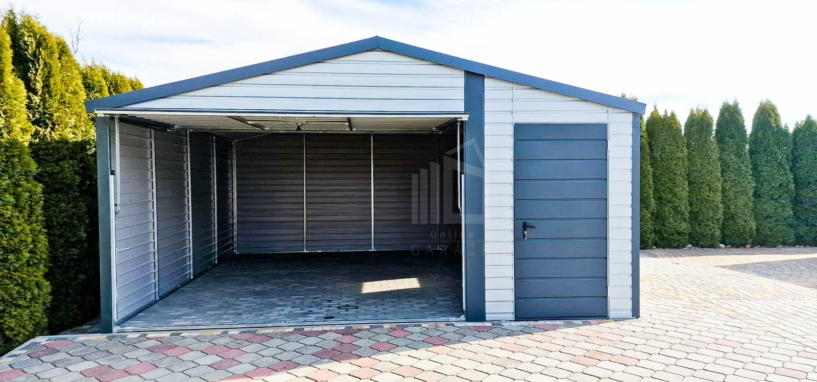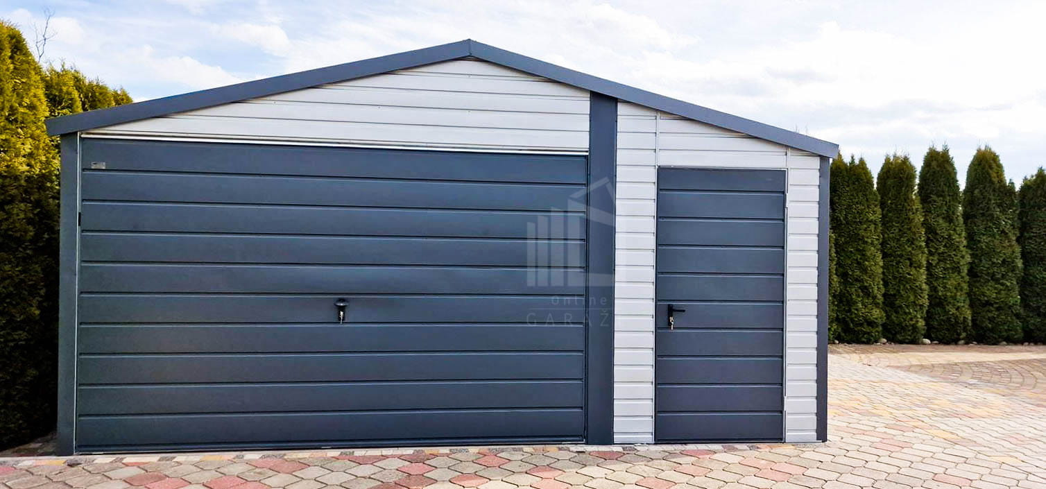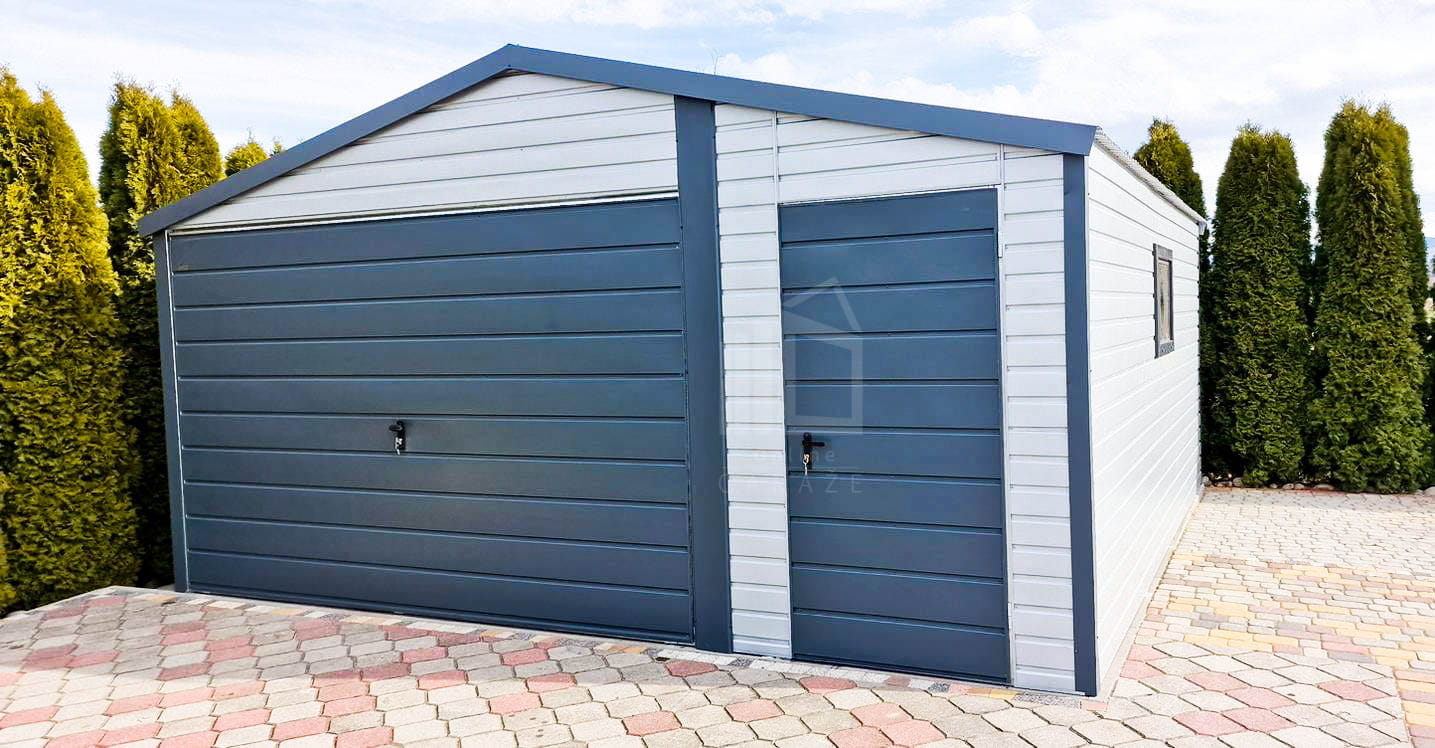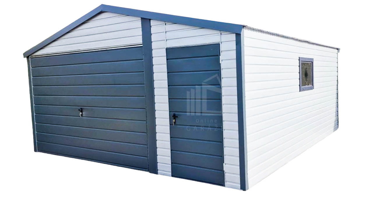 Plechová garáž 5m x 6m vodorovný – výklopná brána + dvere + okno – antracit + biela TS317 5×6.