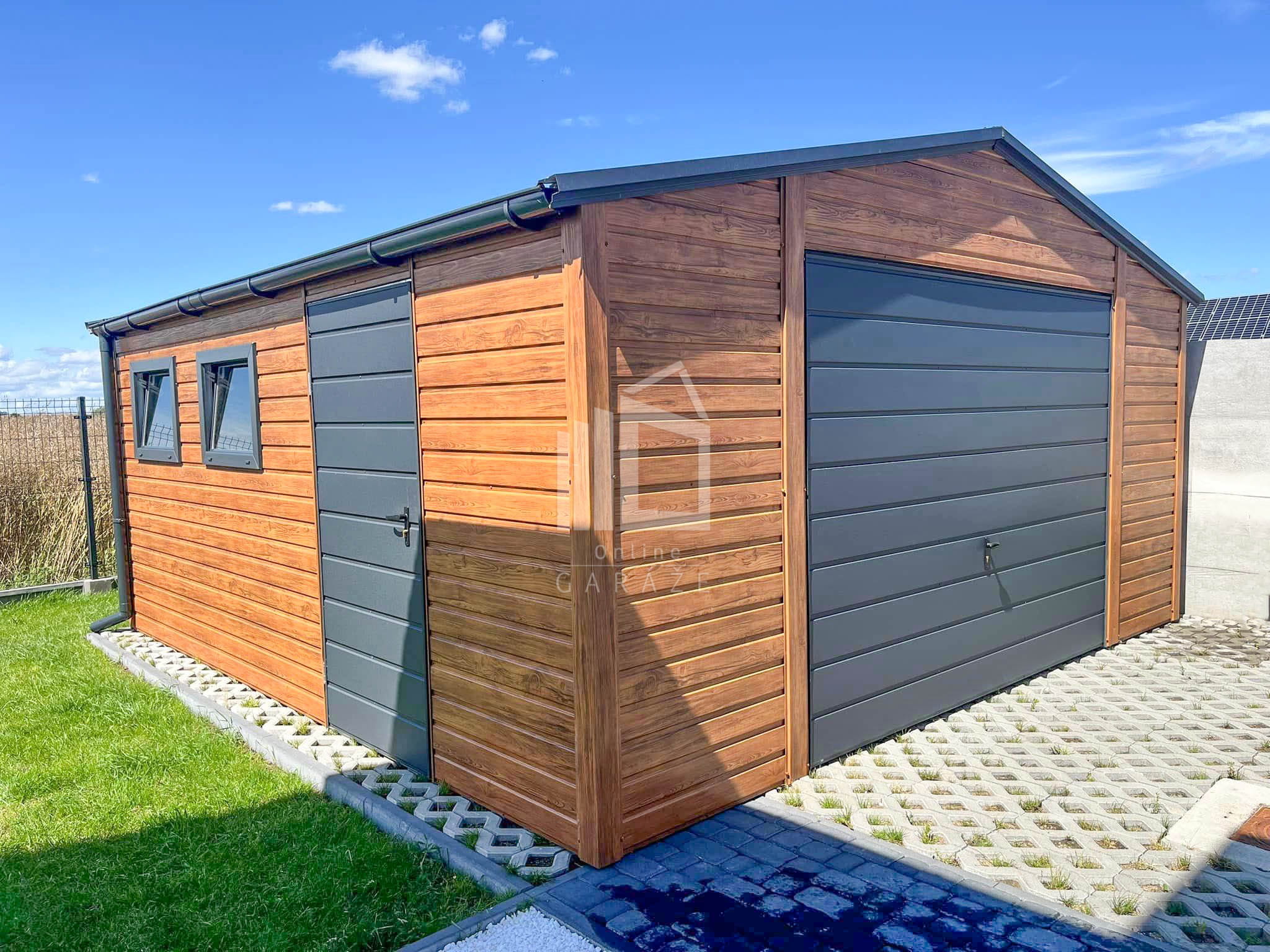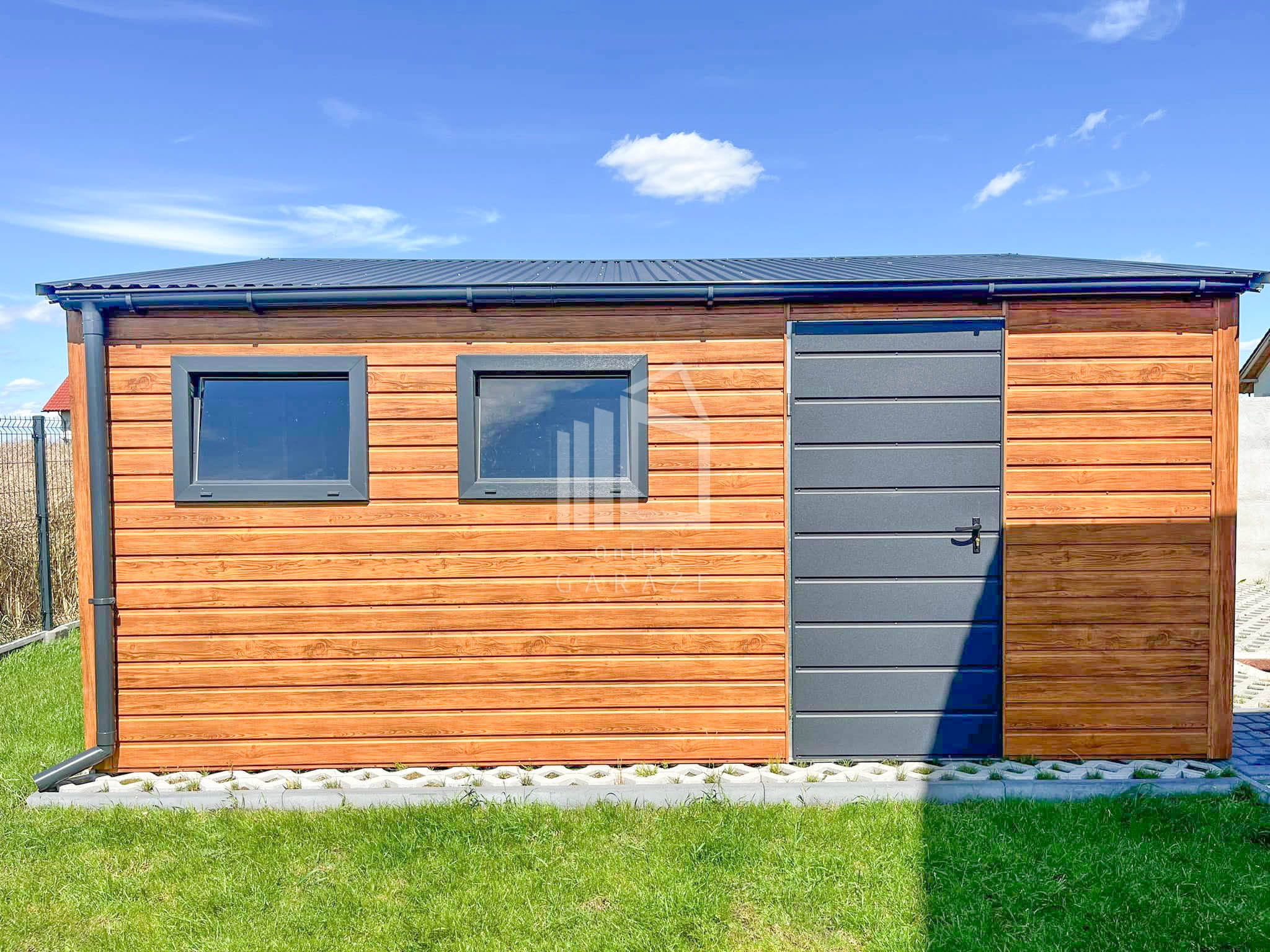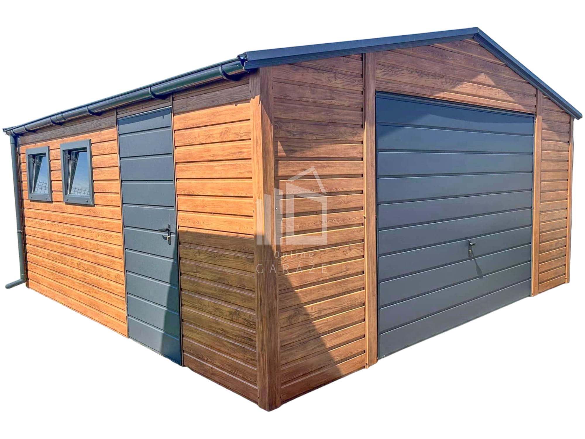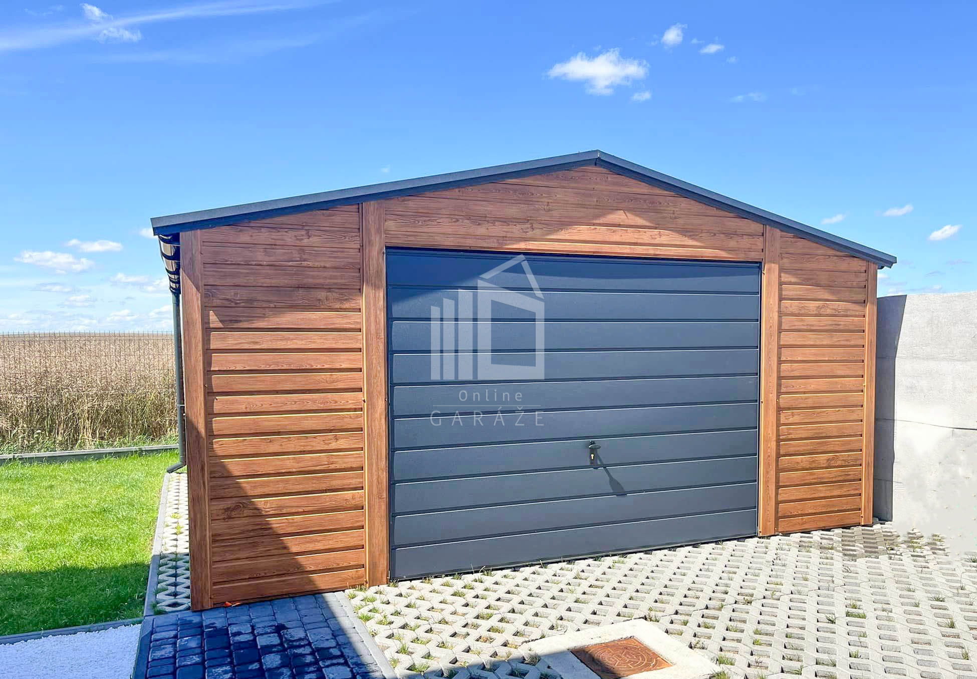 Plechová garáž 5×5 m – výklopná brána – dvere – 2x okno – orech svetlý – imitácia dreva – antracit – rýna okapová – strecha dvojspádová (sedlová) TS880