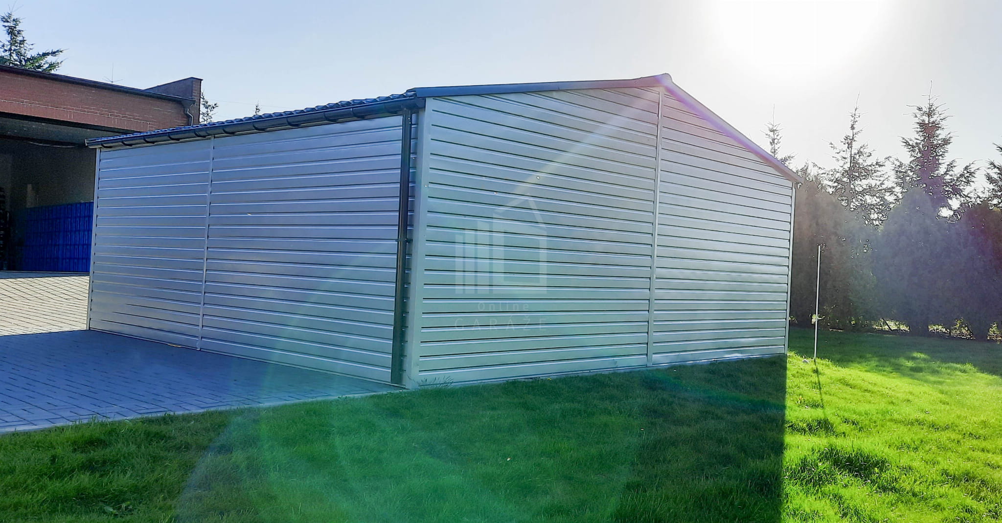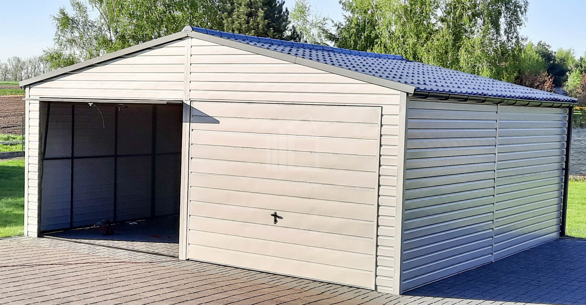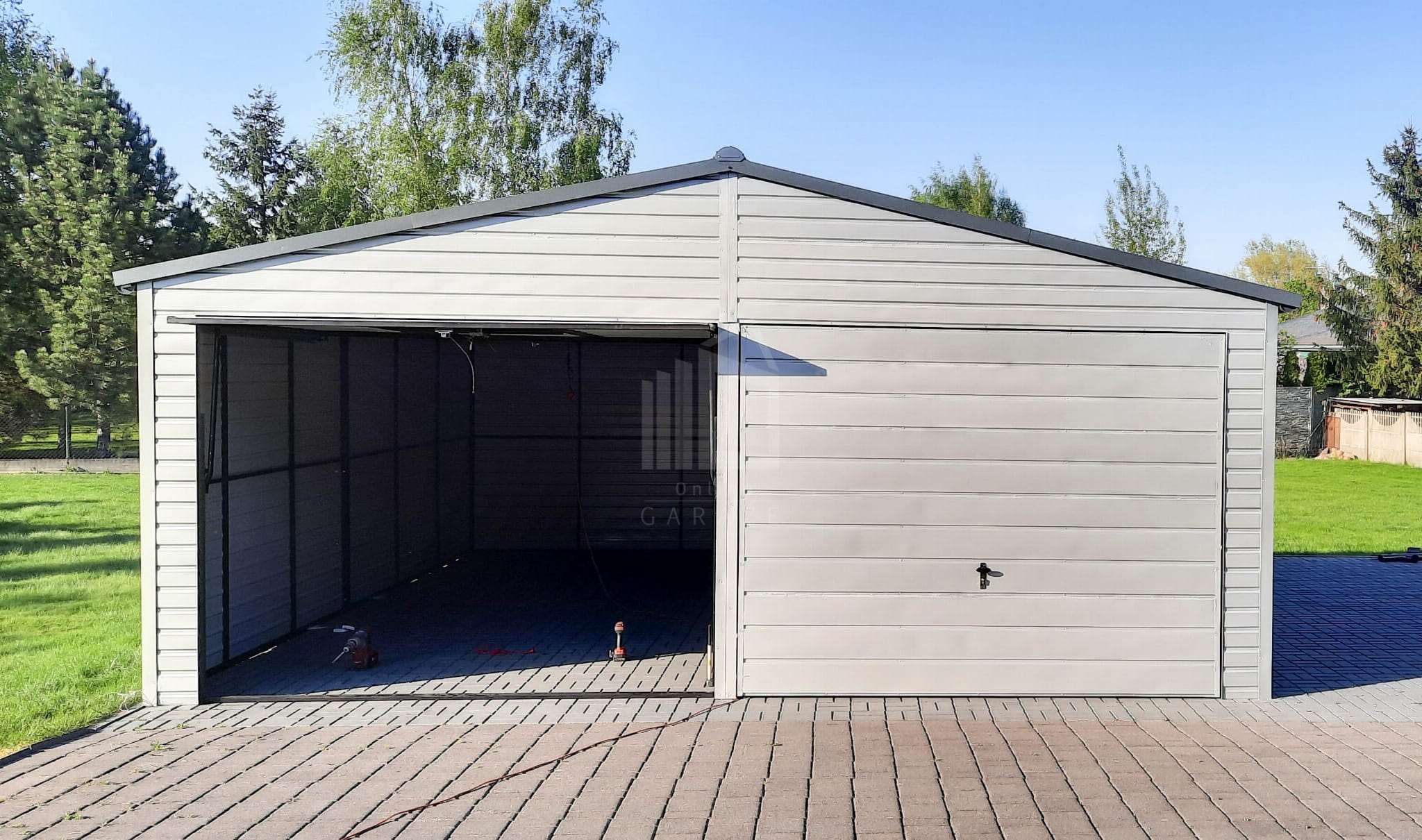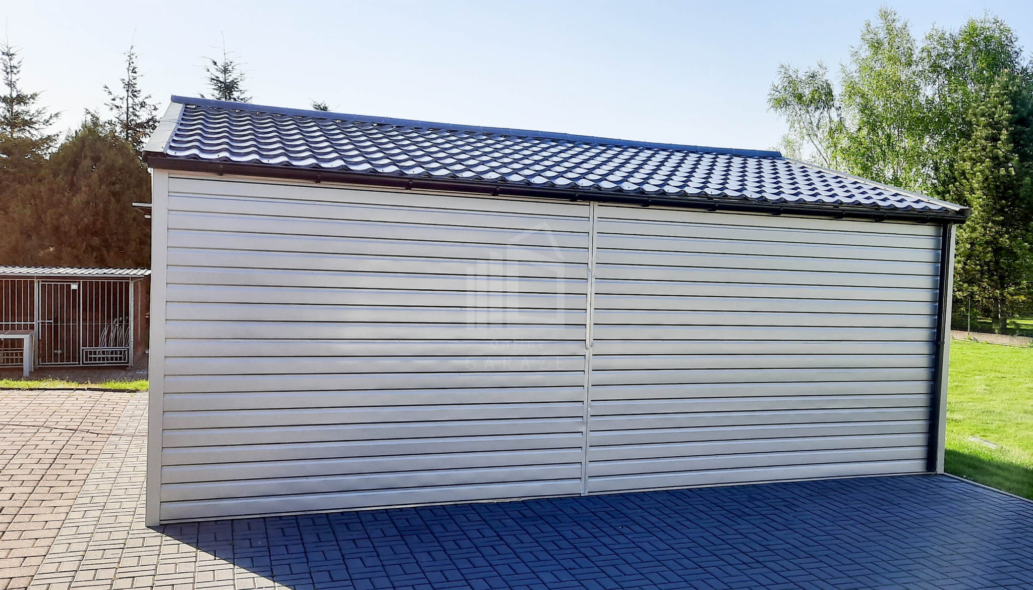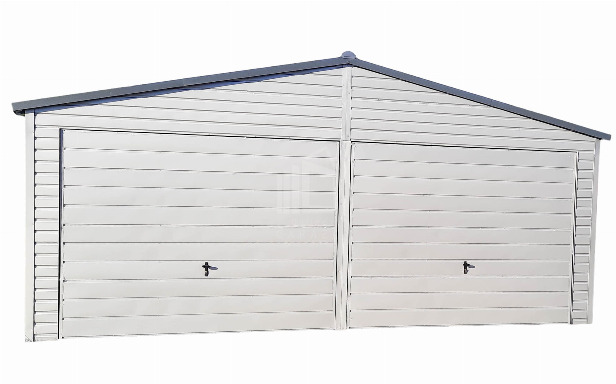 Plechová garáž 6,5m x 6m vodorovný – dvojspádová (sedlová) – 2x výklopná brána – biela + antracit TS292 6,5×6