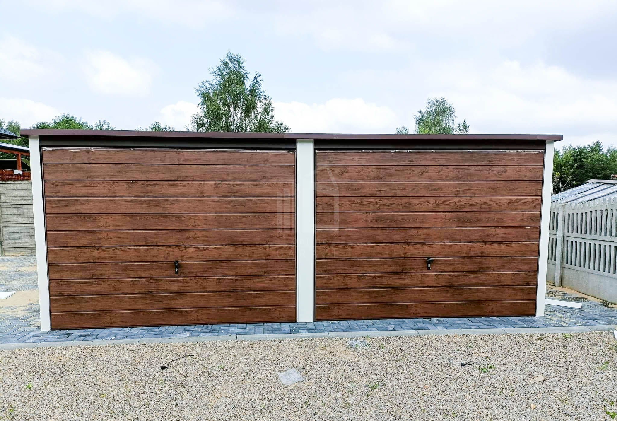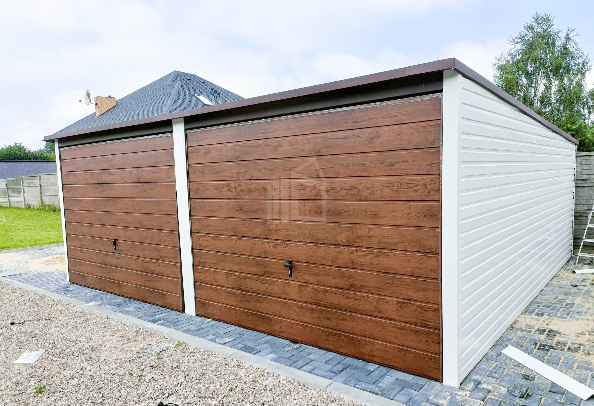 Plechová garáž 6m x 6m vodorovný – spád dozadu – 2x výklopná brána – orech tmavý + biela – dvere TS252 6×6