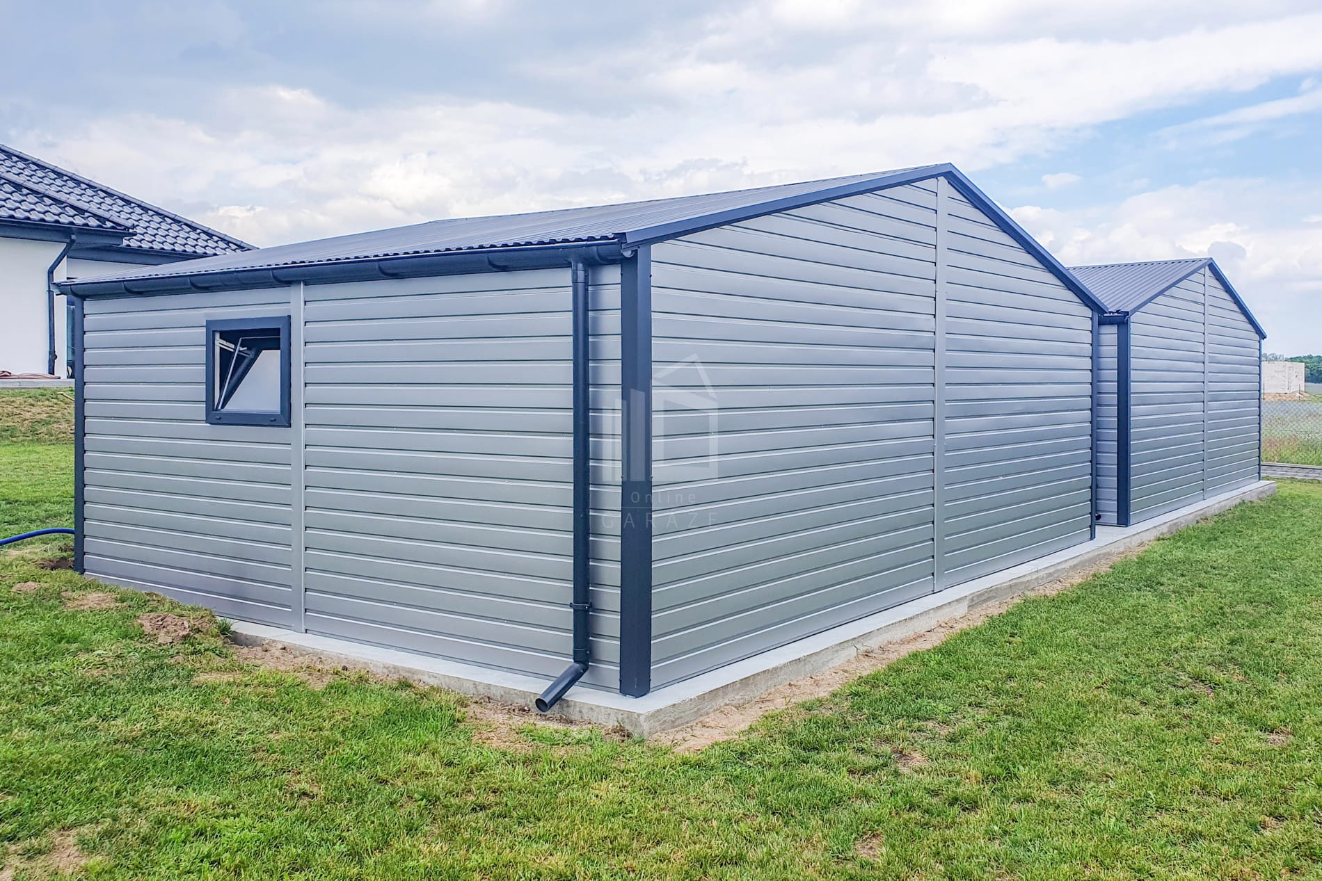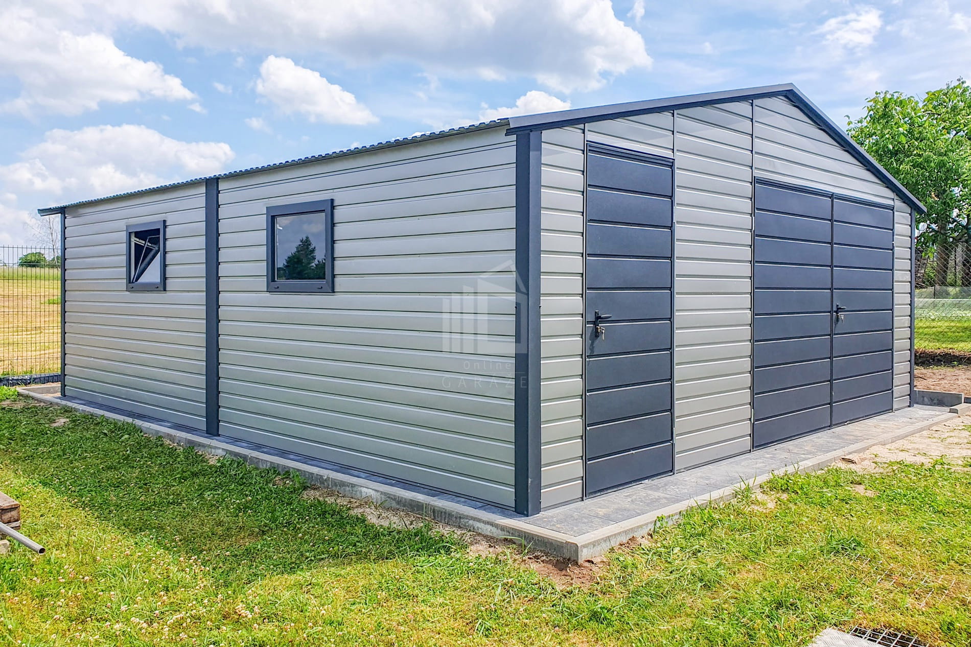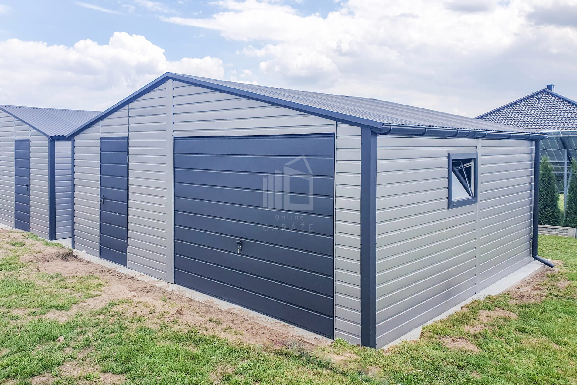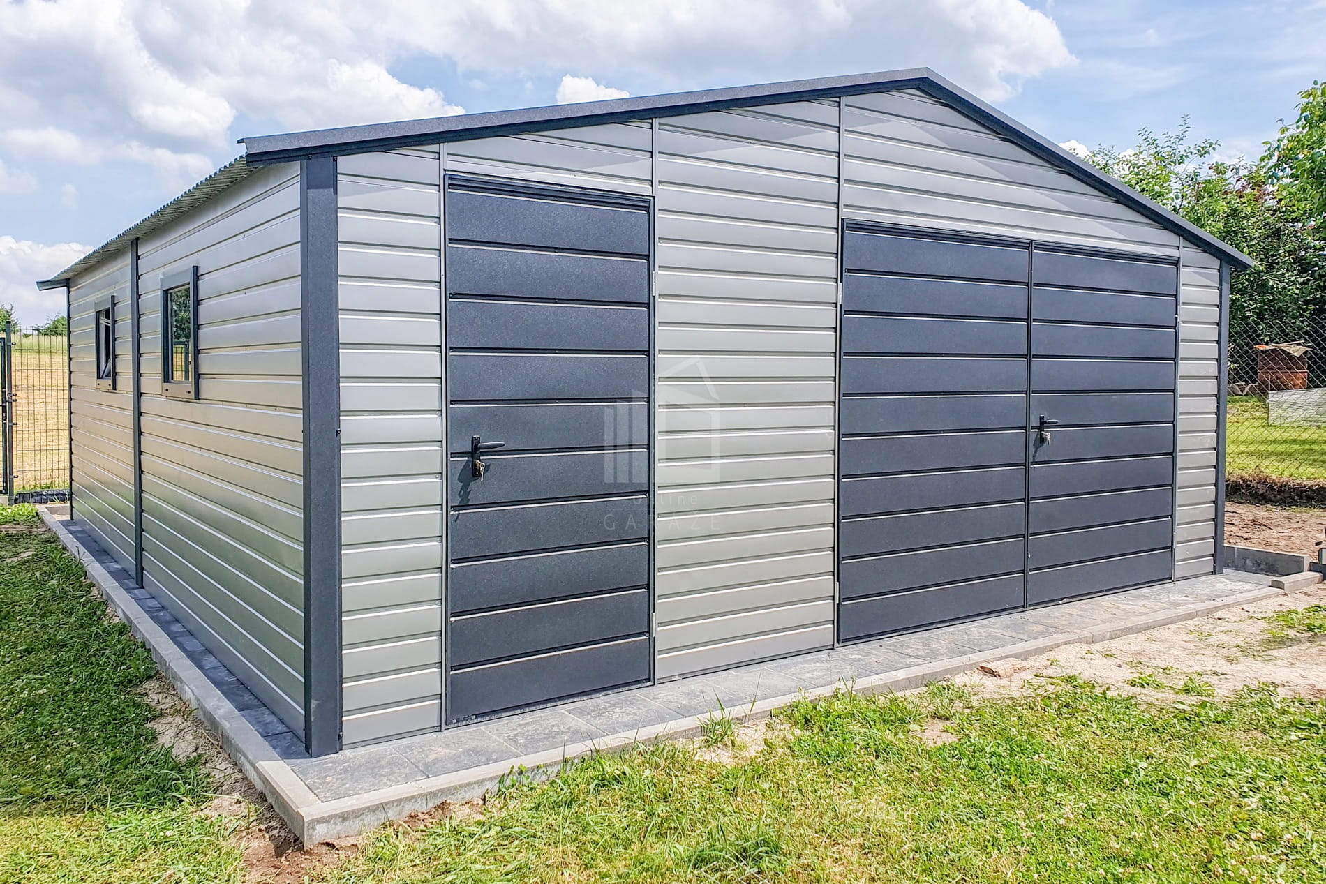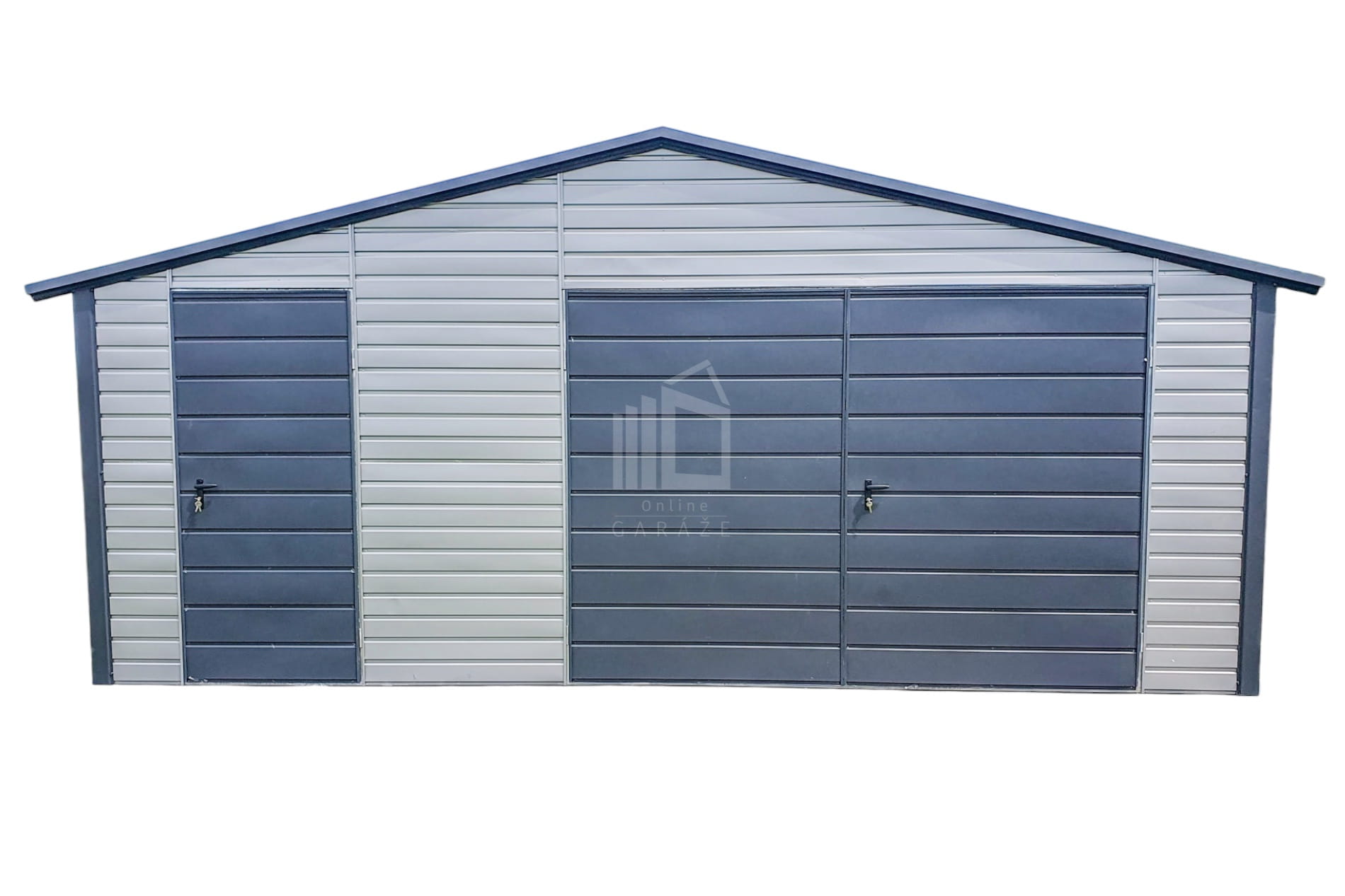 Plechová garáž 7×6 m – výklopná brána – dvere – 2x okno – antracit – strieborná – strecha dvojspádová (sedlová) TS710