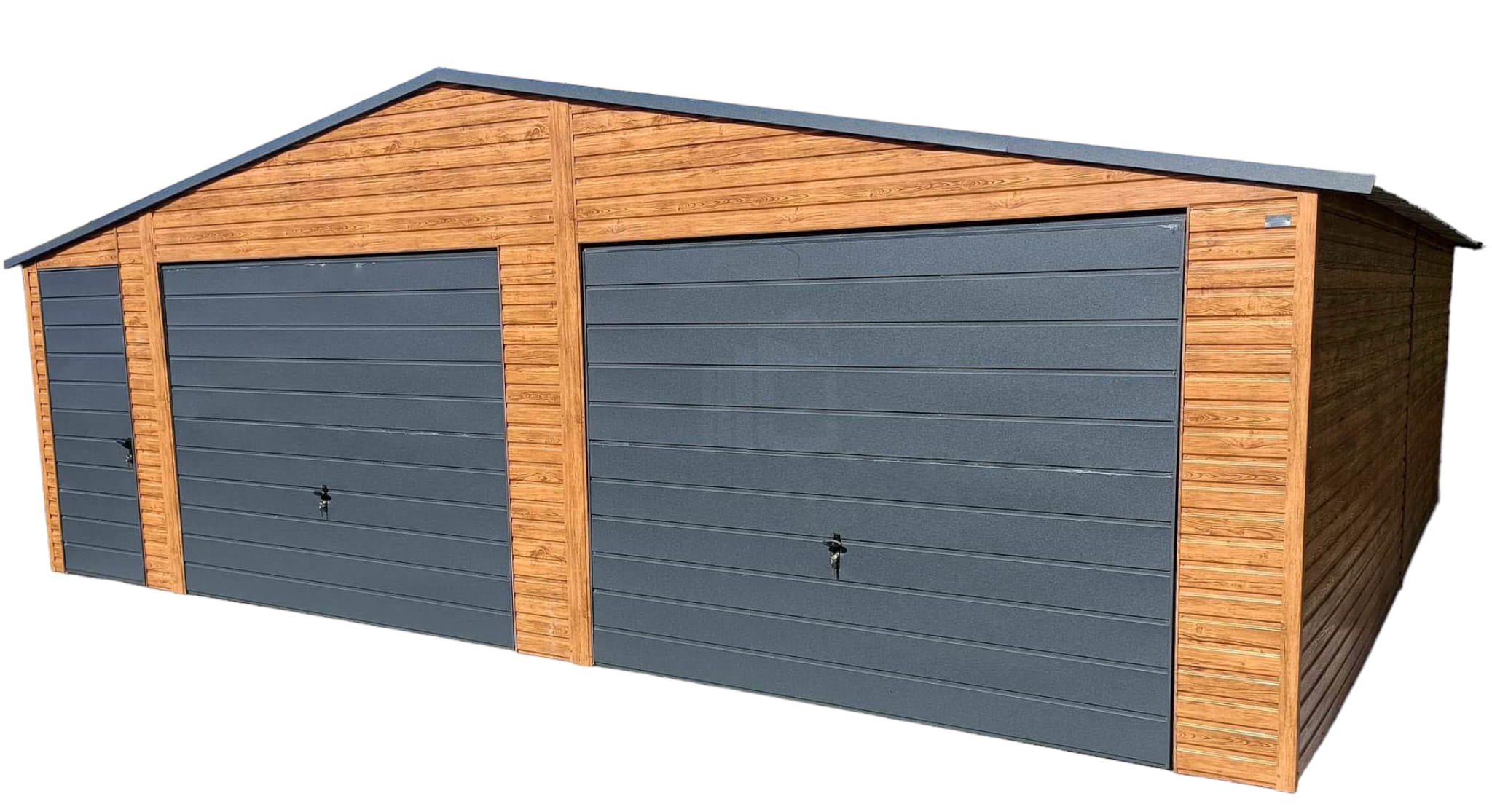 Plechová garáž 8m x 7m sedlová strecha – 2x výklopná brána + dvere – antracit – imitácia dreva TS256 8×7