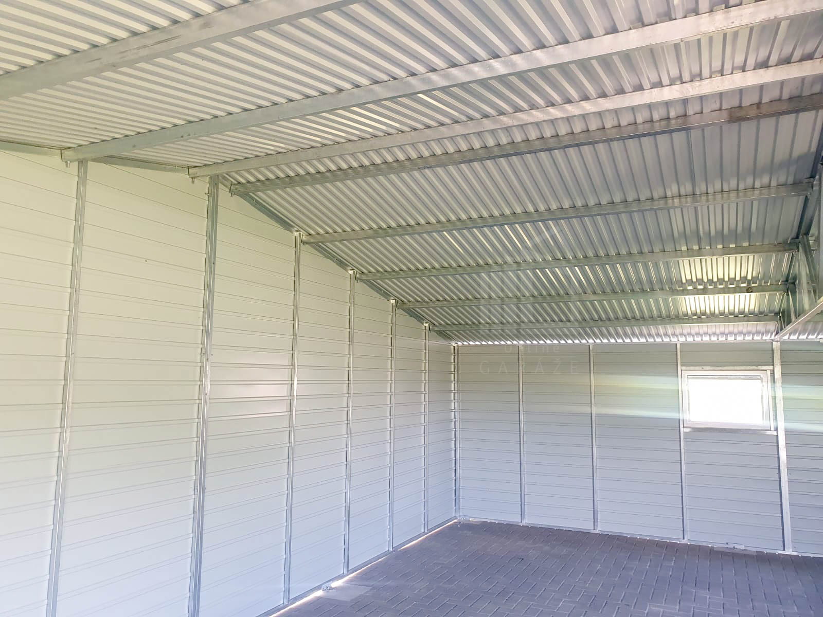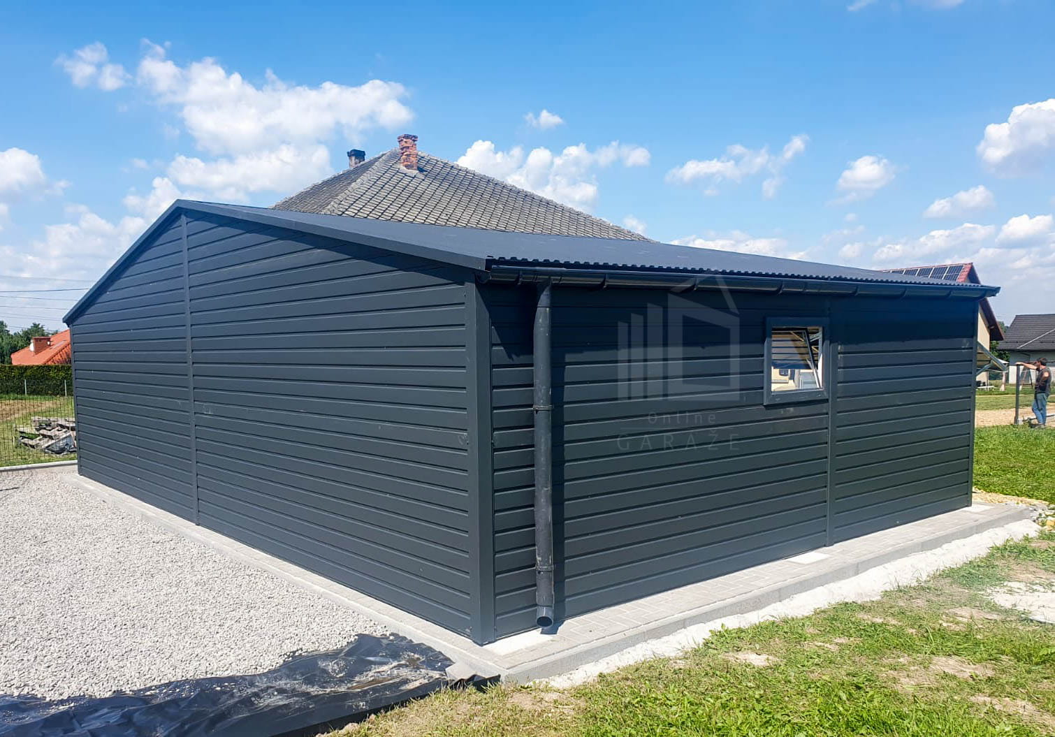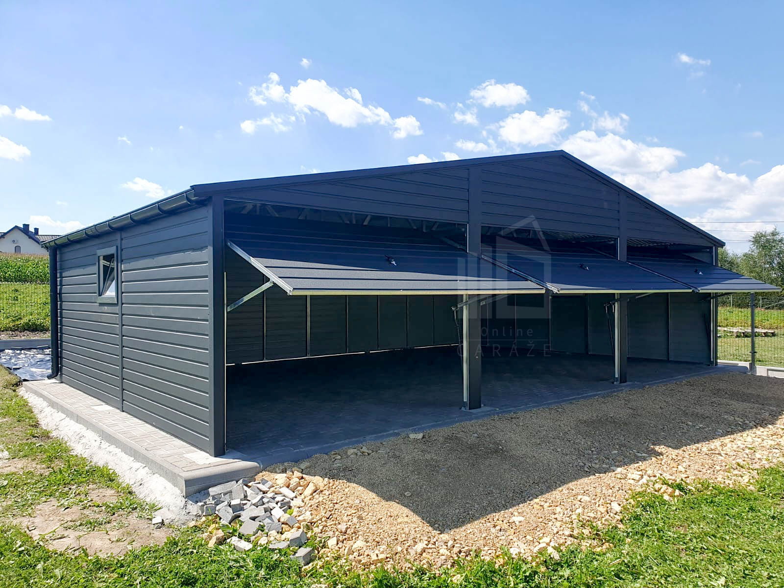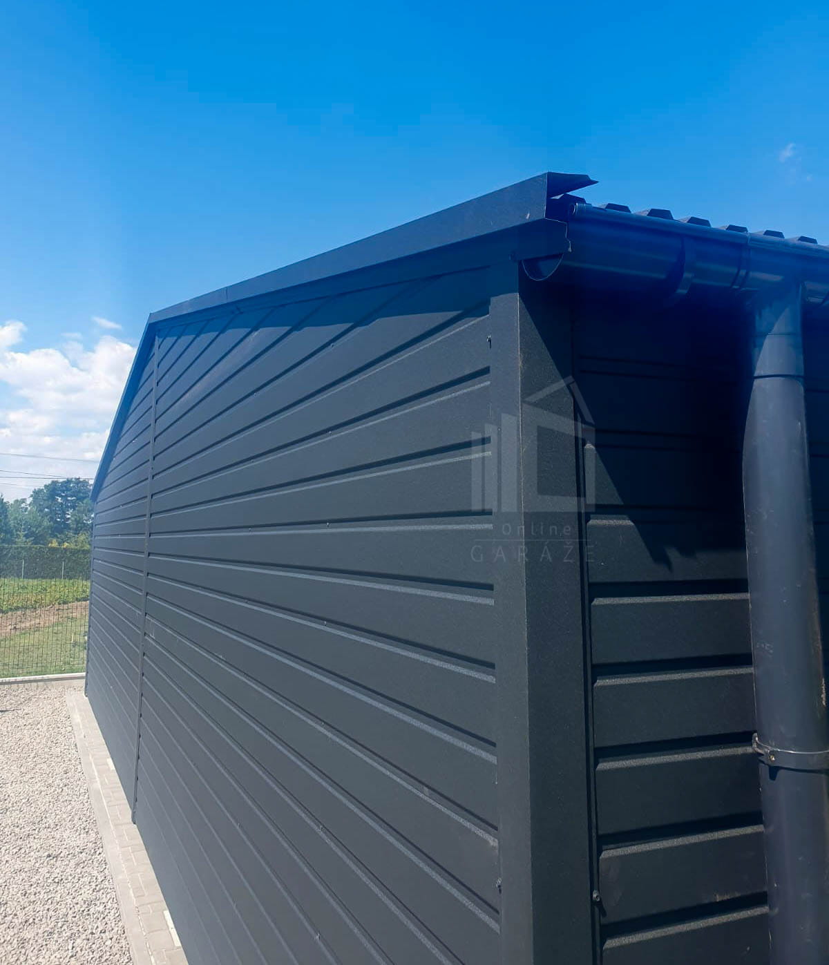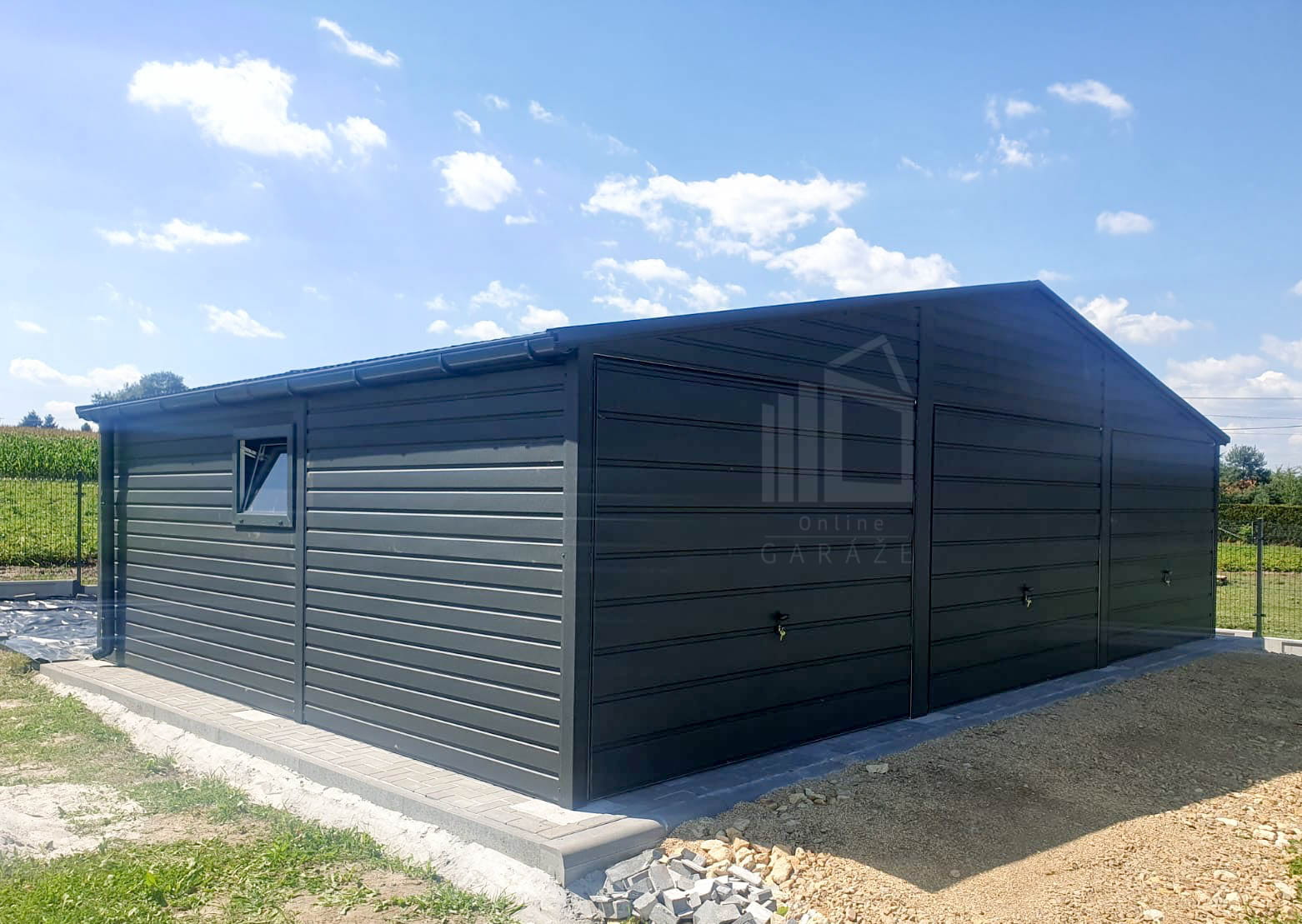 Plechová garáž 9×6 – dvojspádová (sedlová) strecha – 3x výklopná brána + okno + rýna okapová – antracit TS491