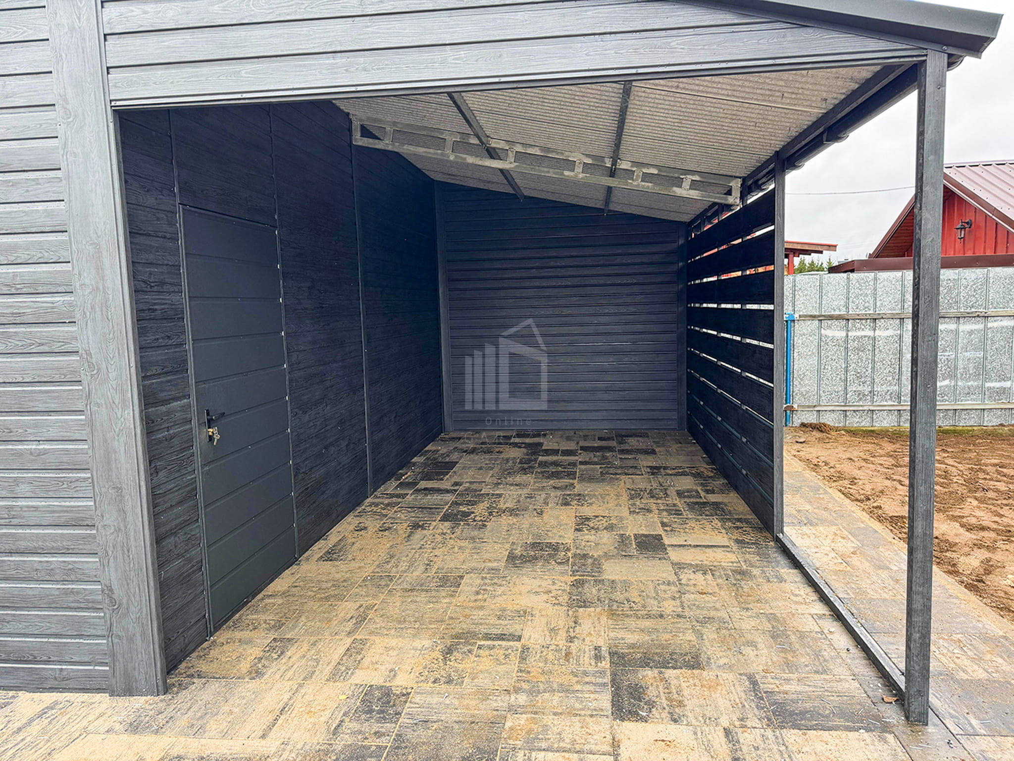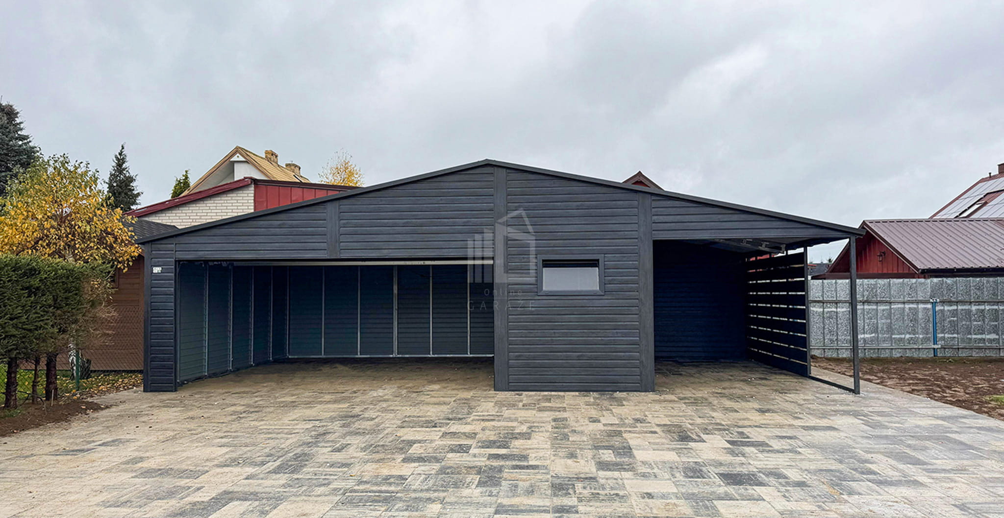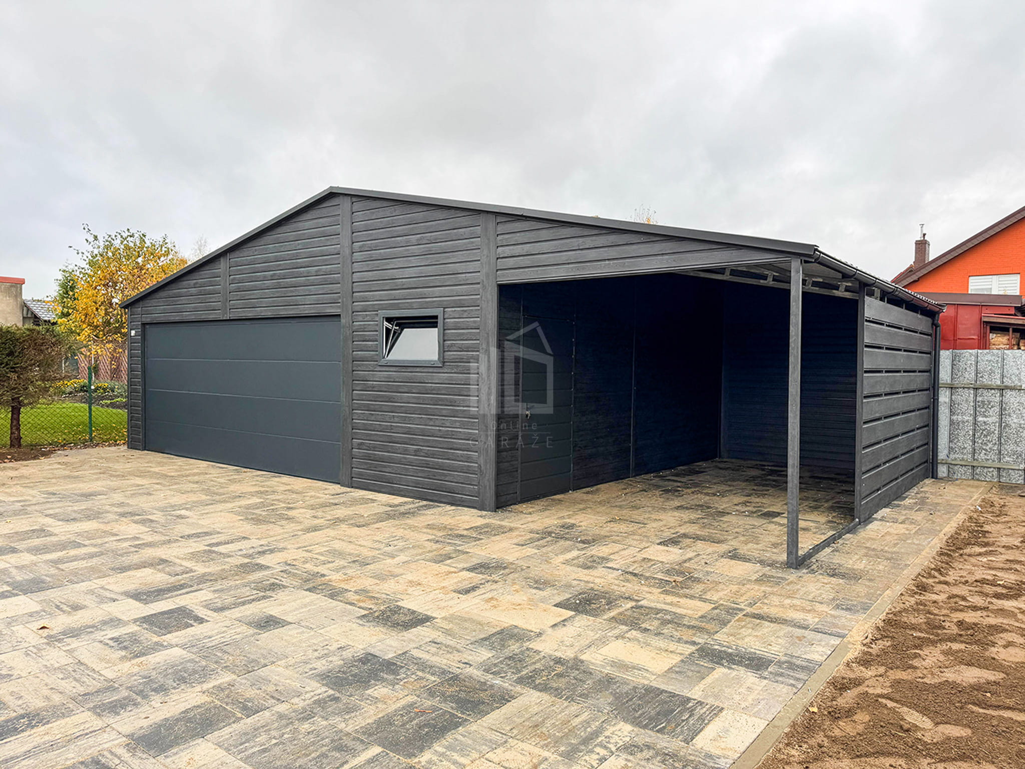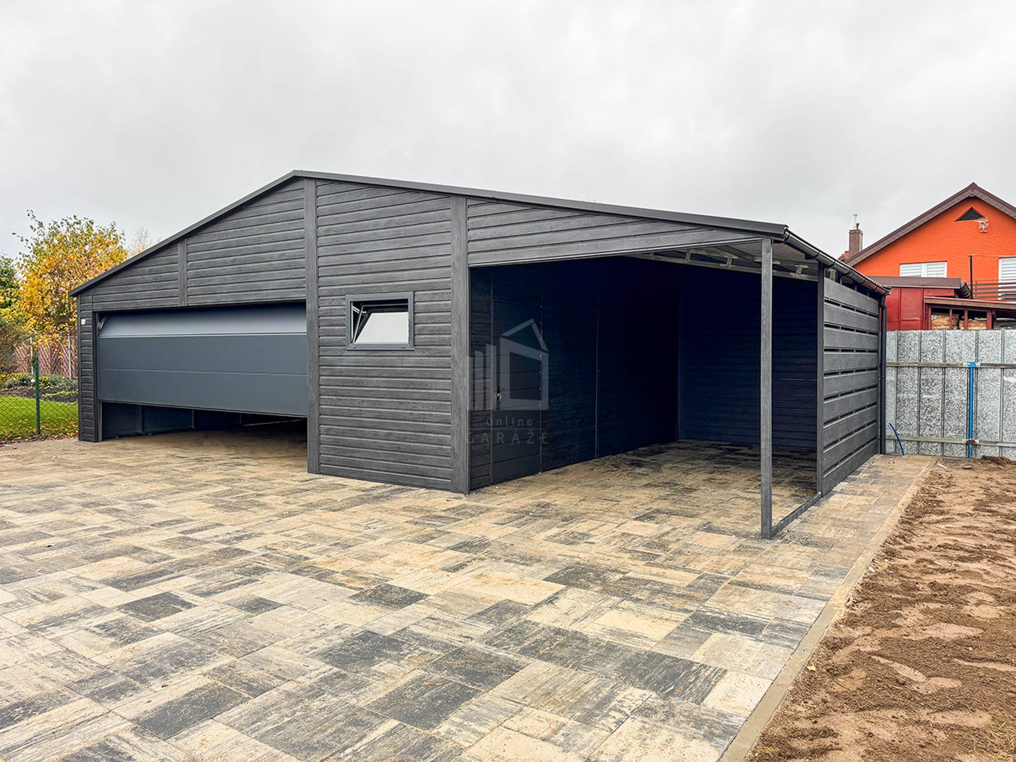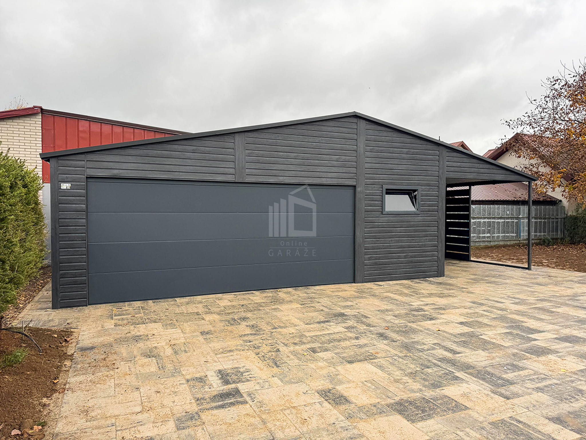 Plechová garáž PREMIUM 8x6m + prístrešok 3×6 – sekčná brána – dvere – okno – nórska borovica – antracit – imitácia dreva – rýna okapová – Strecha dvojspádová (sedlová) TS978
