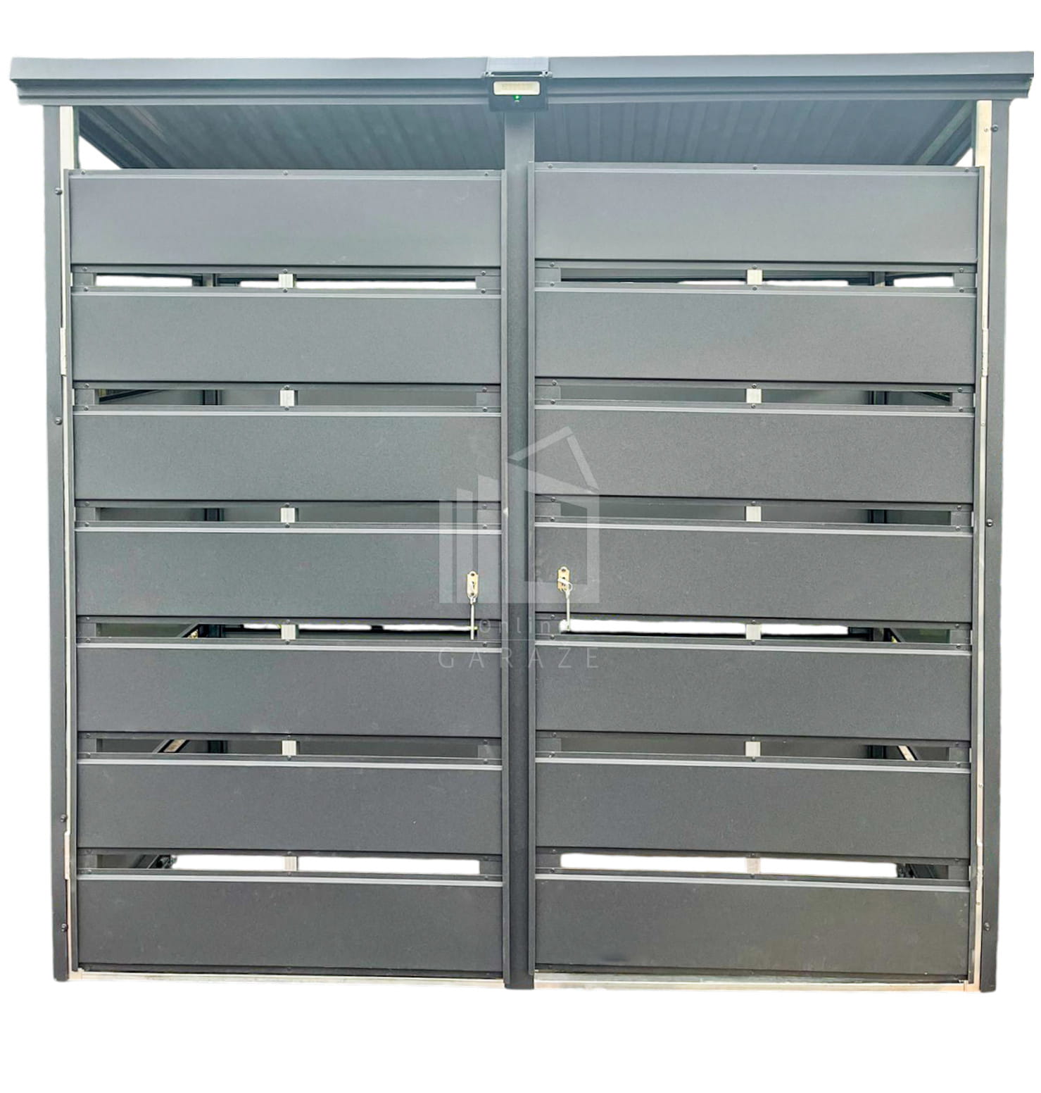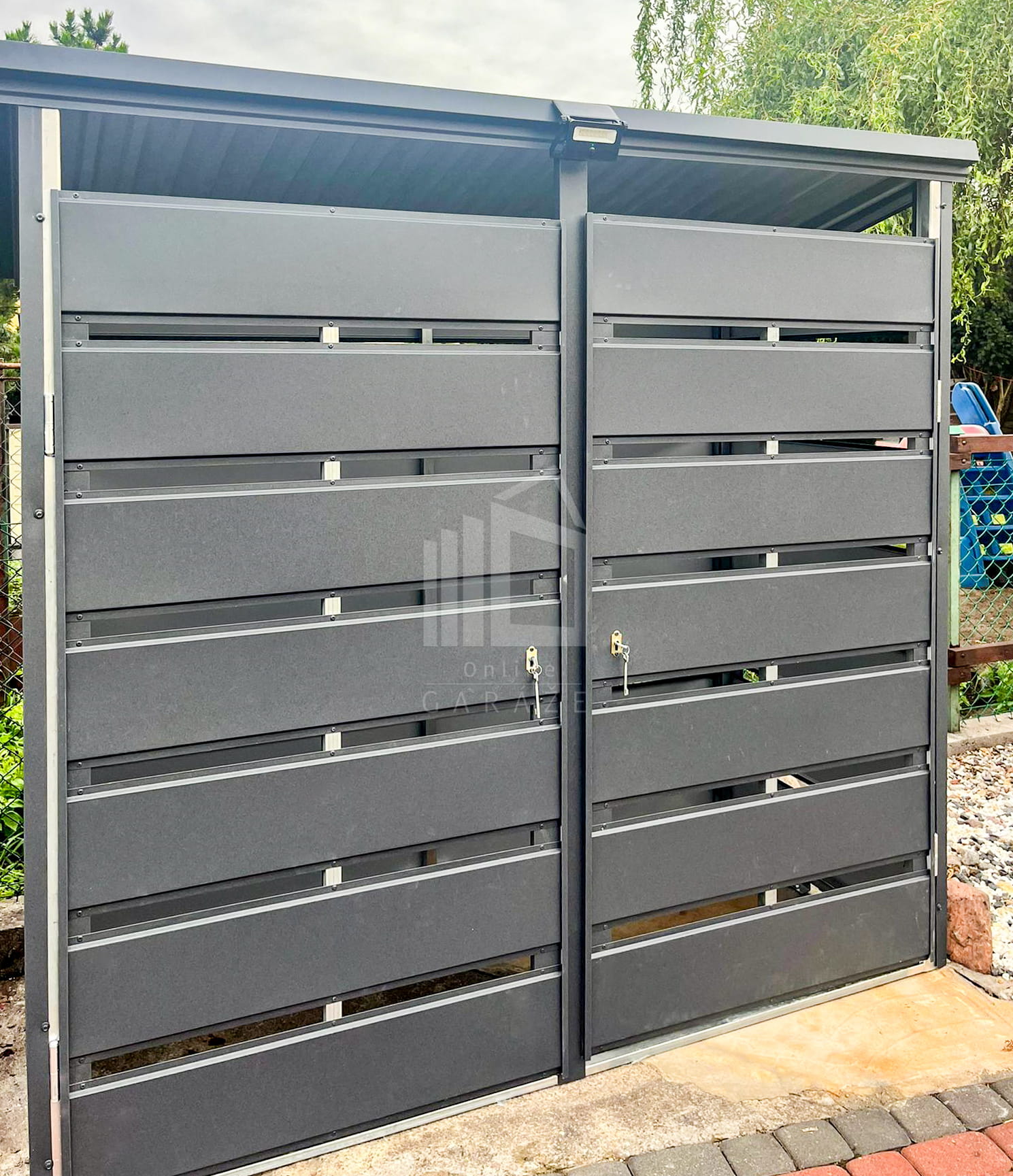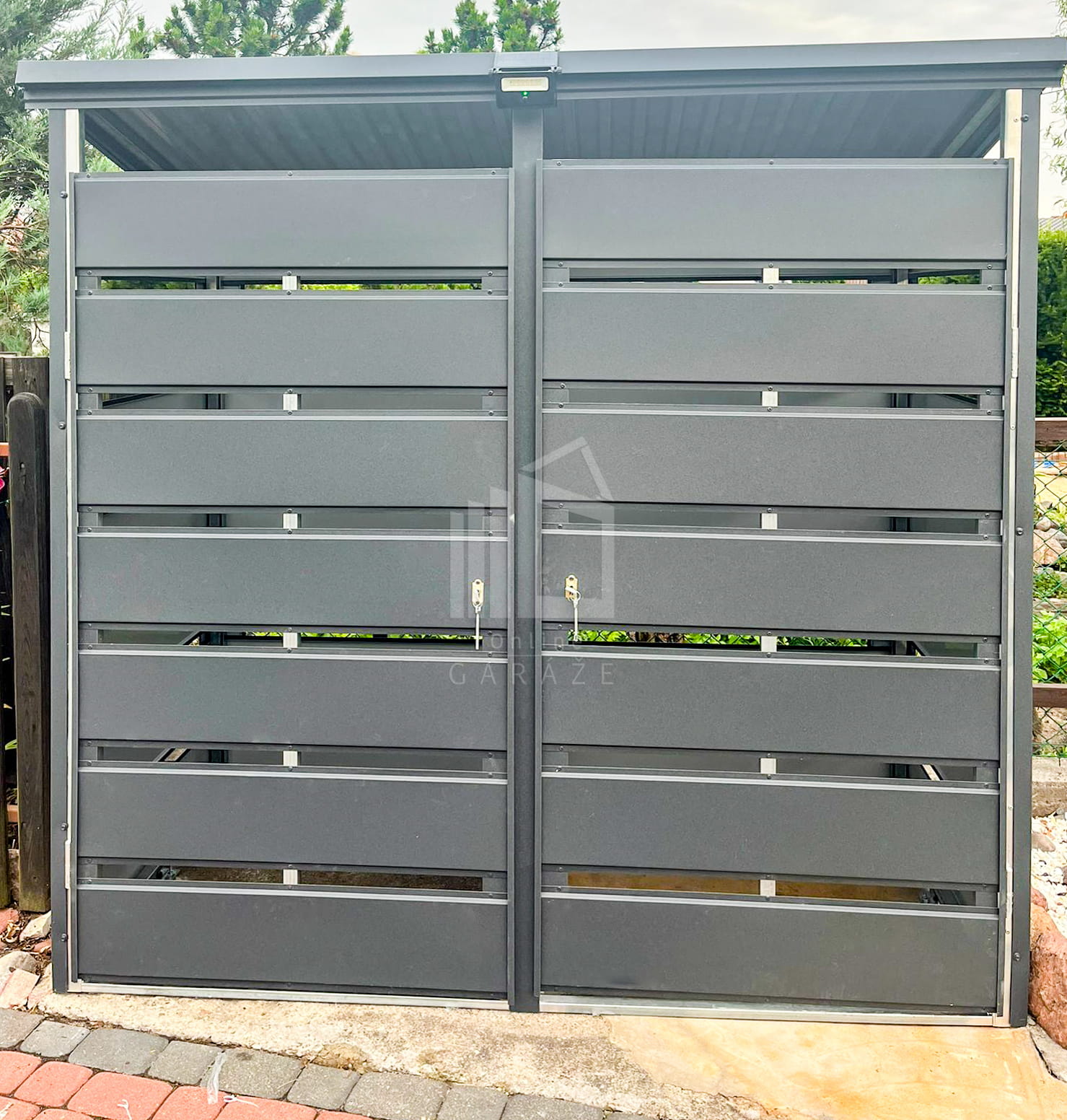 Prístrešok na smetné koše 2×1 m – 2x dvere – zabudovaný vodorovnými lamelami (panelmi) – antracit – strecha spád dozadu TS892
