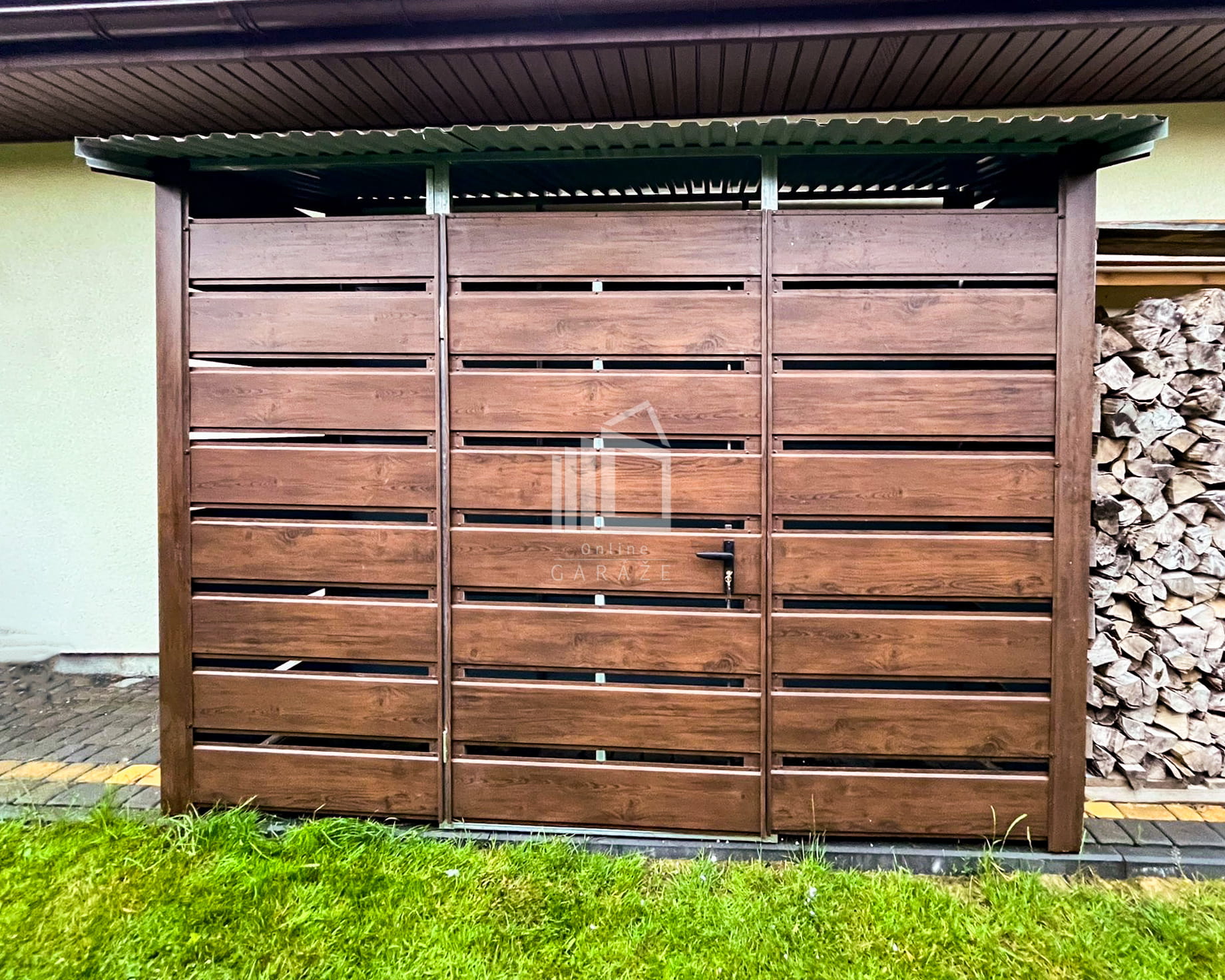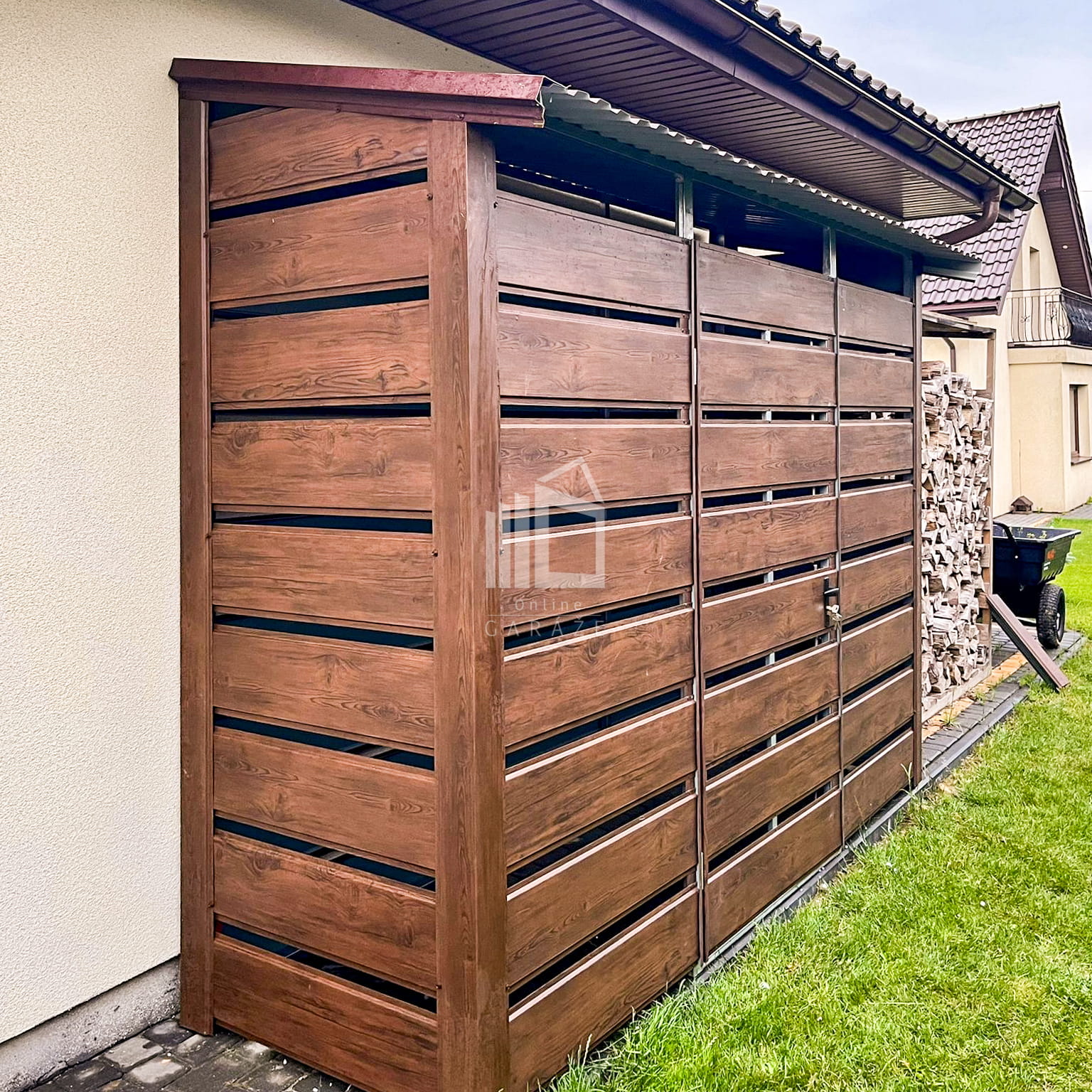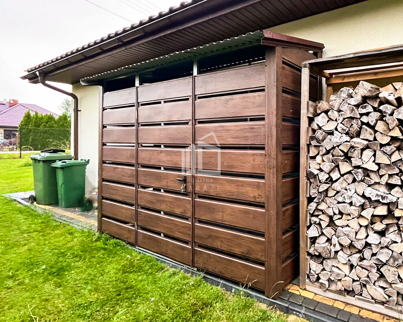 Prístrešok na smetné koše – Záhradný domček 3×0,8 m – zabudovaný vodorovnými lamelami (panelmi) – dvere – orech tmavý – imitácia dreva – strecha spád dopredu TS893