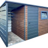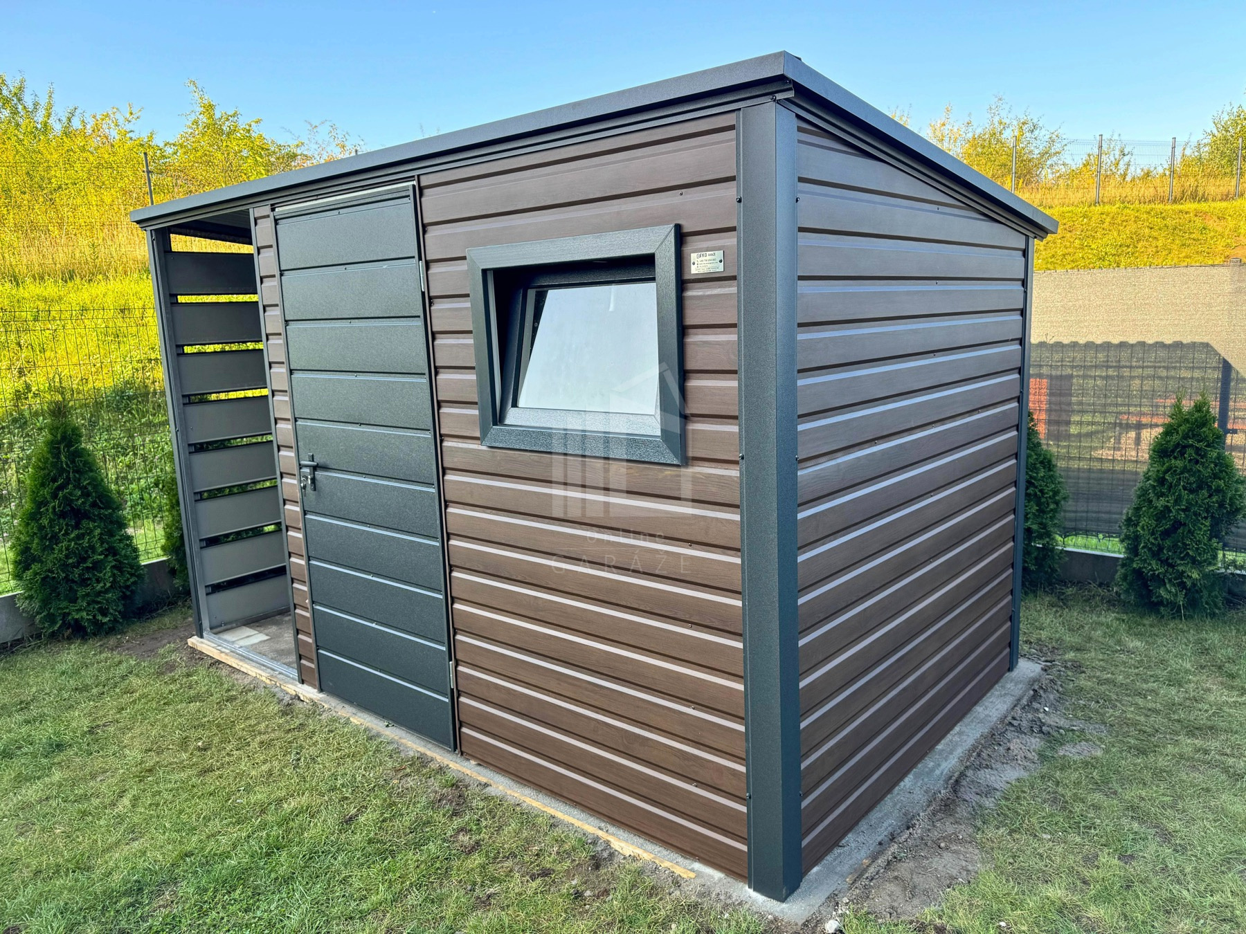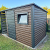 Záhradný domček 2,5x2m – prístrešok 1m – dvere – okno – orech tmavý – imitácia dreva – strecha spád dozadu ID1103