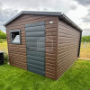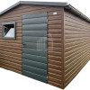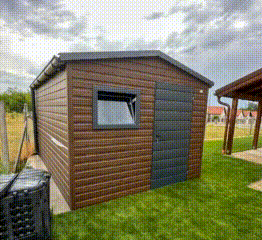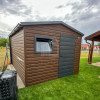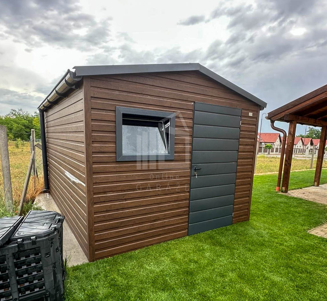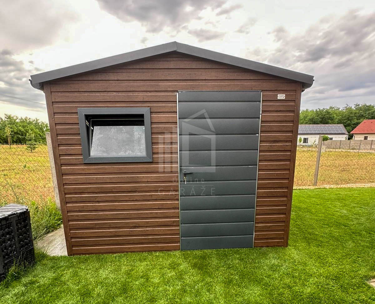 Záhradný domček 2,7×3,5m – dvere – okno – orech tmavý – imitácia dreva – strecha dvojspádová (sedlová) – rýna okapová TS1125