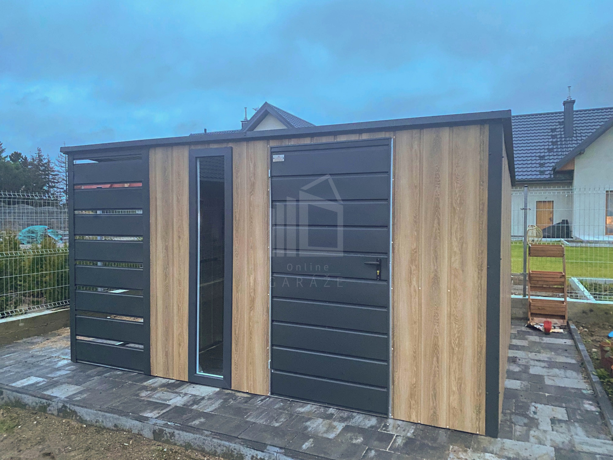 Záhradný domček 3×3 – prístrešok 1×3 – dvere – okno – antracit BTX 7016 – strecha spád dozadu ST224