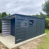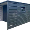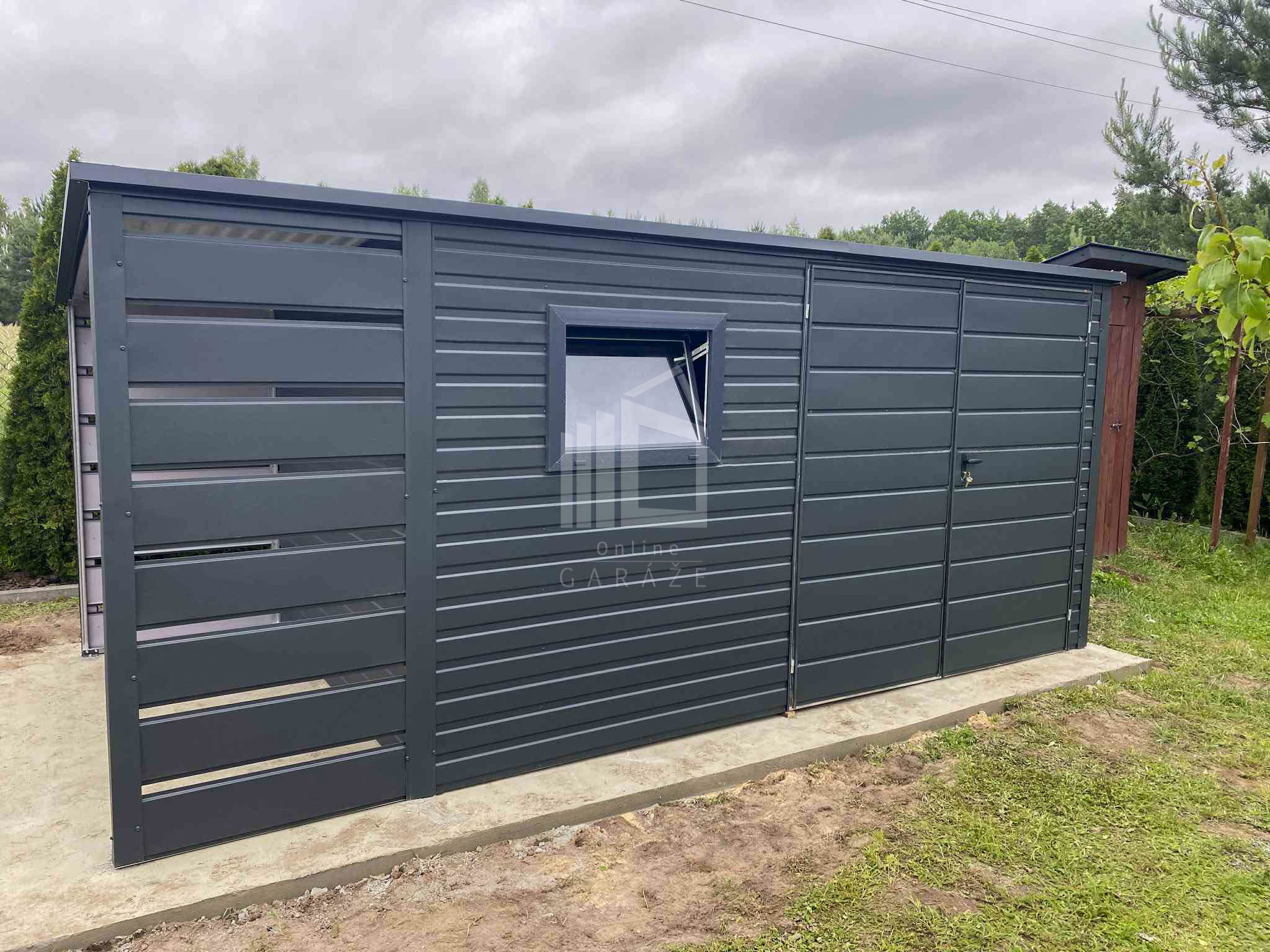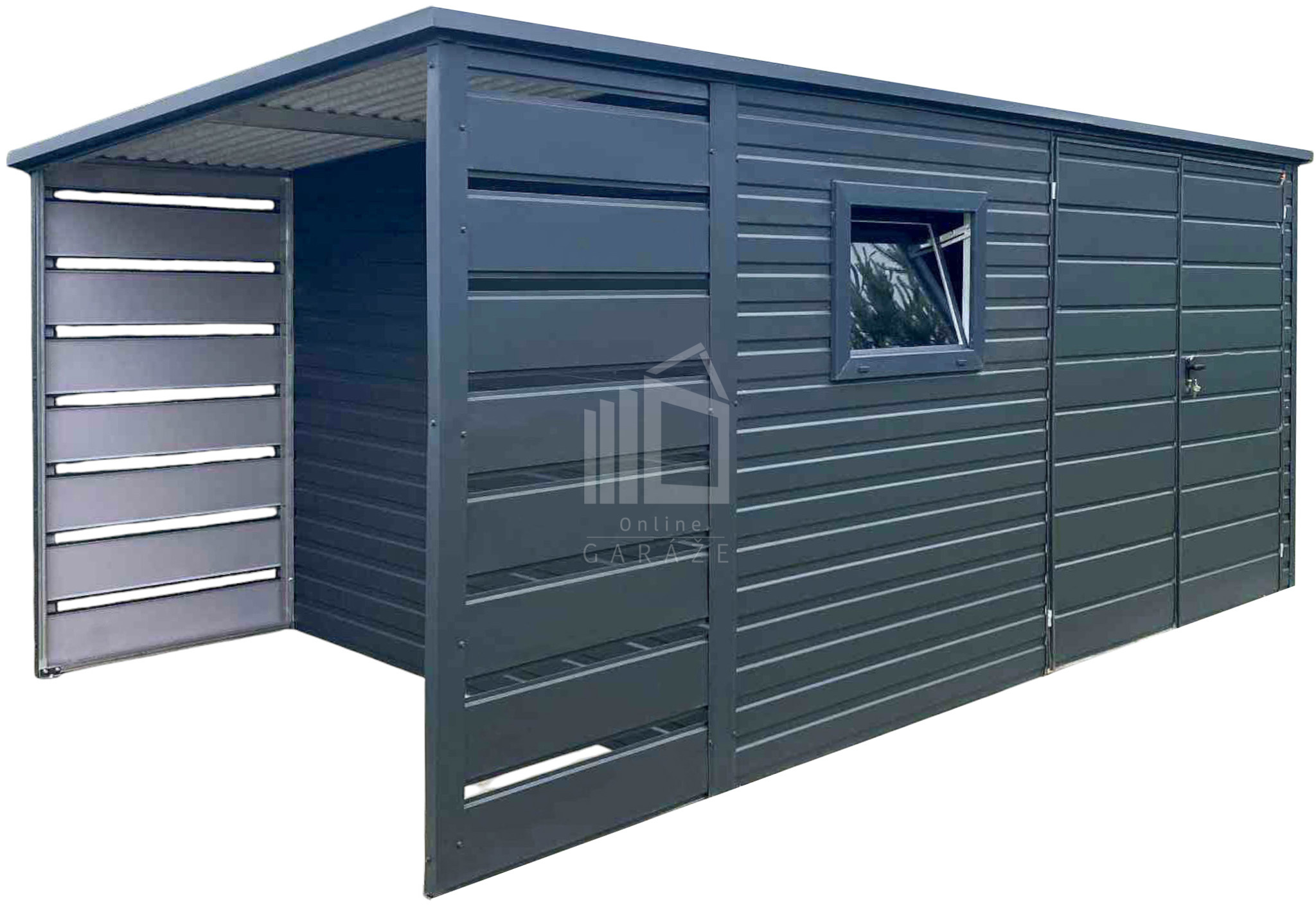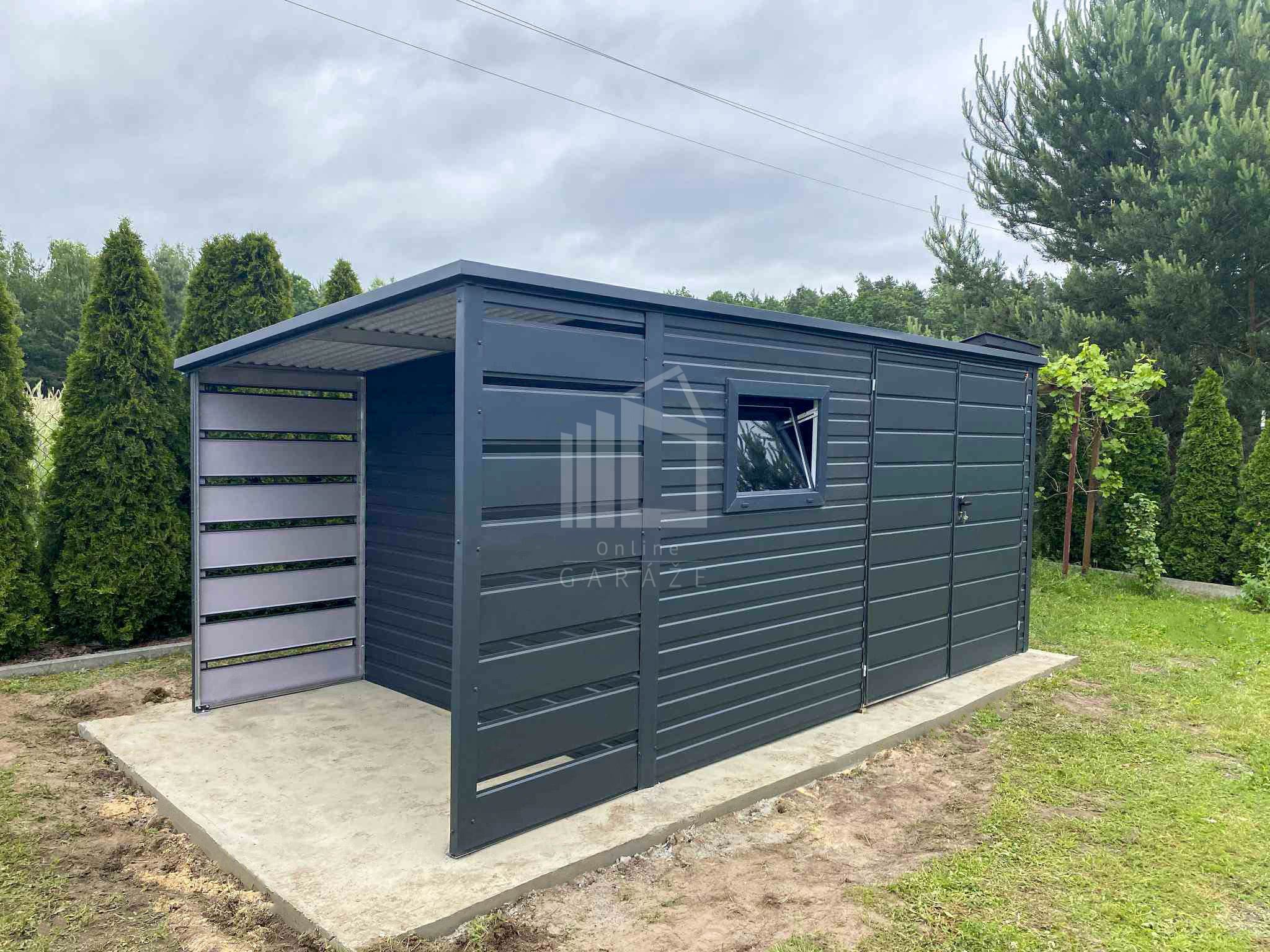 Sklad – Záhradný domček 4×2,5 m – prístrešok 1×2,5 m – brána – okno – antracit – strecha so spádom dozadu PLG164