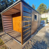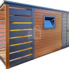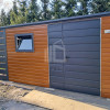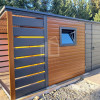 Záhradný domček 4×2,5m + prístrešok 1m – Dvojkrídlové dvere – orech svetlý – výklopné okno – imitácia dreva – strecha spád dozadu TS1102