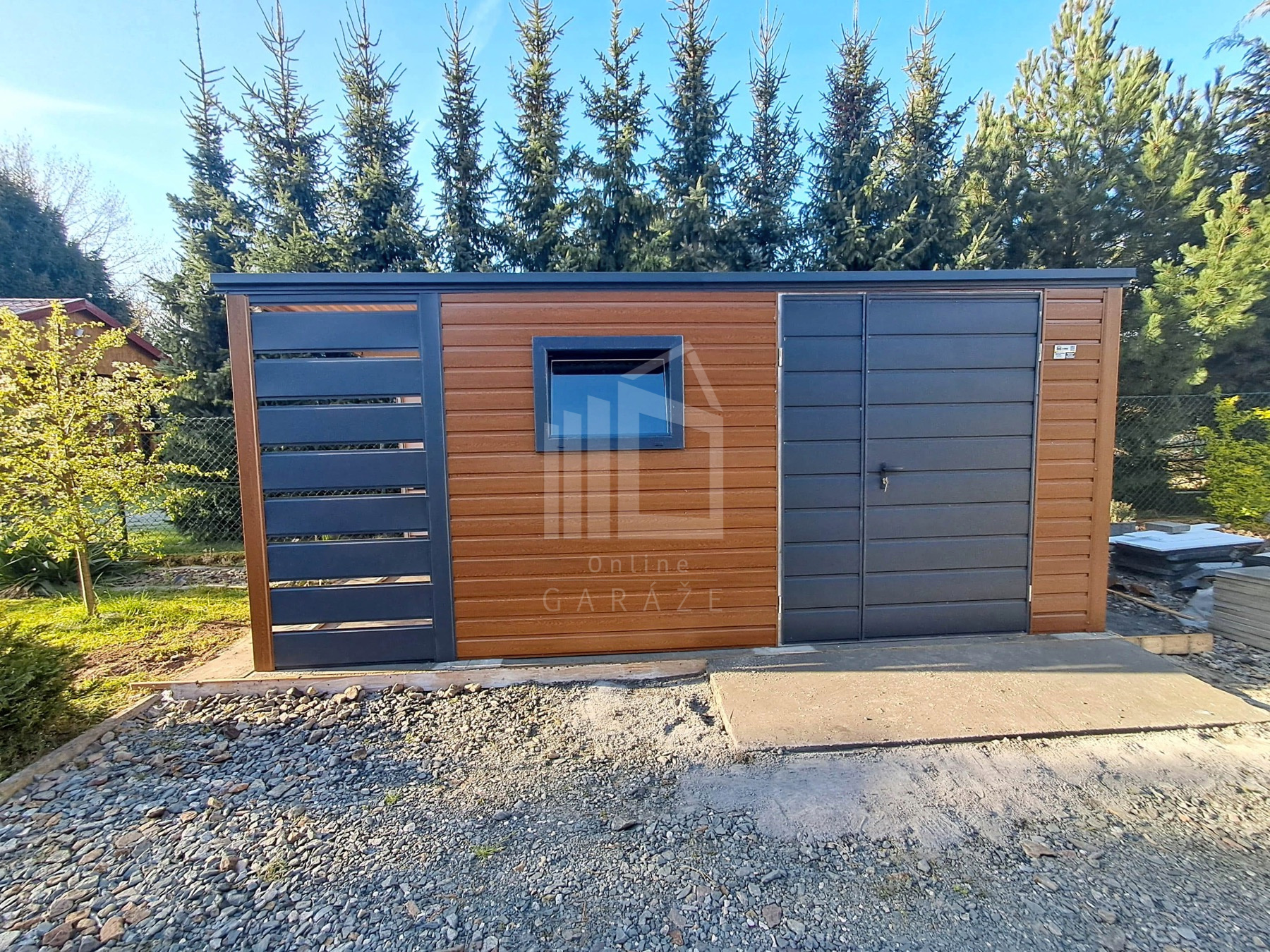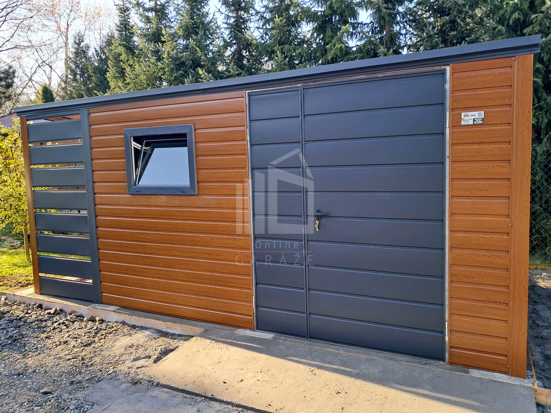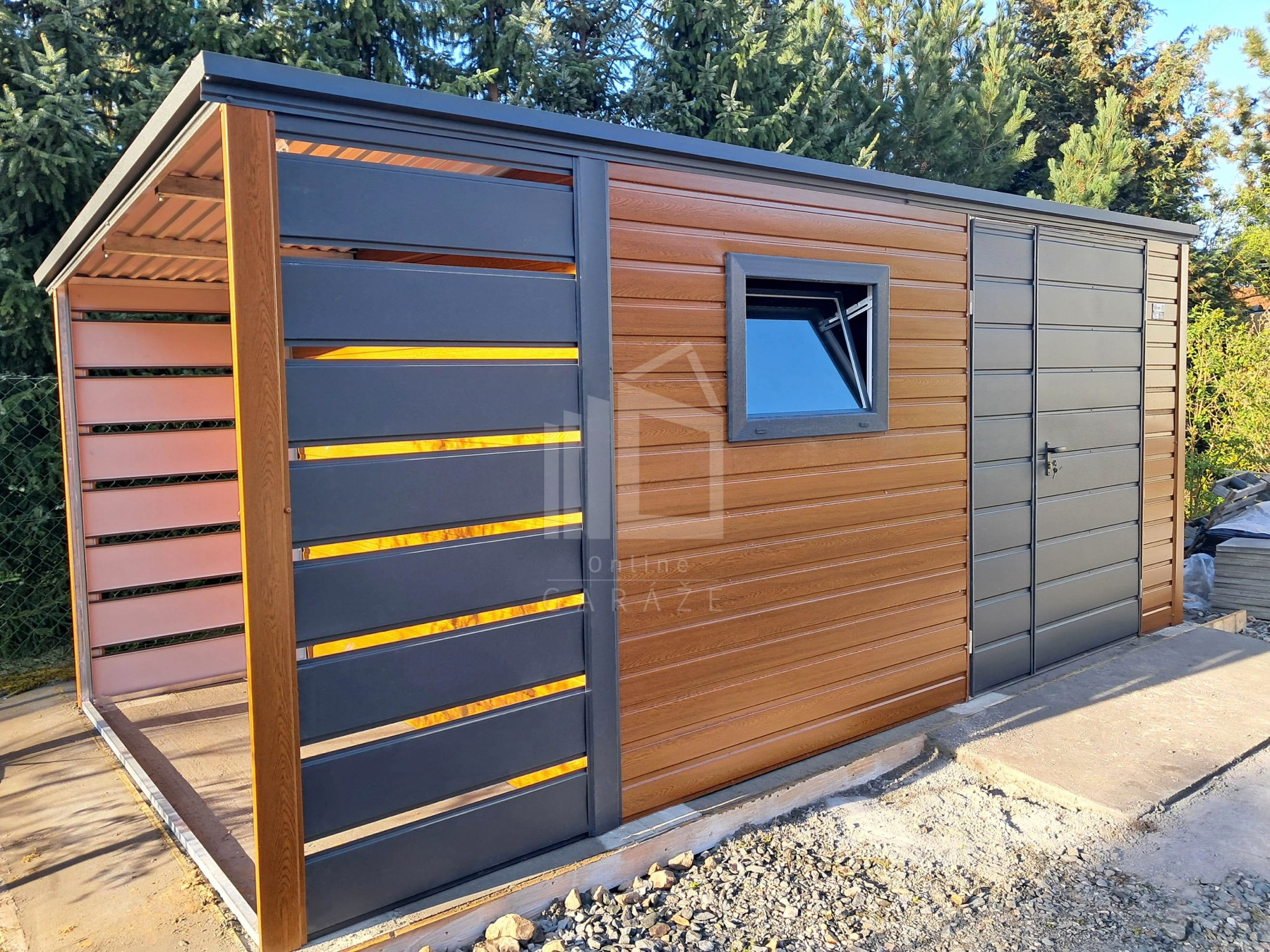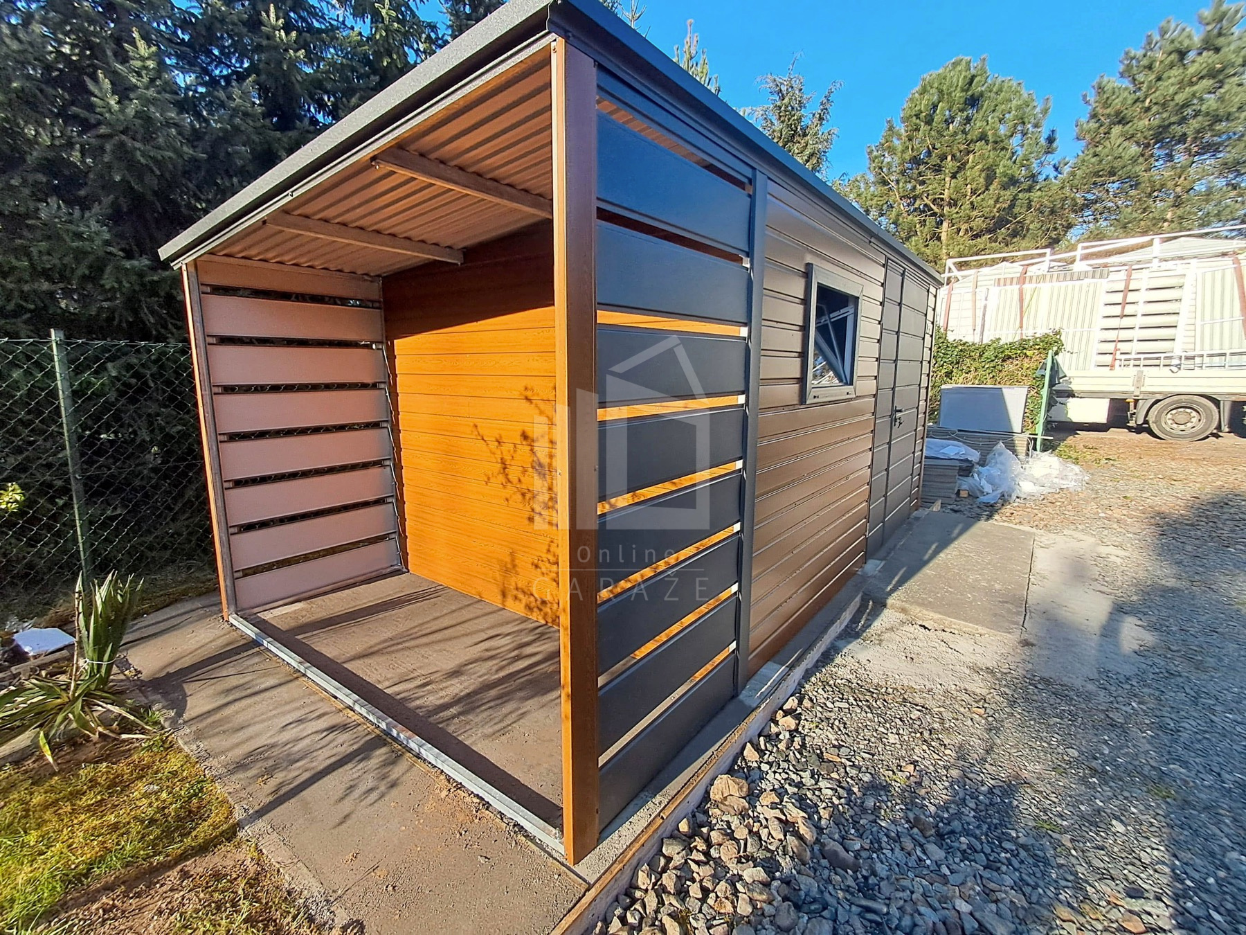 • prístrešok : 1×2,5 m predná a zadná stena z vodorovných lamiel (panelov) farba: antracit mat BTX 7016