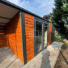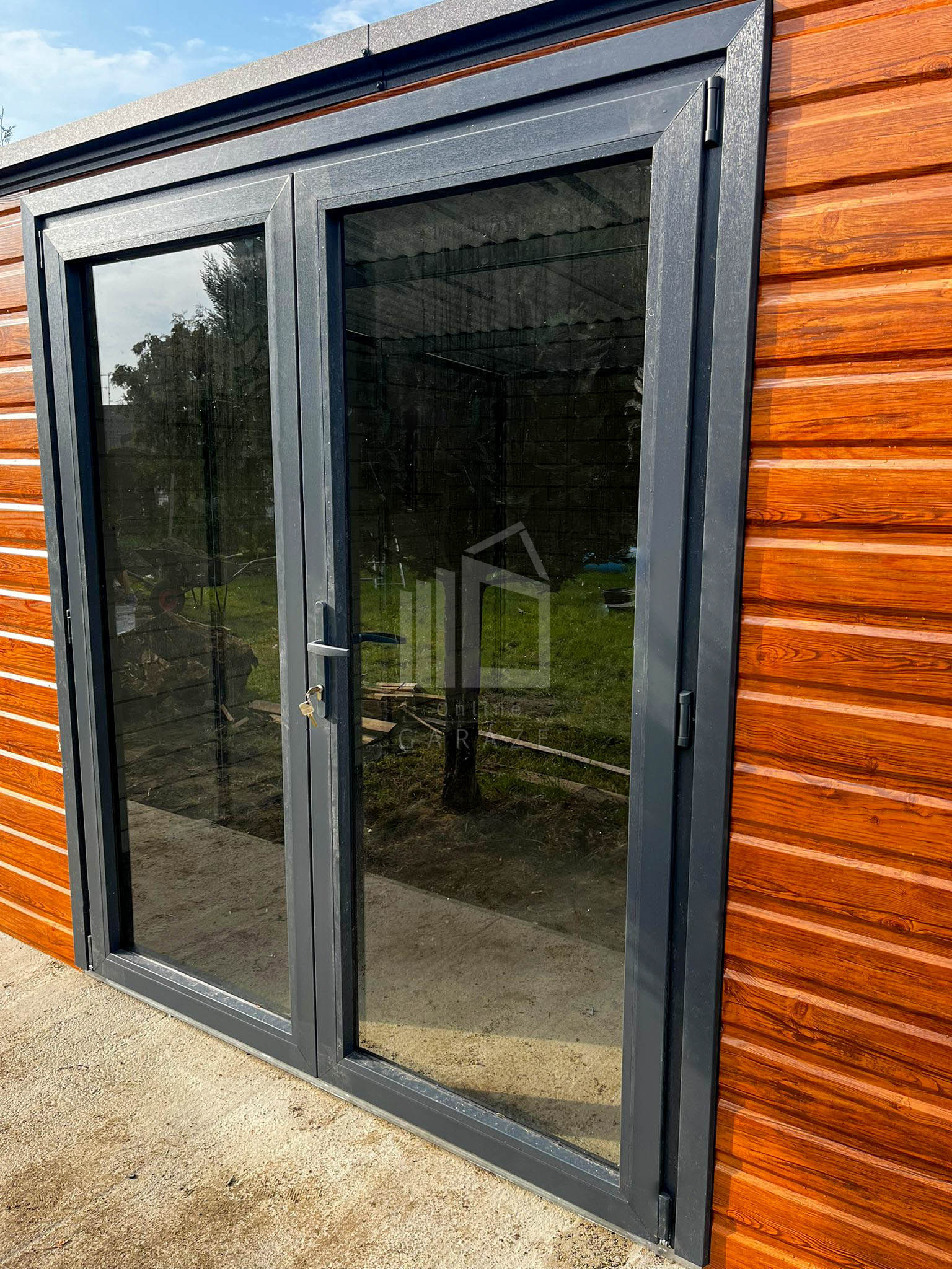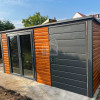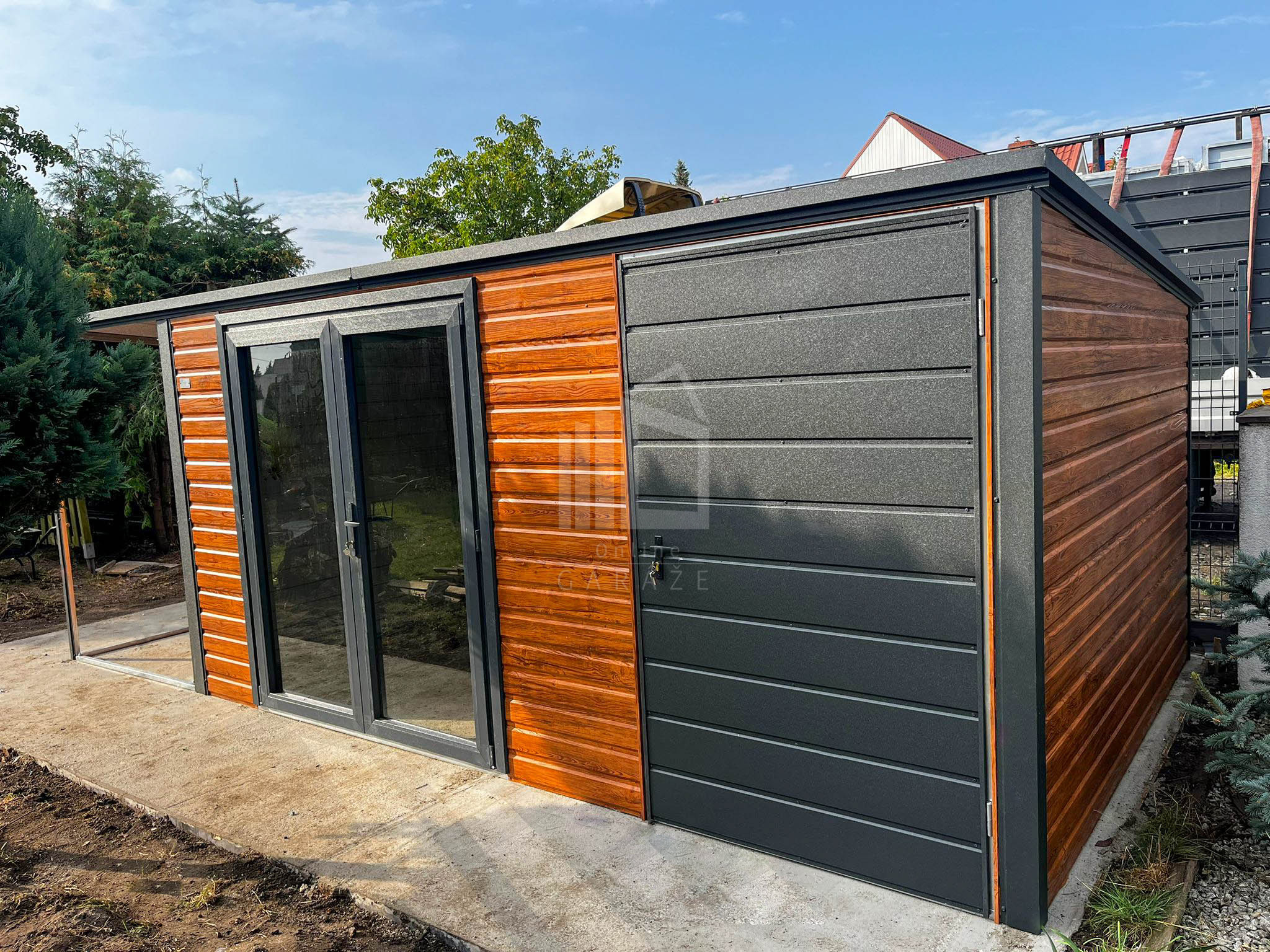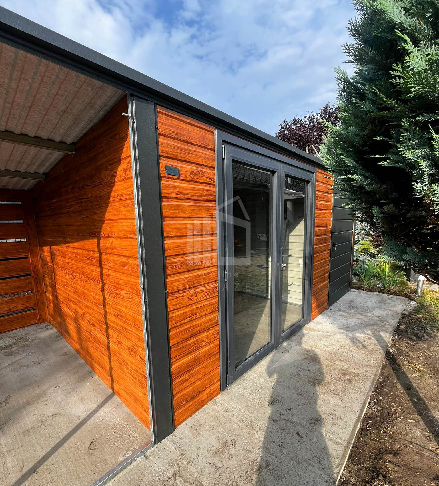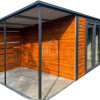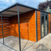 Záhradný domček 4x3m – prístrešok 1,5m – dvere PCV – dvere – zlatý dub – imitácia dreva – antracit BTX 7016 – spád dozadu TS1214