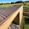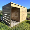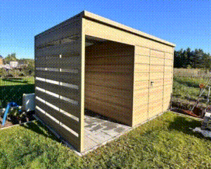 • prístrešok : 1,5×2 m zadná stena pokryté plechom, bočná stena – vodorovné lamely (panely) farba : imitácia dreva – winchester