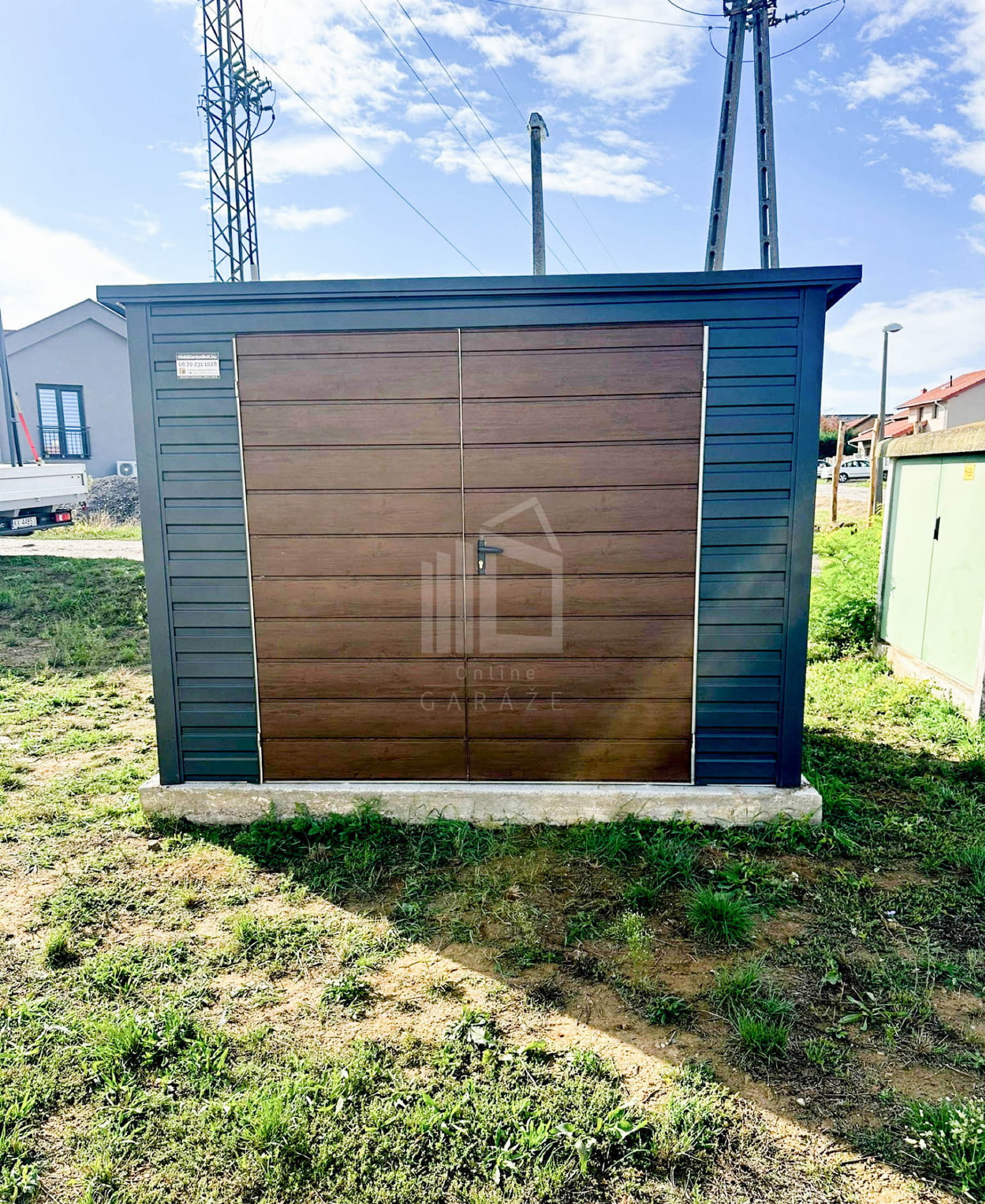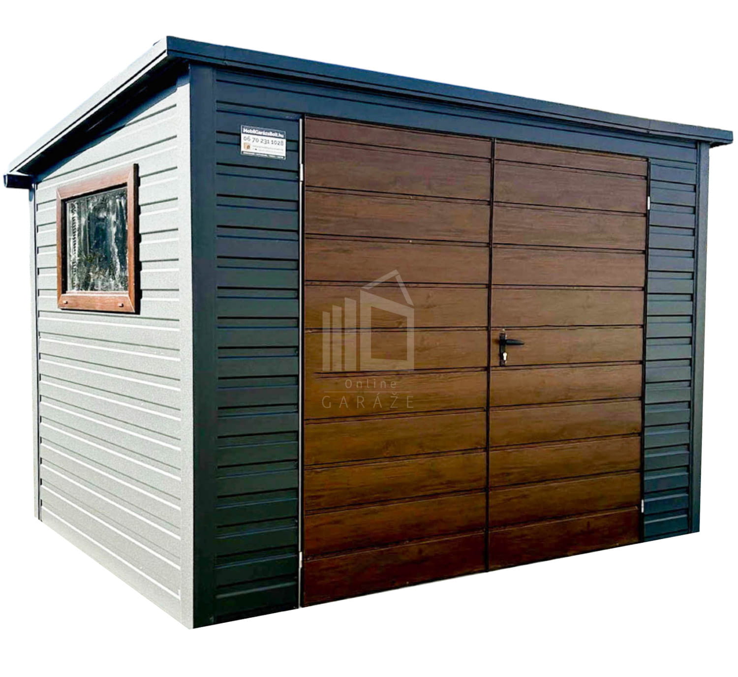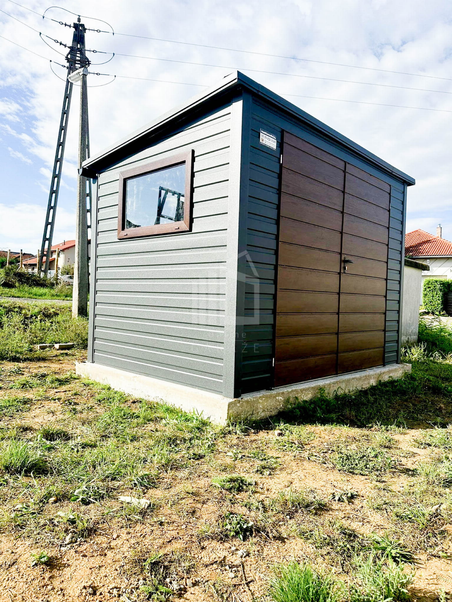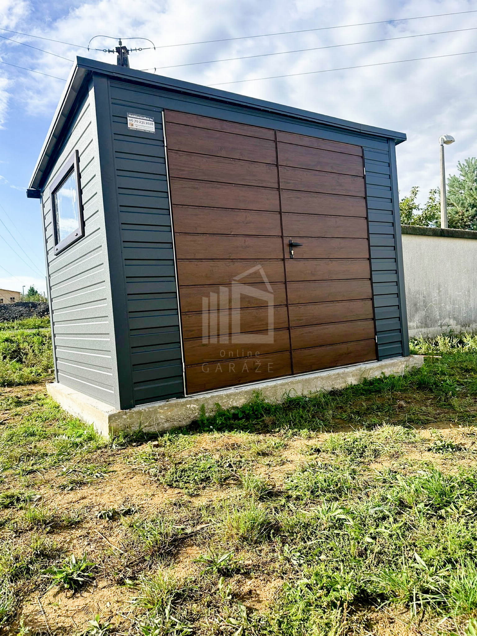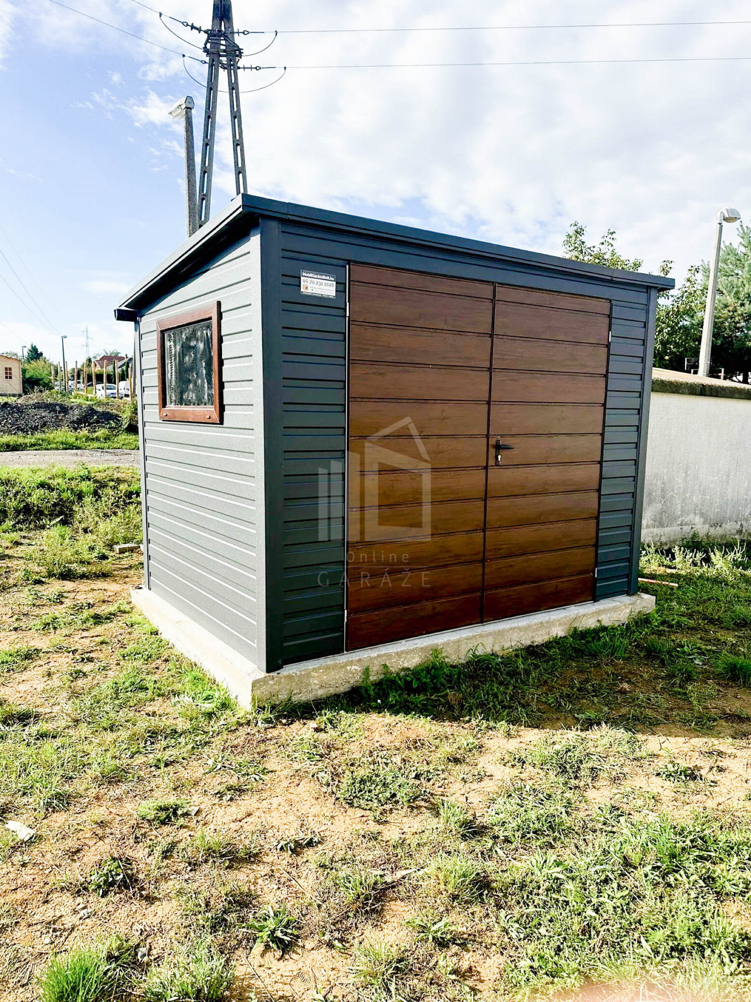 Záhradný domček 2,5x2m – Dvojkrídlové dvere – Okno – Antracit – Orech tmavý – Imitácia dreva – Strecha spád dozadu TS864