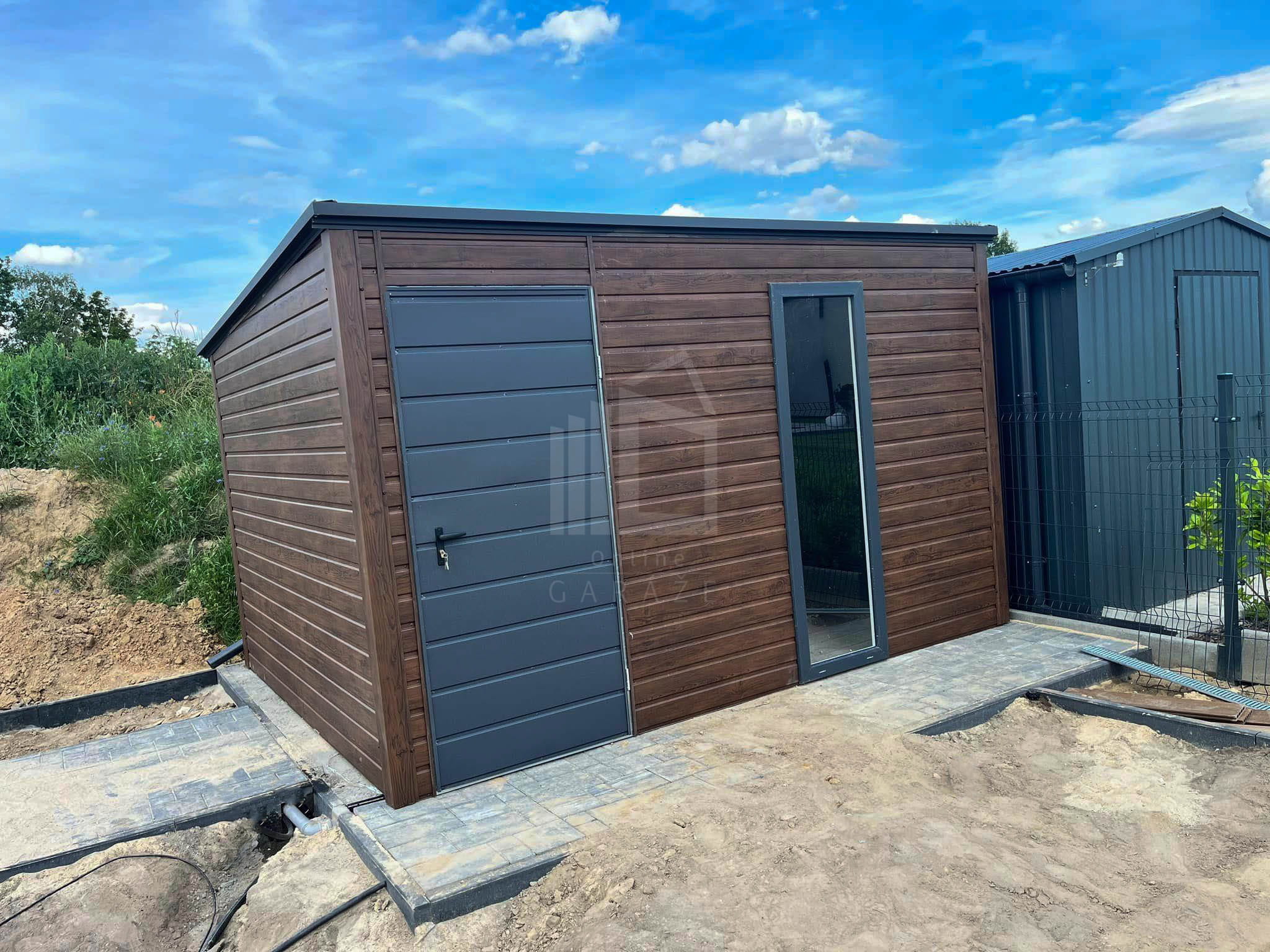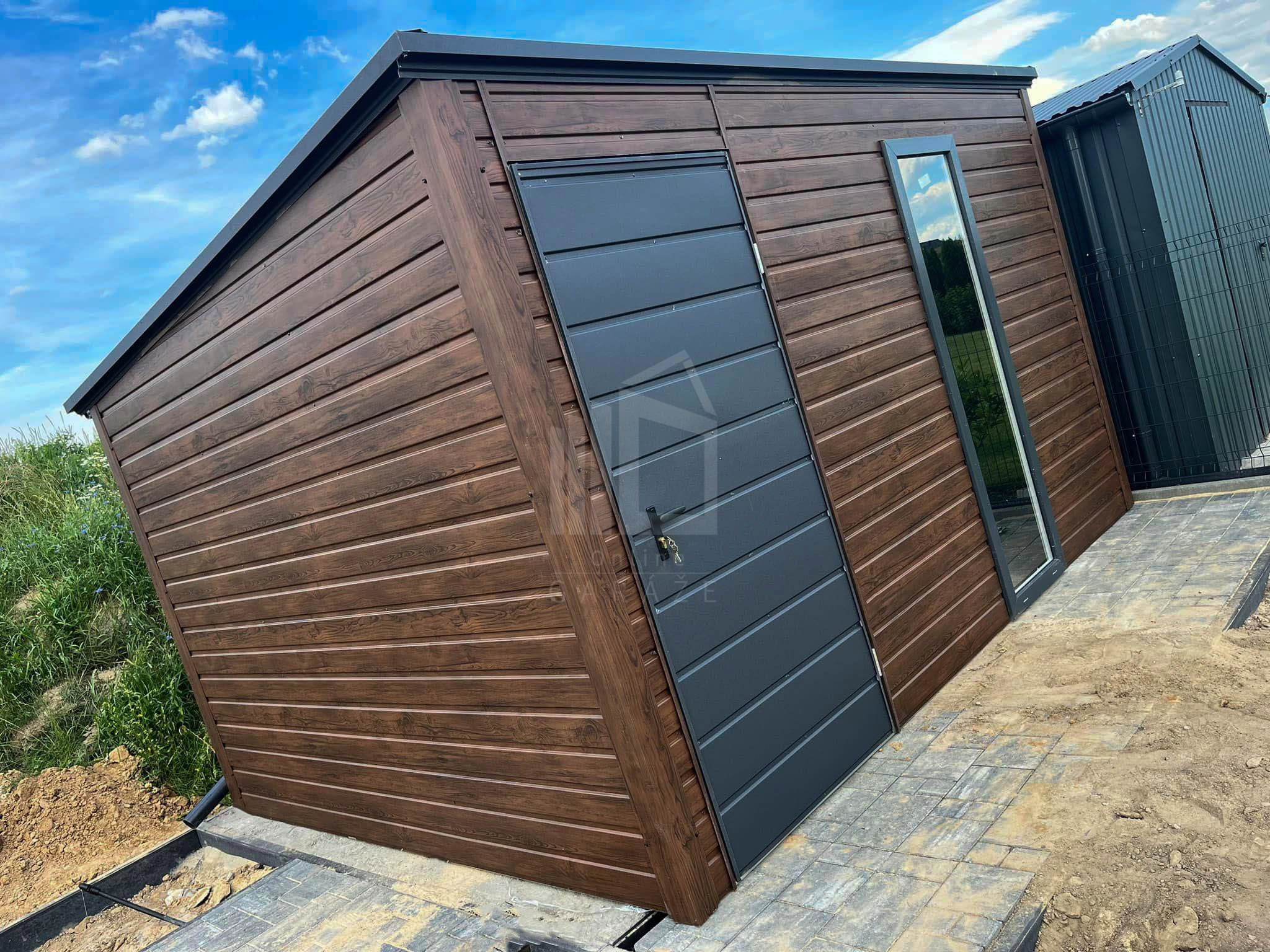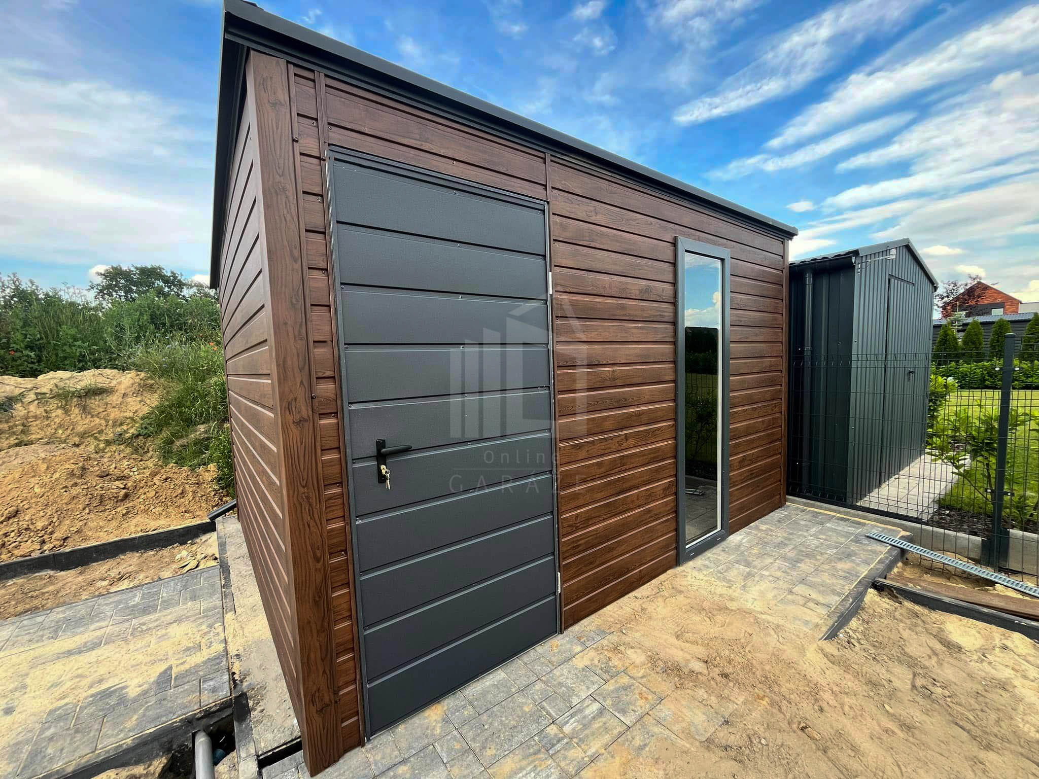 Záhradný domček 3,5×2,5m – dvere – okno – orech tmavý – imitácia dreva – strecha spád dozadu – TS824