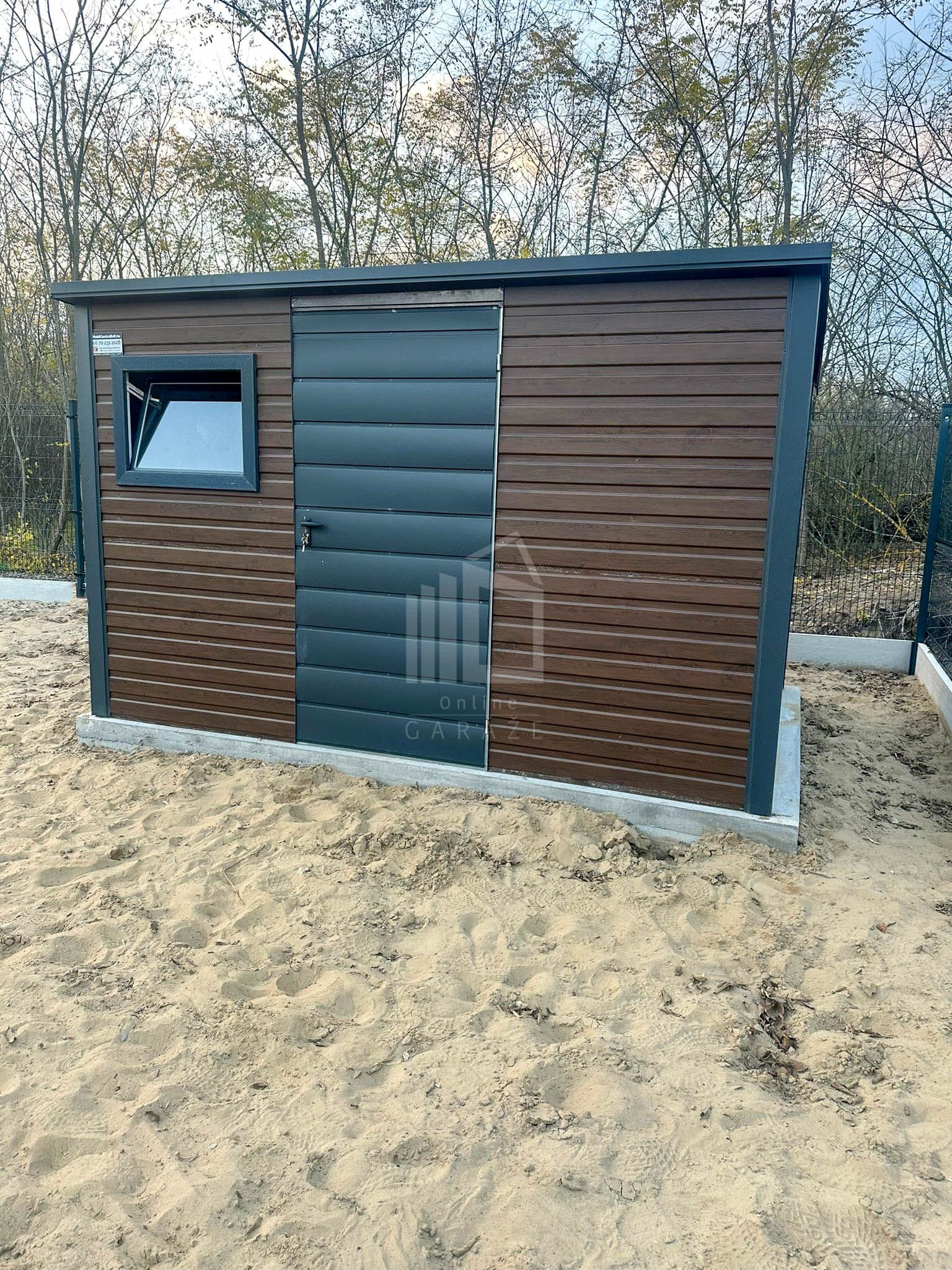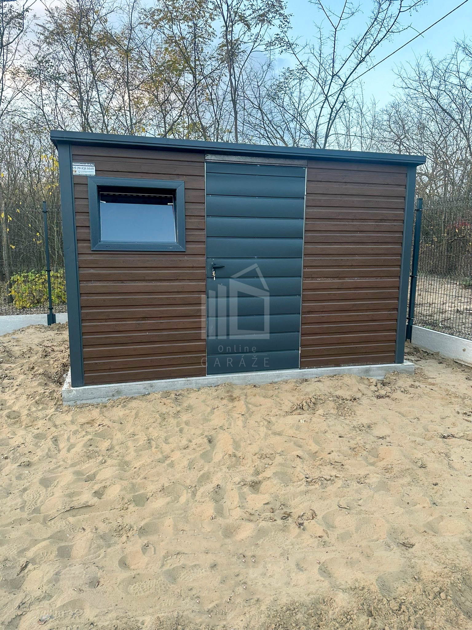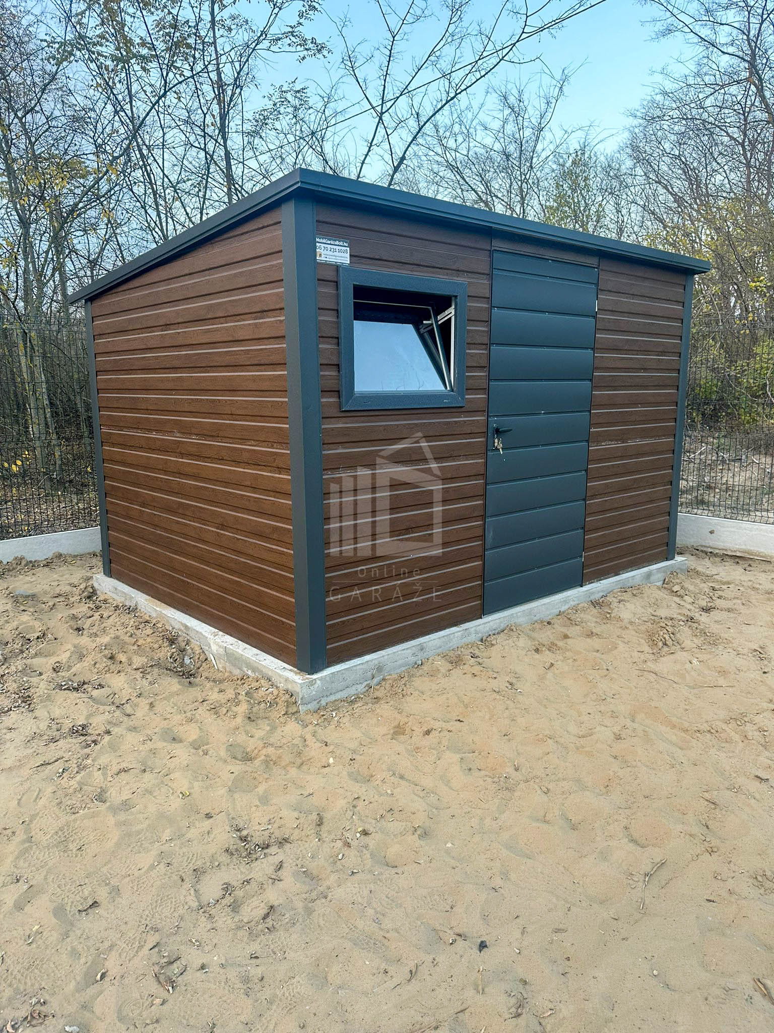 ZÁHRADNÝ DOMČEK 3,5×2,5m – Dvere – Okno – Tmavý orech – Imitácia dreva – Antracit – Strecha spád dozadu TS865