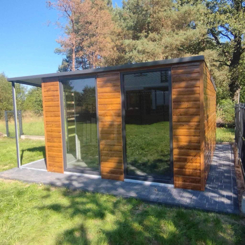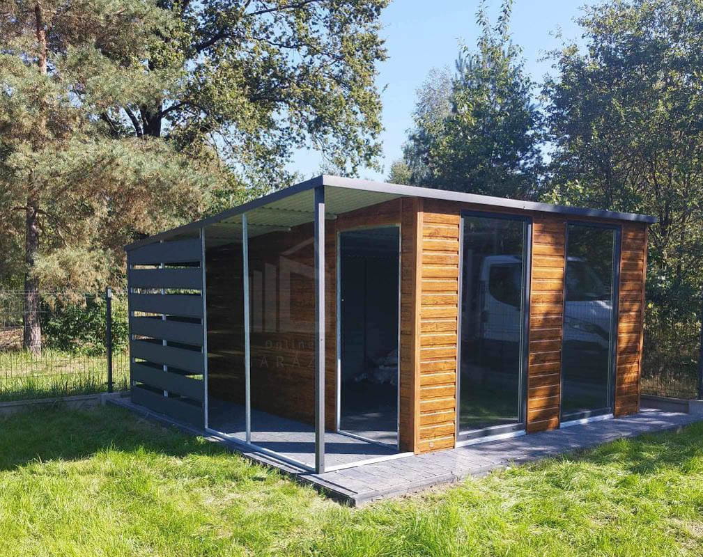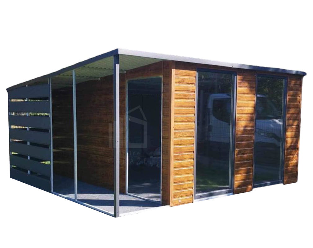 Záhradný domček 3m x 4m + prístrešok 1m, spád dozadu, svetlý orech TS510