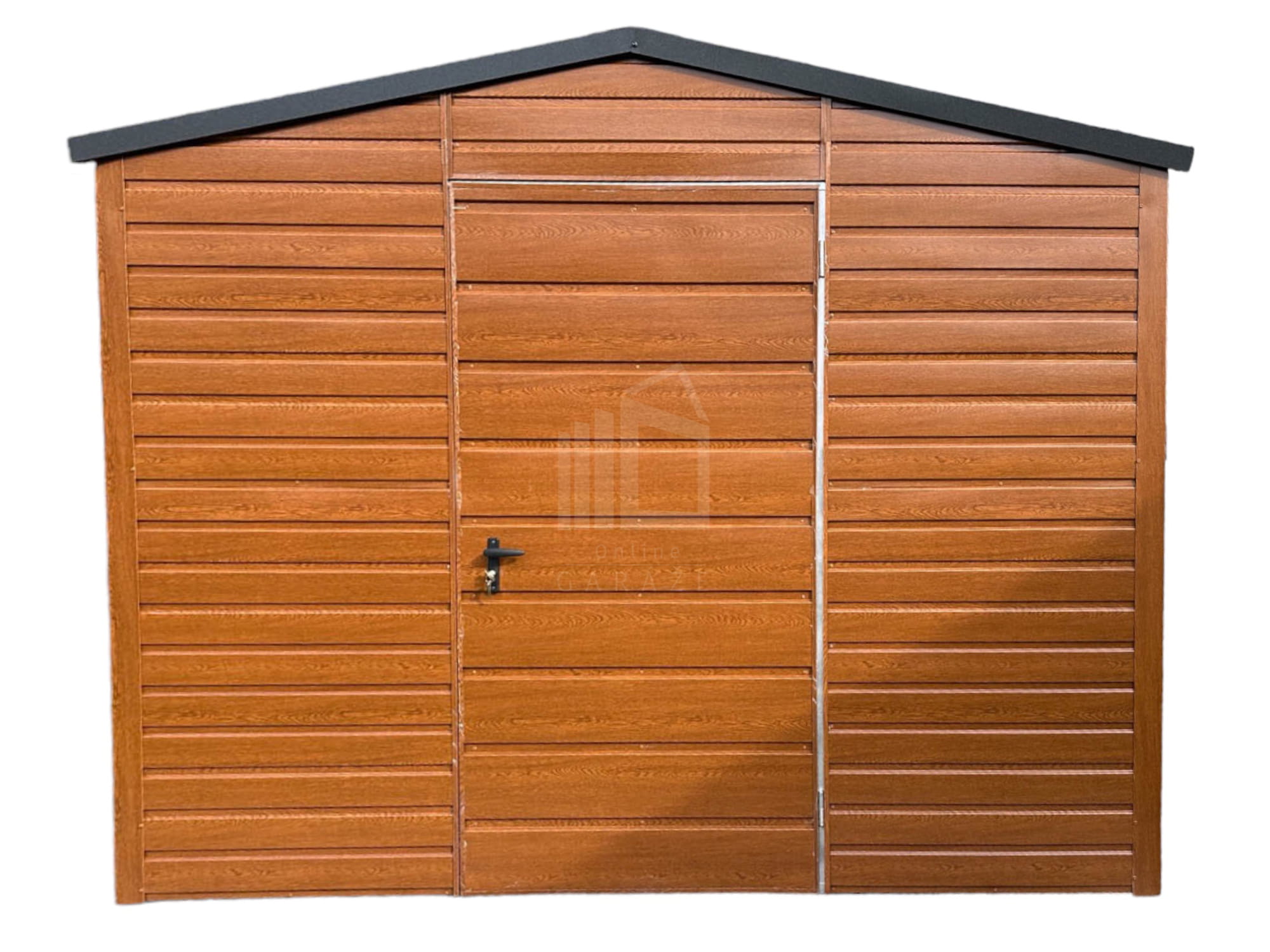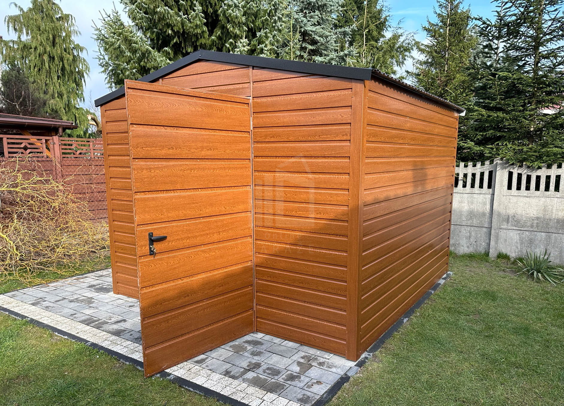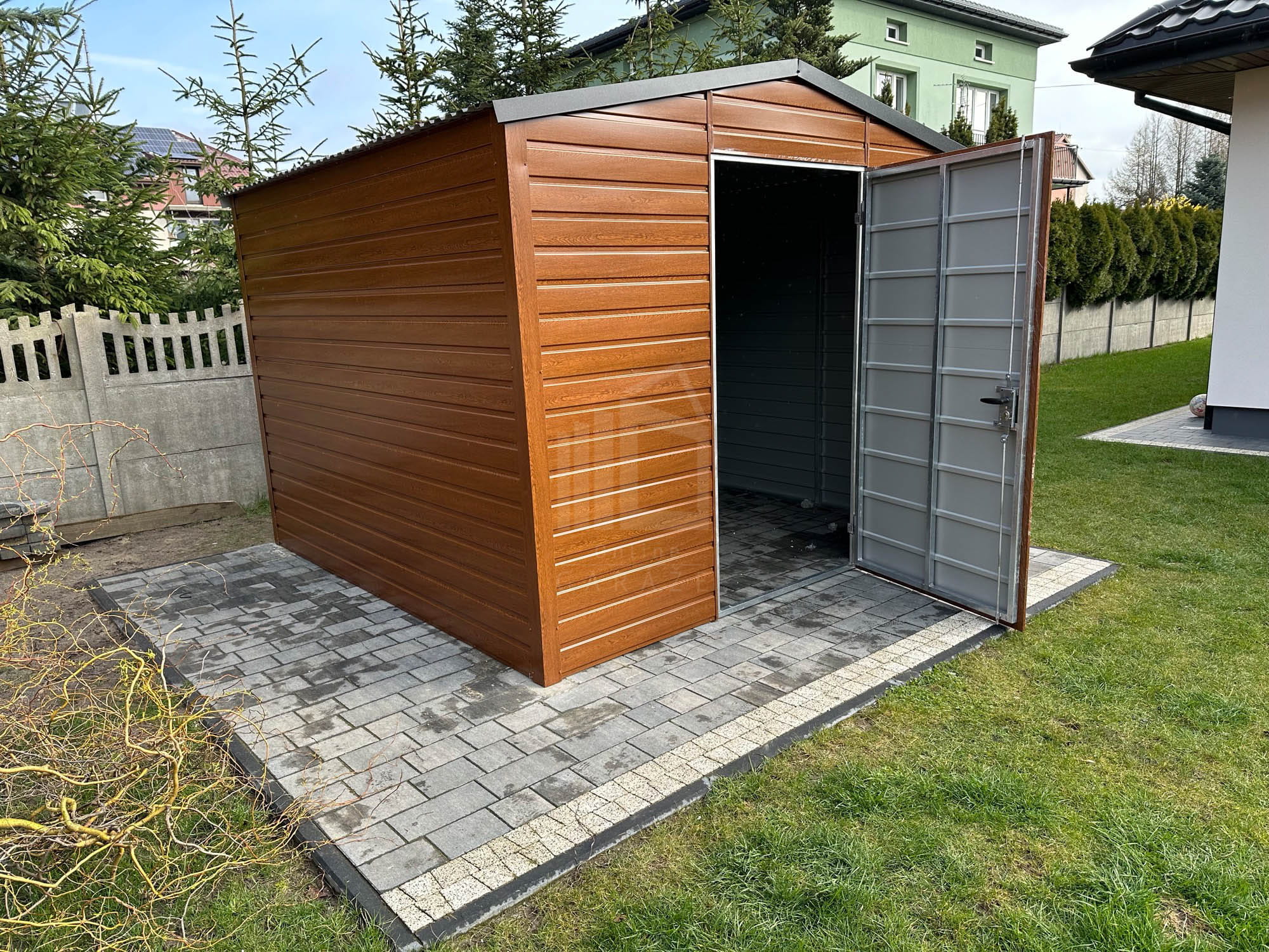 Záhradný domček 3×3 m – Strecha dvojspádová (sedlová) – Dvere – Orech svetlý – Imitácia dreva TS616