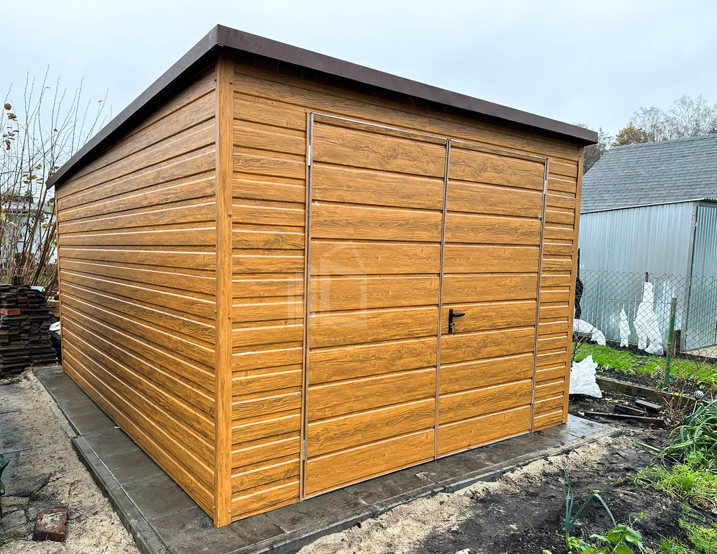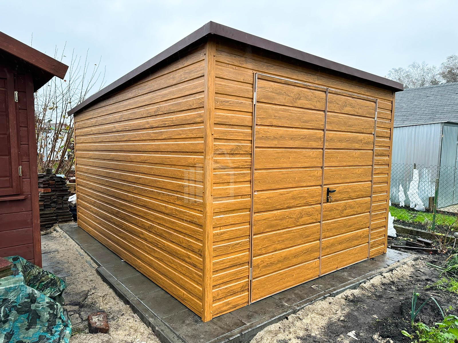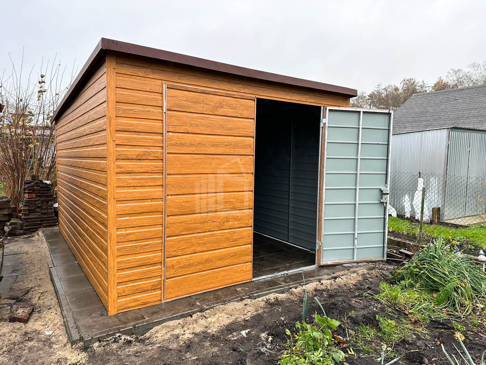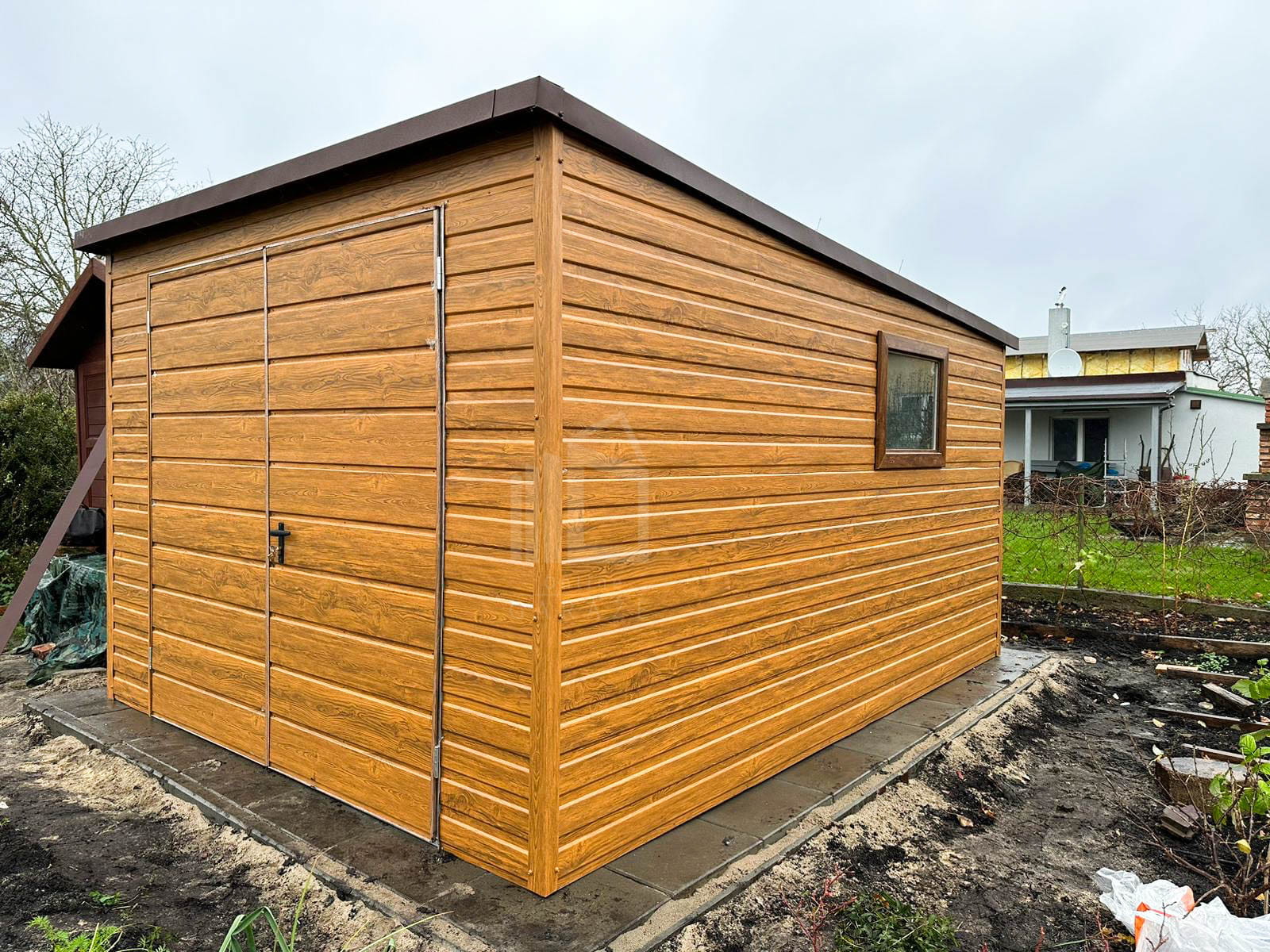 Záhradný domček 3×4 – dvojkrídlová brána – okno – svetlý orech – imitácia dreva – strecha spád dozadu TS529