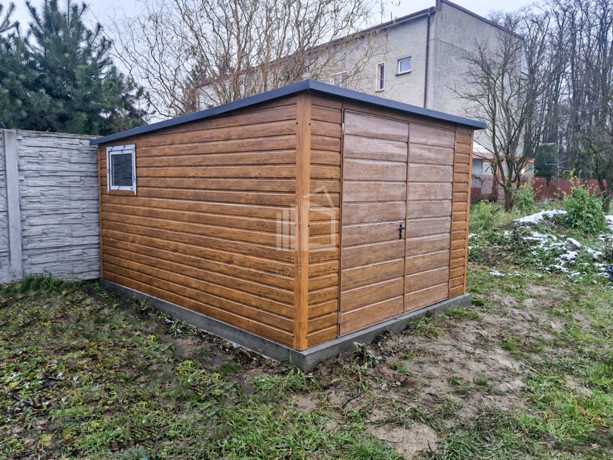 Záhradný domček 3×4 m – Dvojkrídlové dvere – okno – orech svetlý – imitácia dreva – strecha spád dozadu TS929