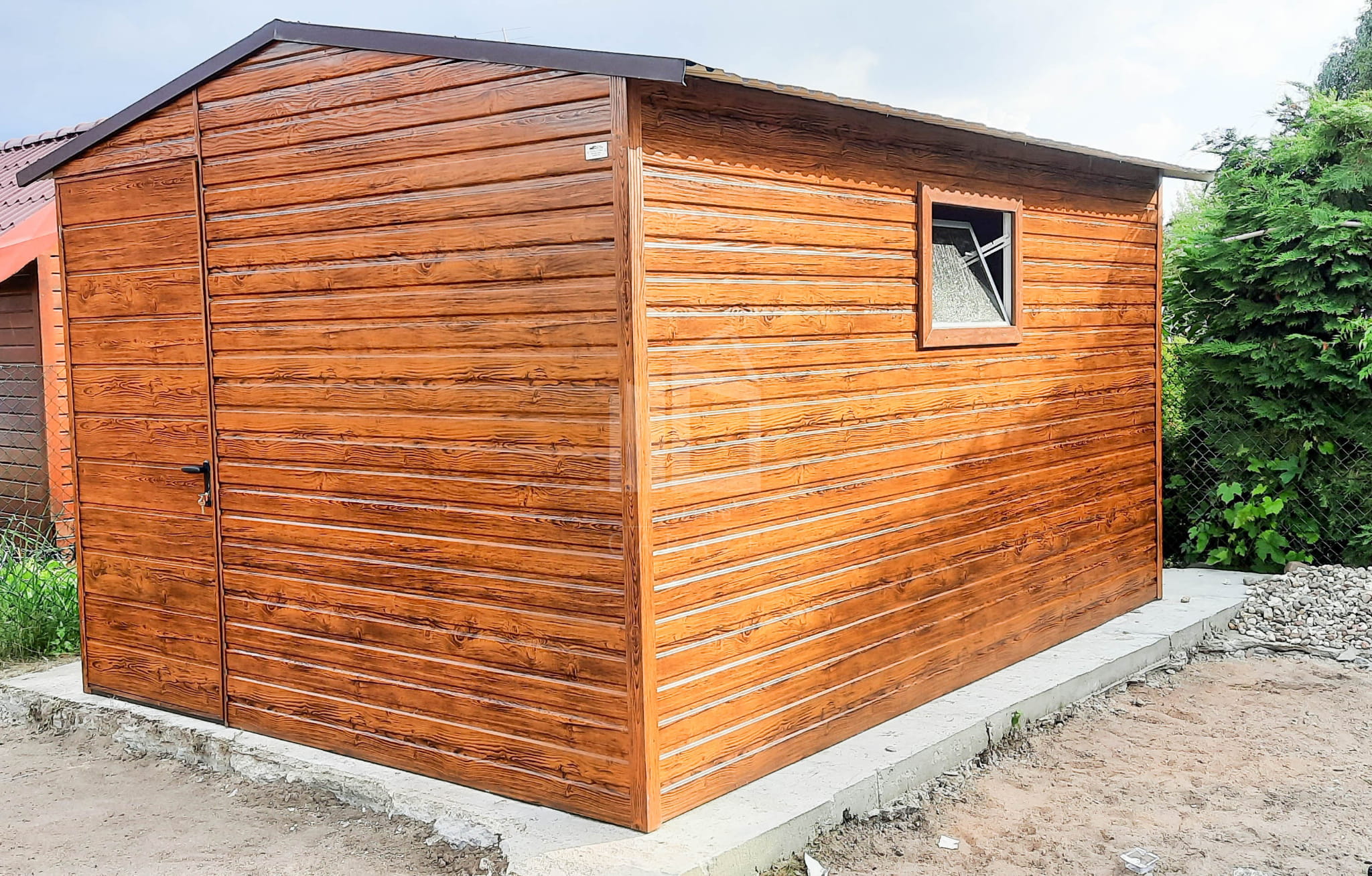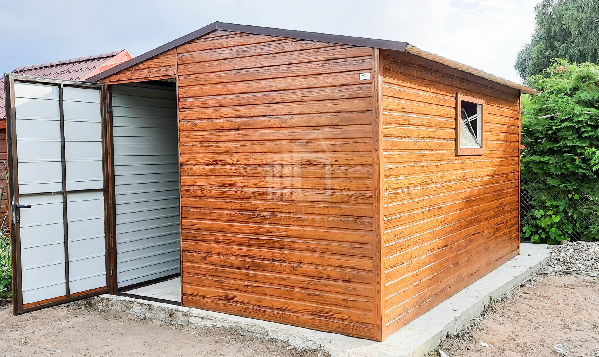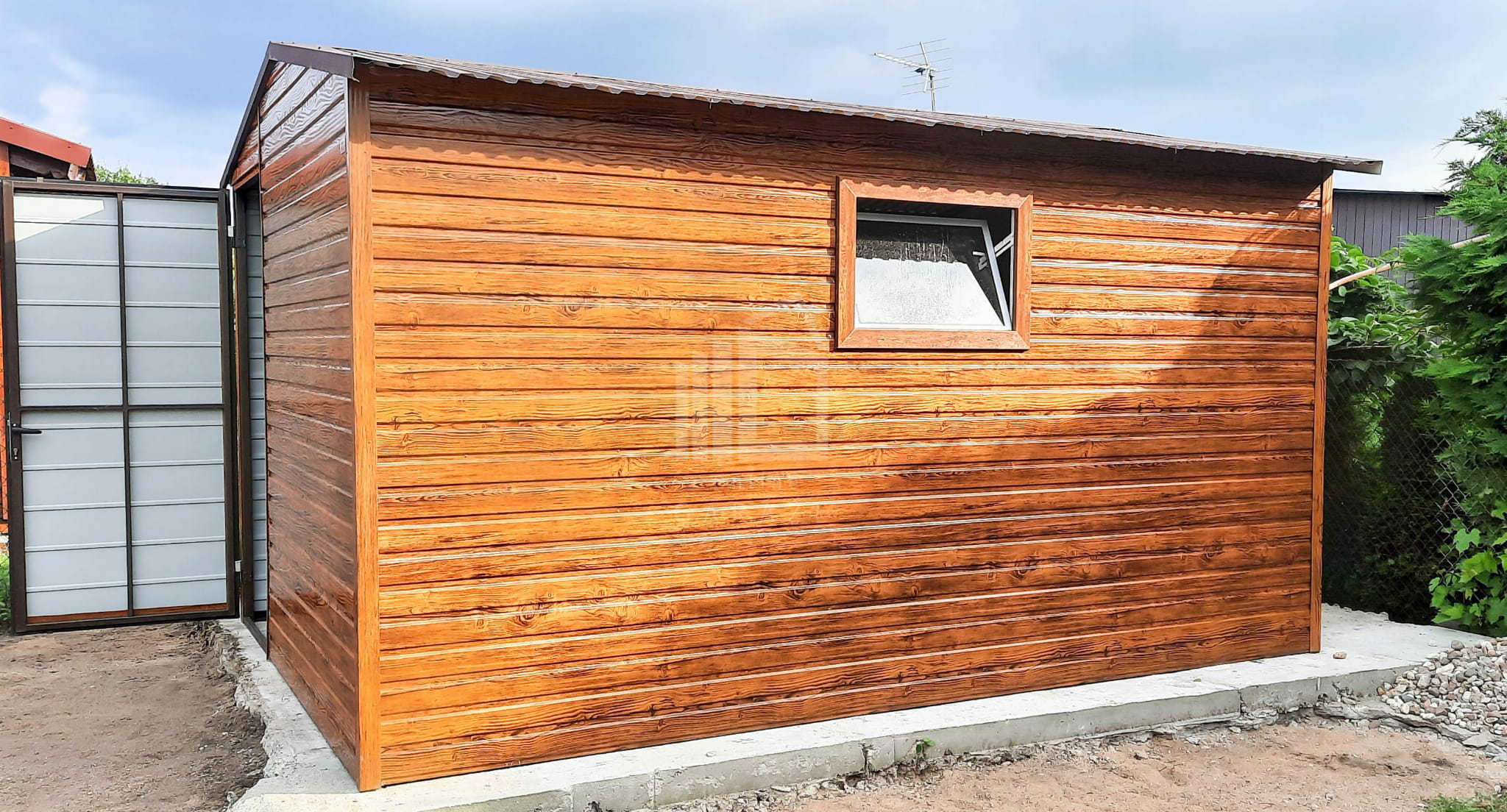 Záhradný domček 3x4m – Strecha dvojspádová (sedlová) – Dvere + okno – Imitácia dreva TS279 3×4