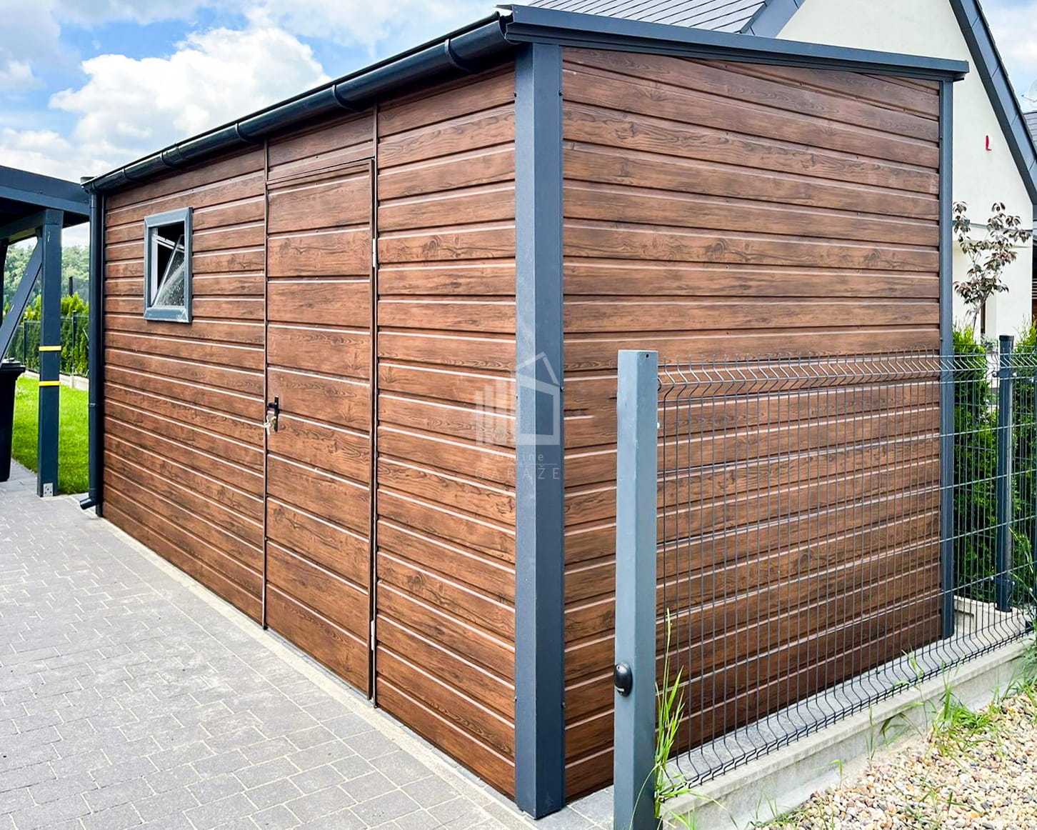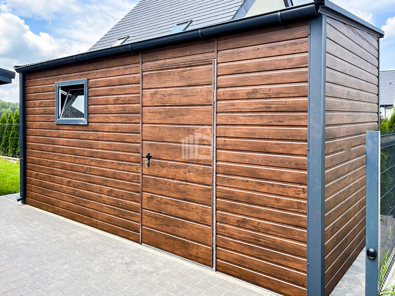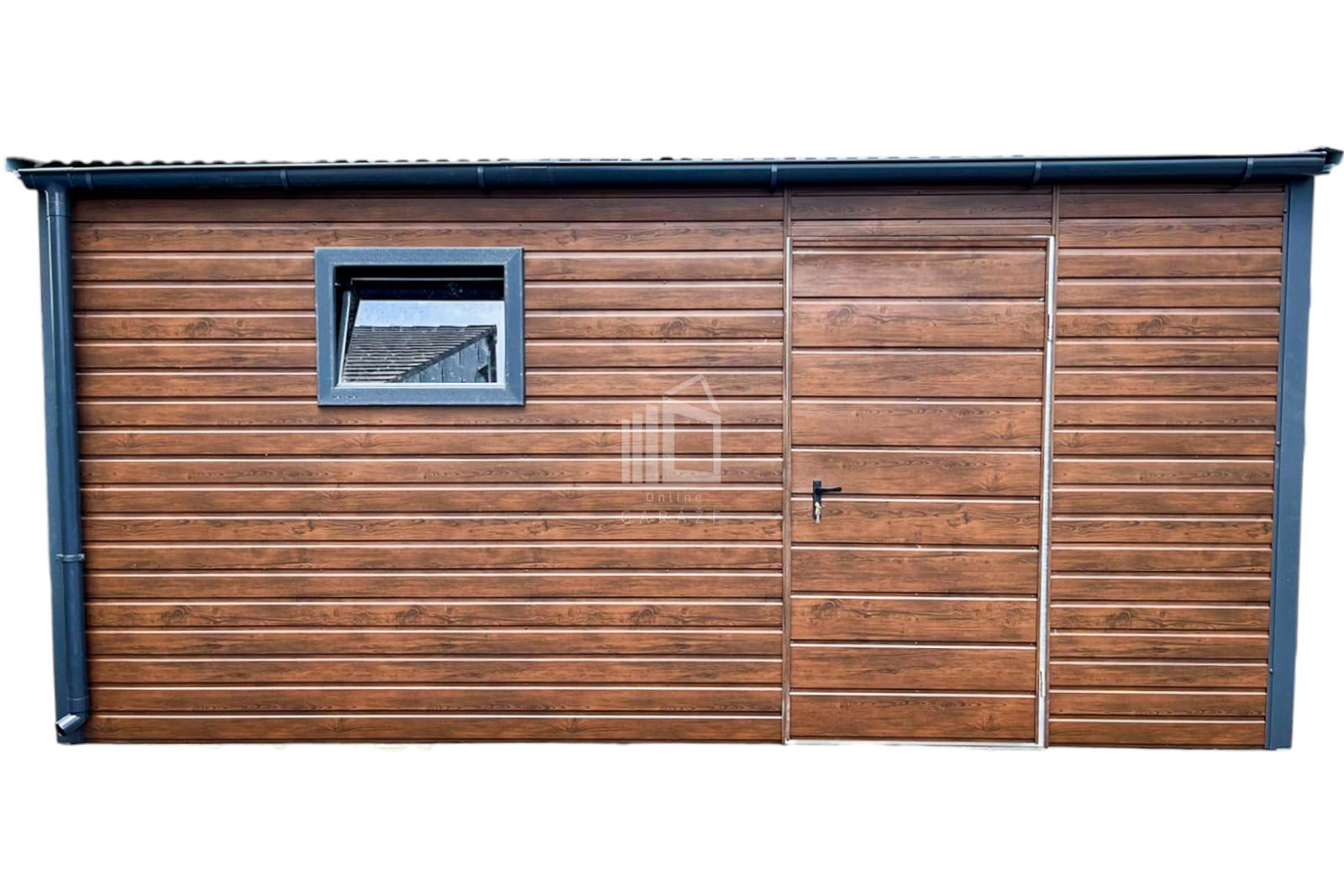 ZÁHRADNÝ DOMČEK 4,5x2m – Dvere – Okno – Tmavý orech – Imitácia dreva – Rýna okapová – Strecha spád dopredu TS890