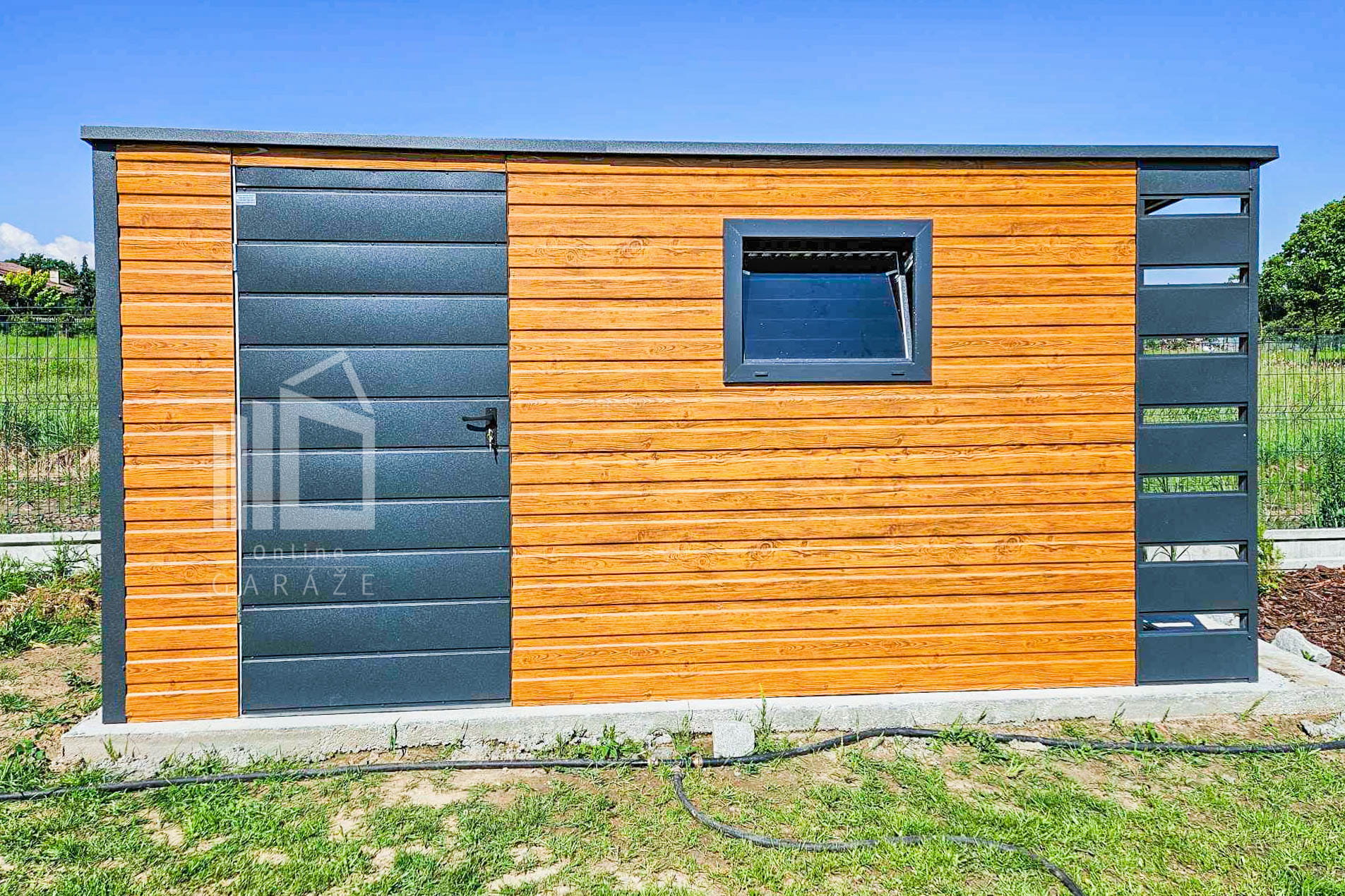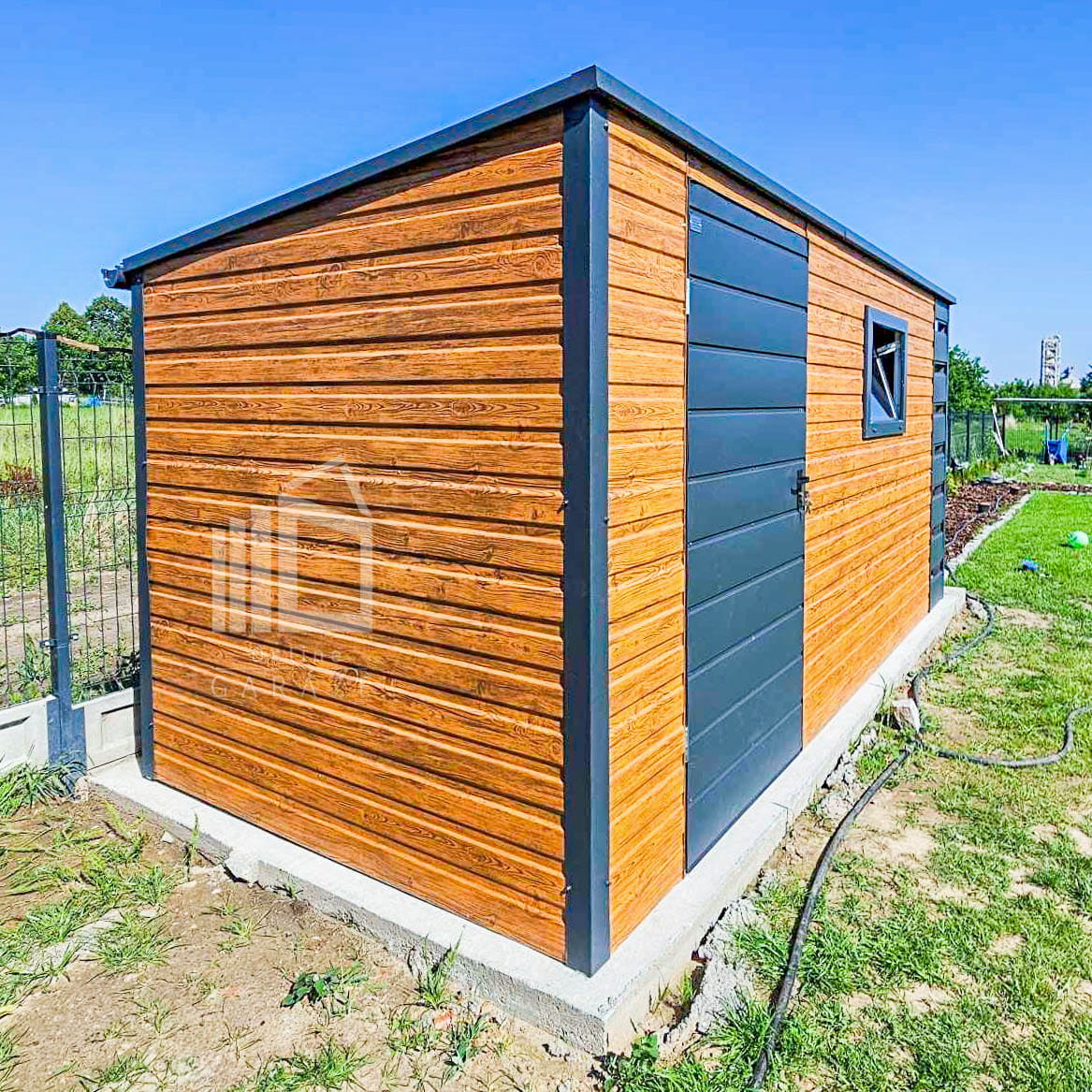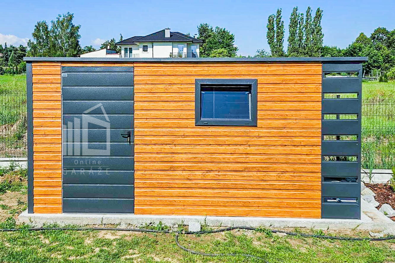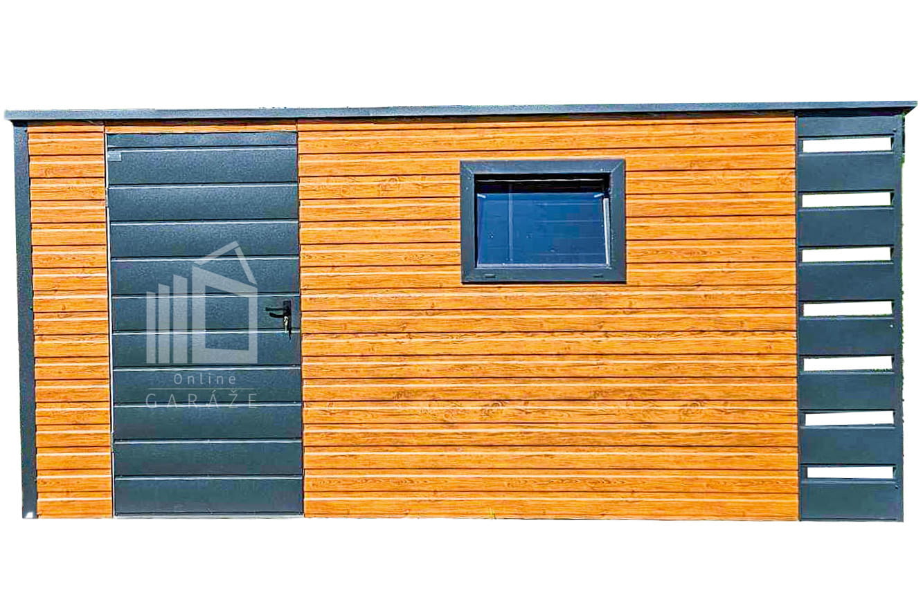 ZÁHRADNÝ DOMČEK 4x2m + Prístrešok 0,5m – Dvere – Okno – Svetlý orech – Antracit – Strecha spád dozadu TS745