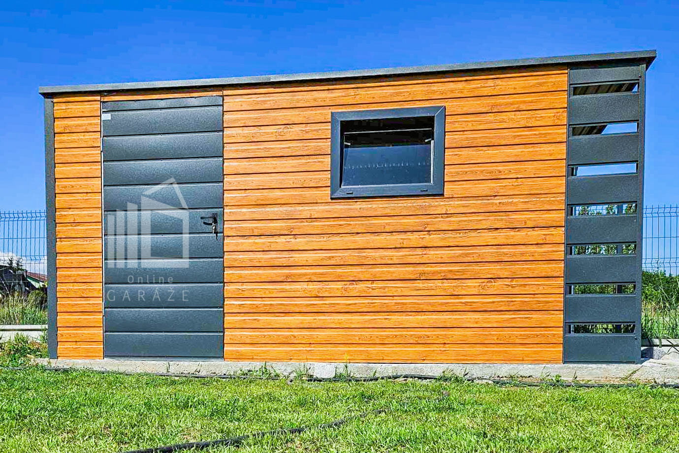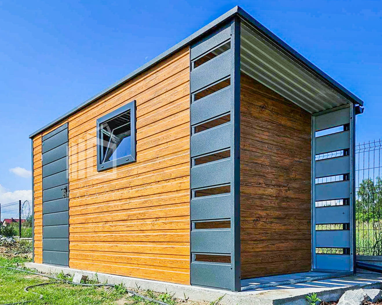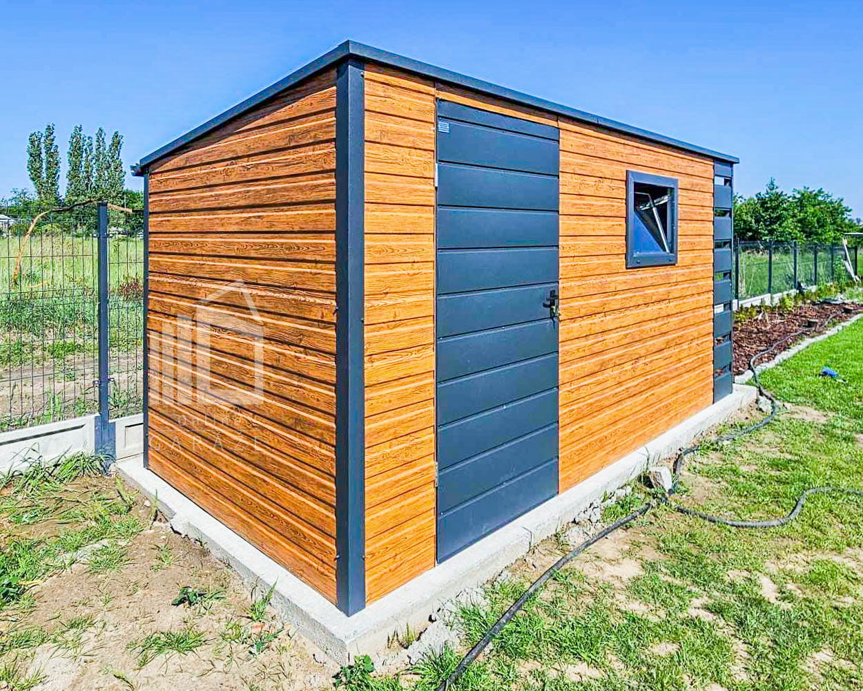 ZÁHRADNÝ DOMČEK 4x2m + Prístrešok 0,5m – Dvere – Okno – Svetlý orech – Antracit – Strecha spád dozadu TS745
