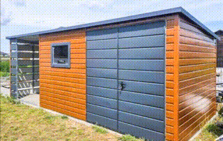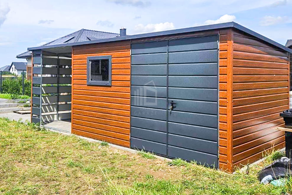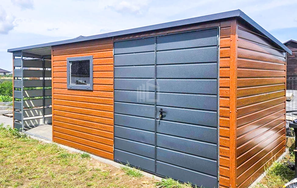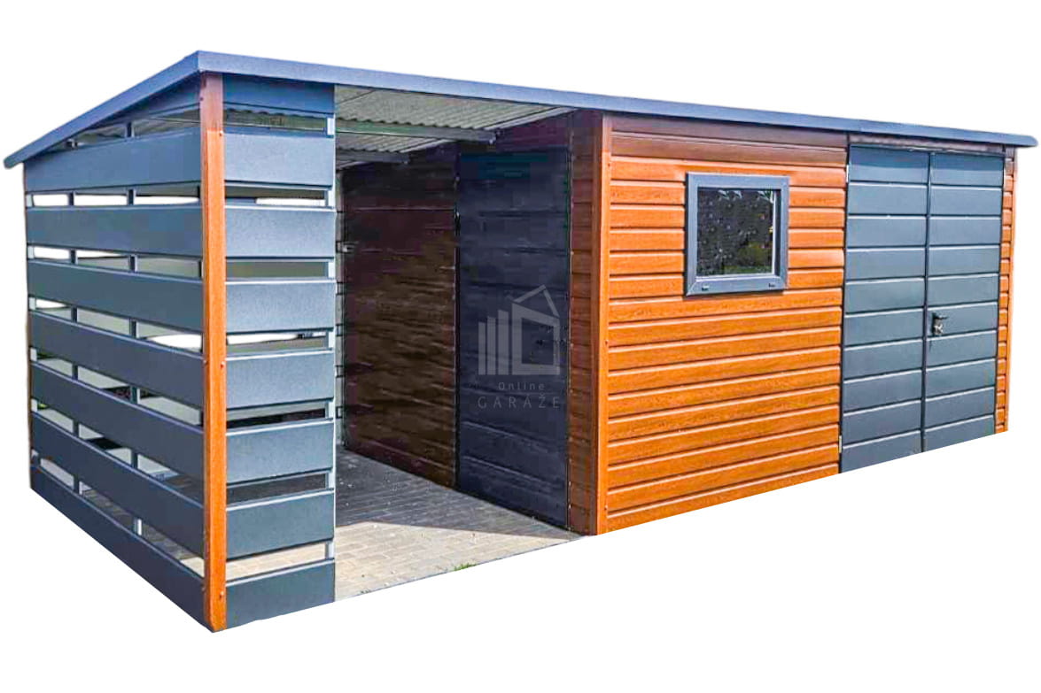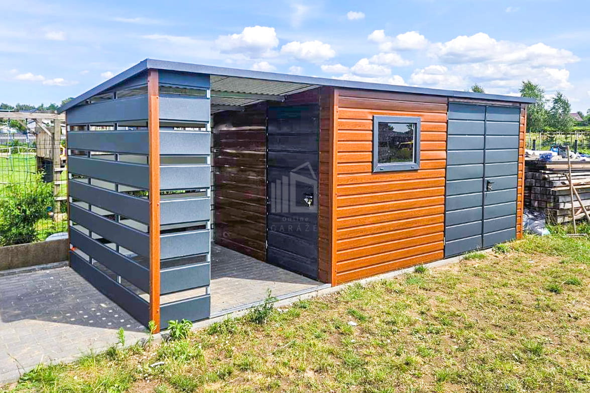 Záhradný domček 4×3 m + prístrešok 3×3 m – dvojkrídlové dvere – dvere – okno – orech svetlý – antracit – strecha spád dozadu TS750