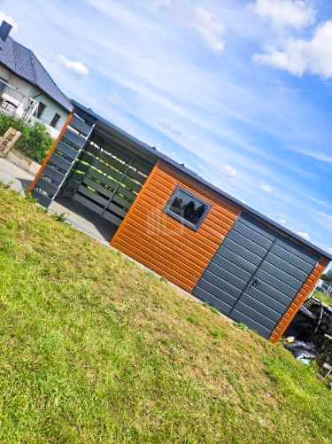 • prístrešok 3×3 m, zadná, bočná a časť prednej steny z vodorovných lamiel (panelov), farba antracit RAL 7016