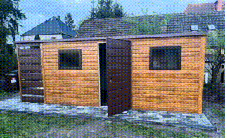 • prístrešok 1×2,5 m, predná stena – vodorovné lamely (panely)