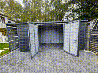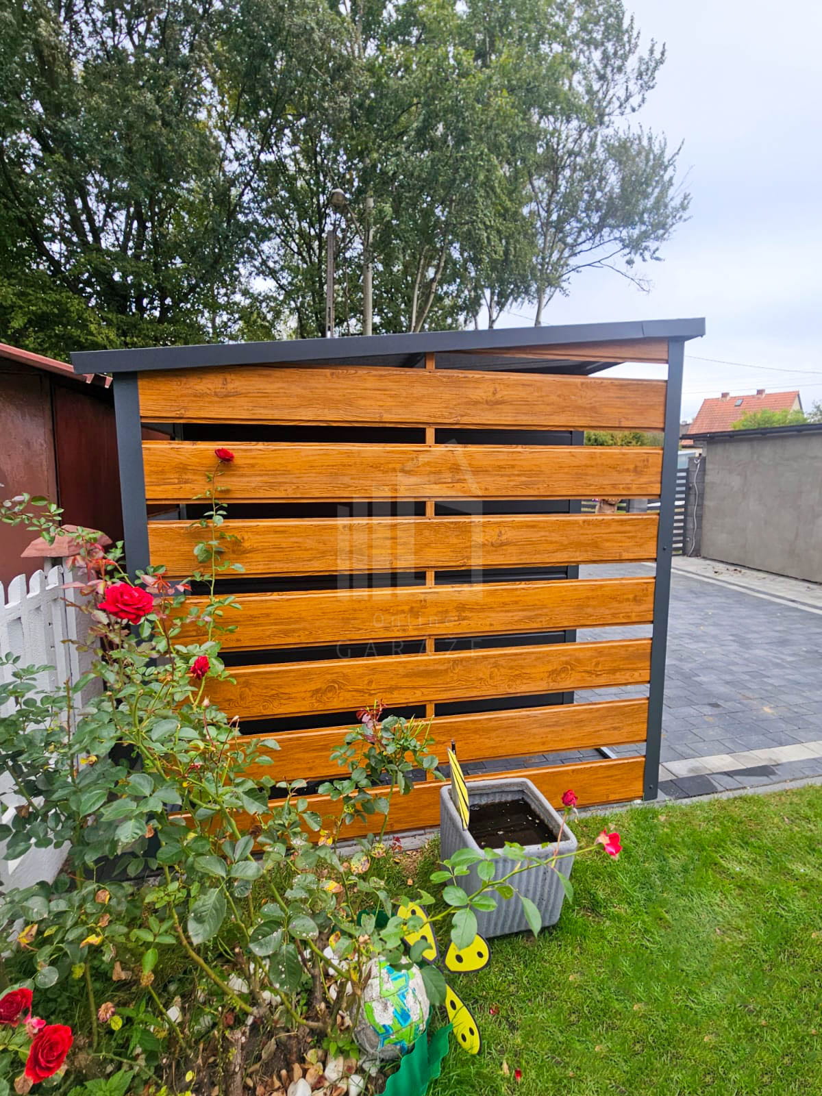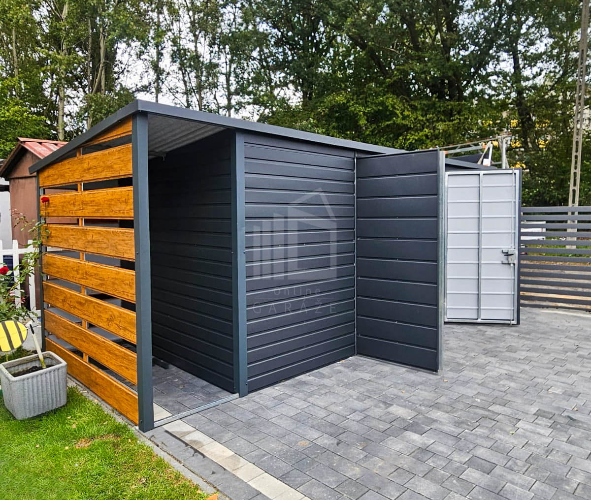 • prístrešok 0,8x2m, bočné aj zadná stena – vodorovné lamely (panely) v farbe zlatý dub